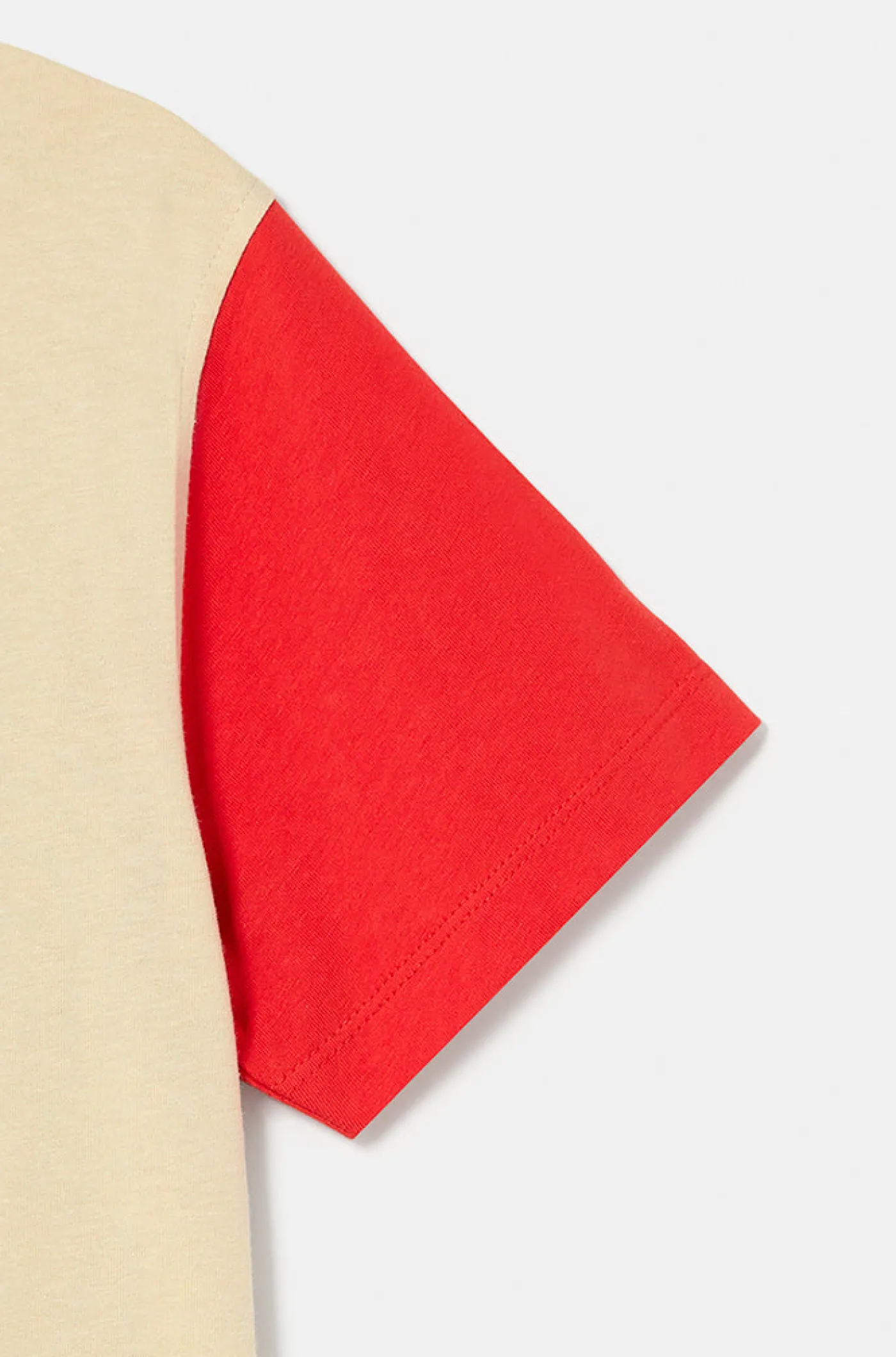 Camiseta del FC Barelona beig para niños y niñas con dibujo de un balón jugando a futbol en la parte frontal y el escudo del FC Barcelona en la parte trasera. Cuello redondo. Manga corta. Color: beig y rojo.