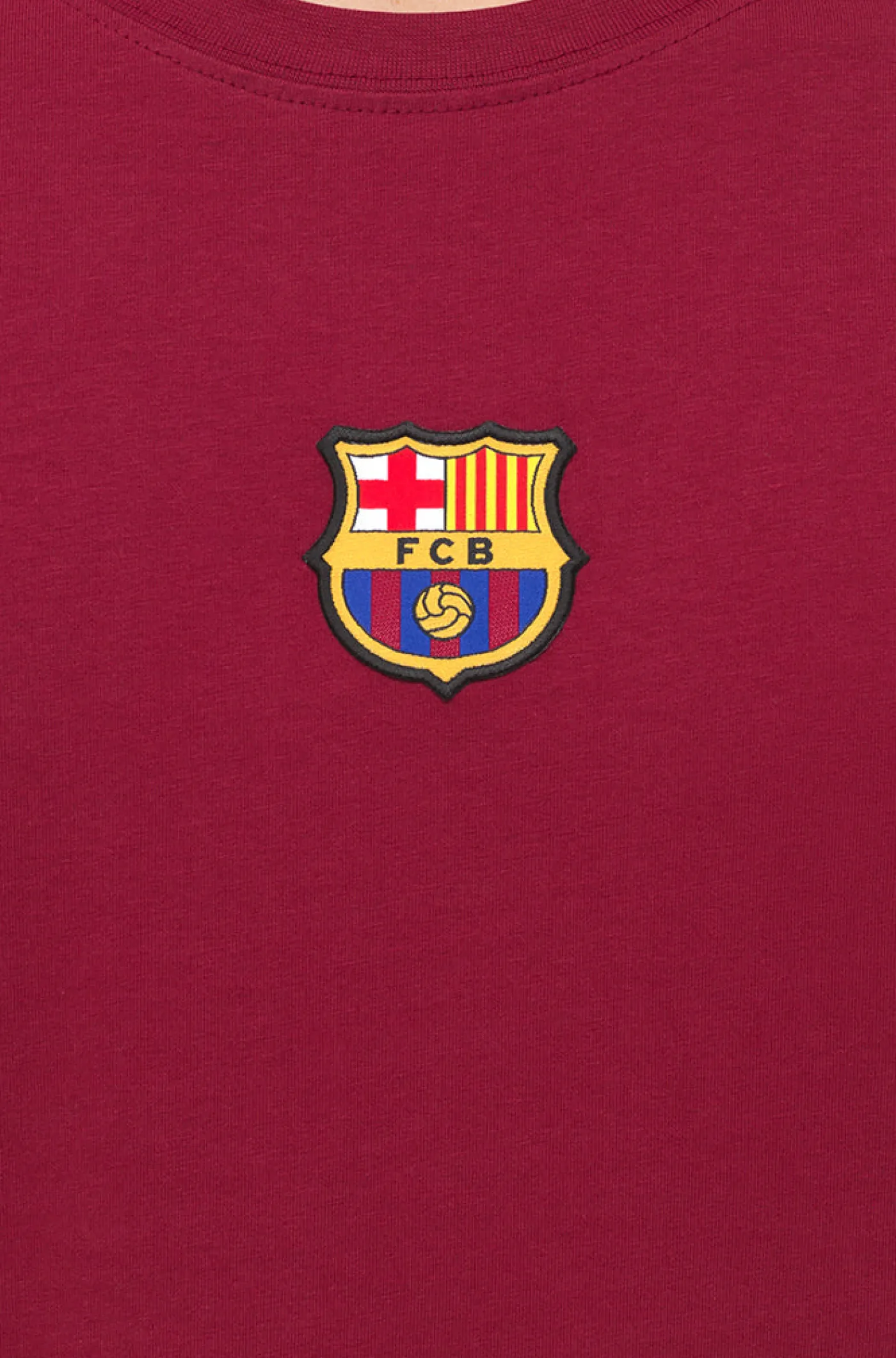 Camiseta con el parche del escudo del FC Barcelona centrado en el pecho. Su tejido de algodón la hace una prenda cómoda y ligera. Cuello redondo. Manga corta con bandas decoradas con las figuras del escudo del FC Barcelona. Color: Granate.