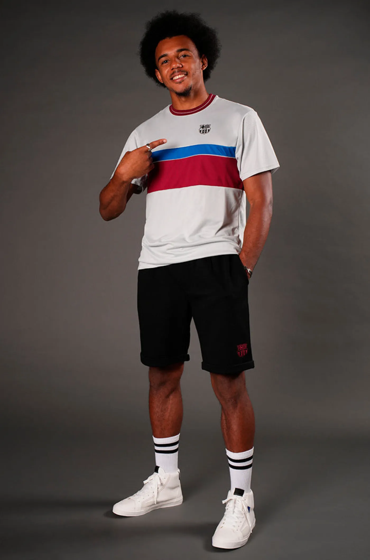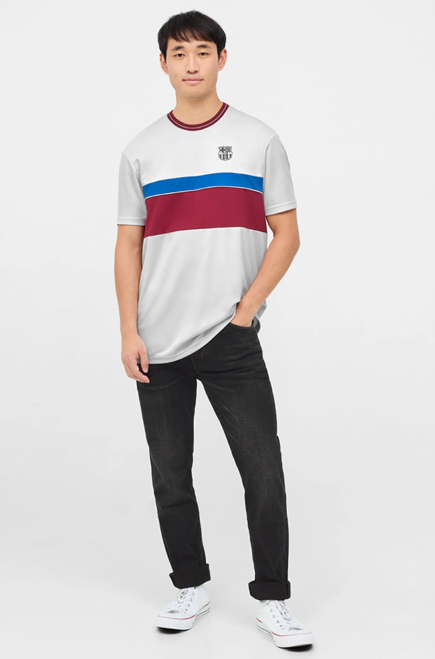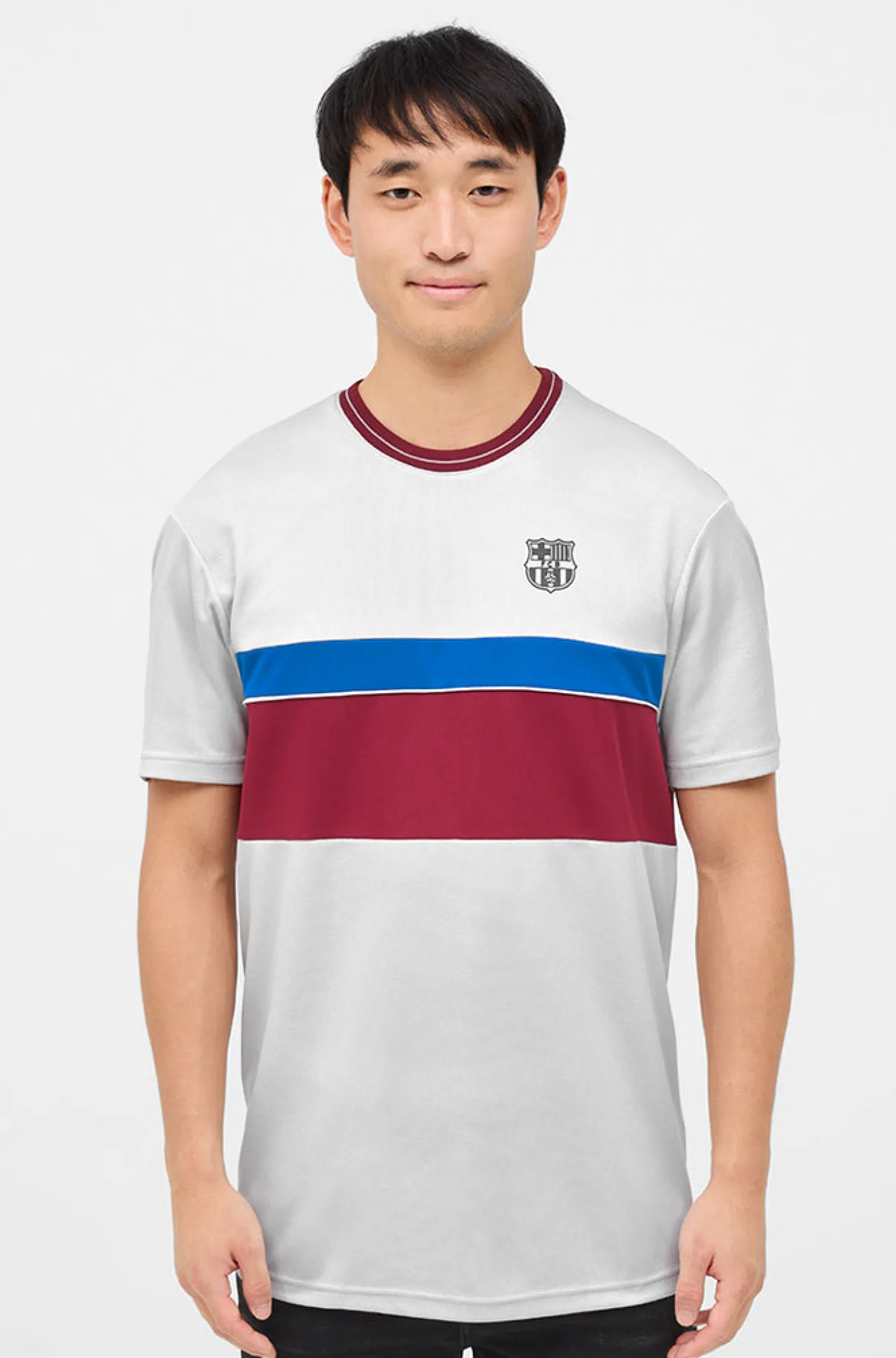 Camiseta de la colección Urban del FC Barcelona. Detalle del escudo en relieve del FC Barcelona en la parte del pecho a contraste. Cuello redondo. Manga corta. Color: Gris, grana y azul.