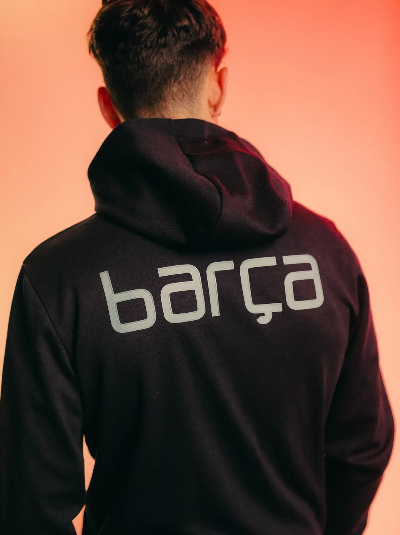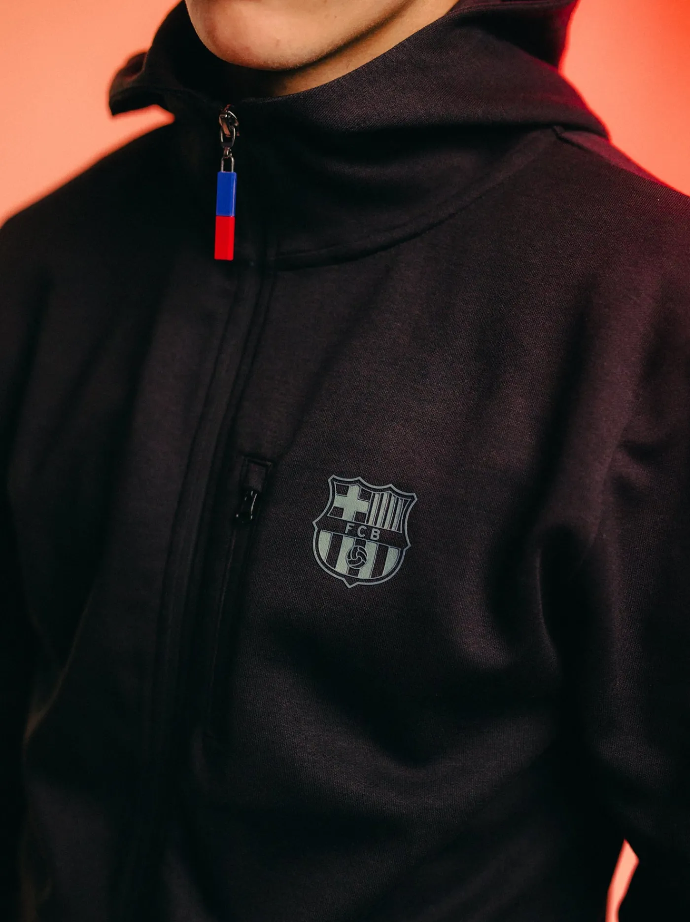 Chaqeta negra de manga larga con capucha. Escudo estampado en el lado izquierdo y detalle blaugrana en la manga derecha. Texto «BARÇA» estampado a contraste en la parte trasera.