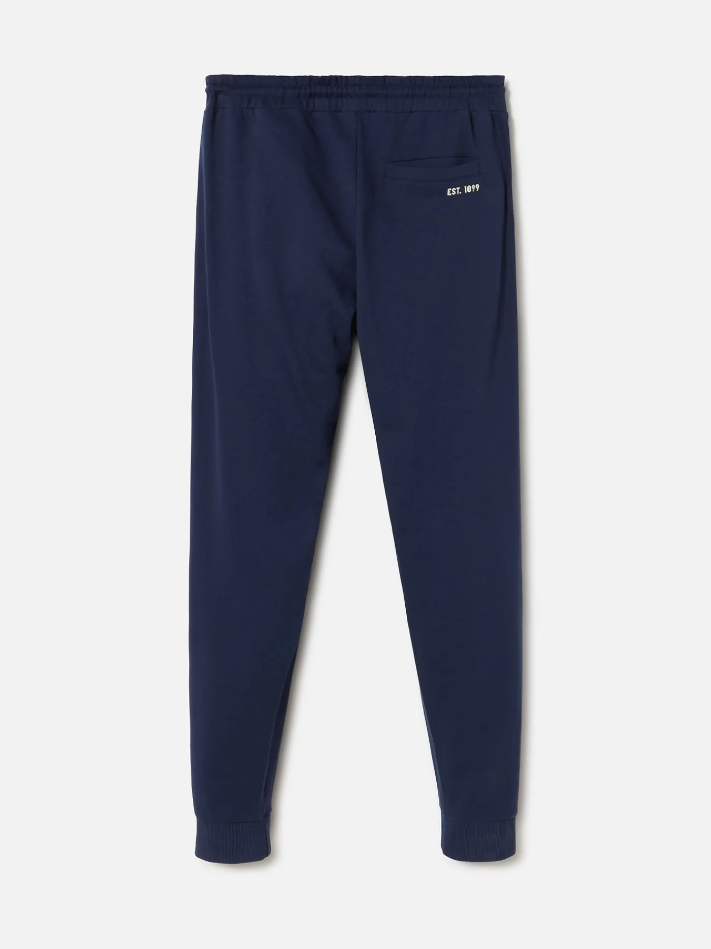 Pantalón largo de chándal azul marino. Con cordones ajustables. Escudo Barça en el lateral izquierdo. Cintura y bajos elásticos.