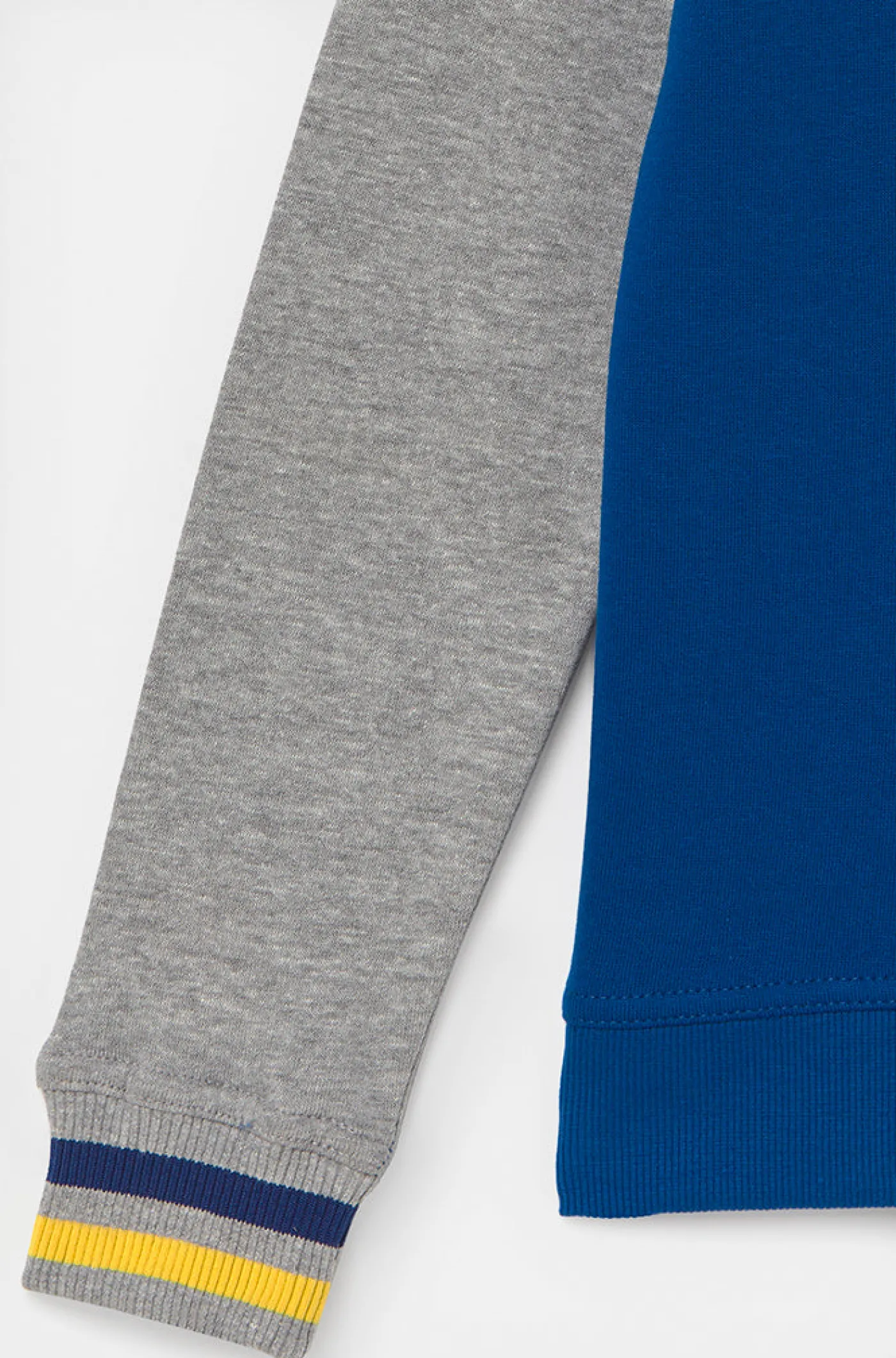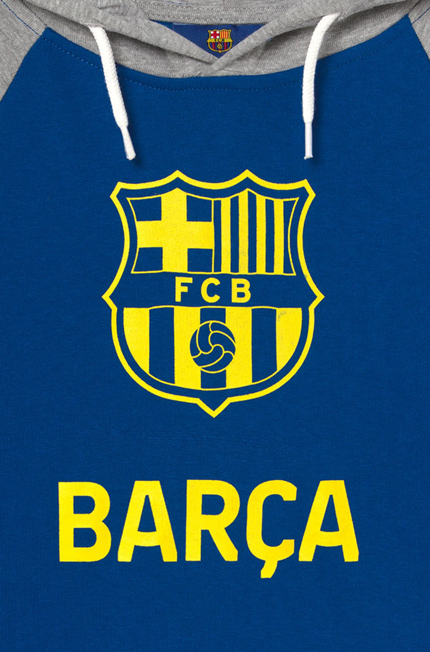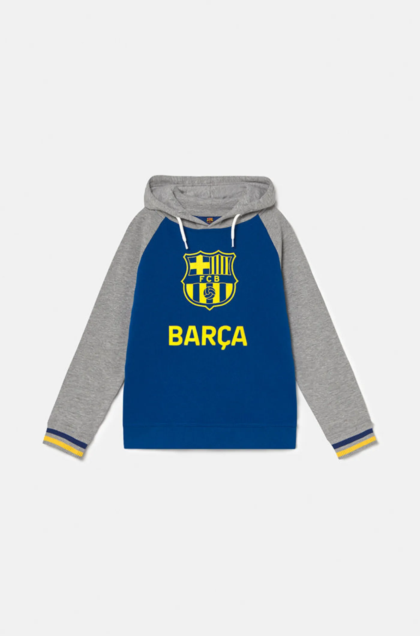 Sudadera niño con capucha y escudo a contraste del FC Barcelona. Detalle con puños a rayas. Interior de felpa ligera. Cuello redondo. Manga larga. Cintura y puños elásticos. Color: Gris jaspeado, azul y amarillo
