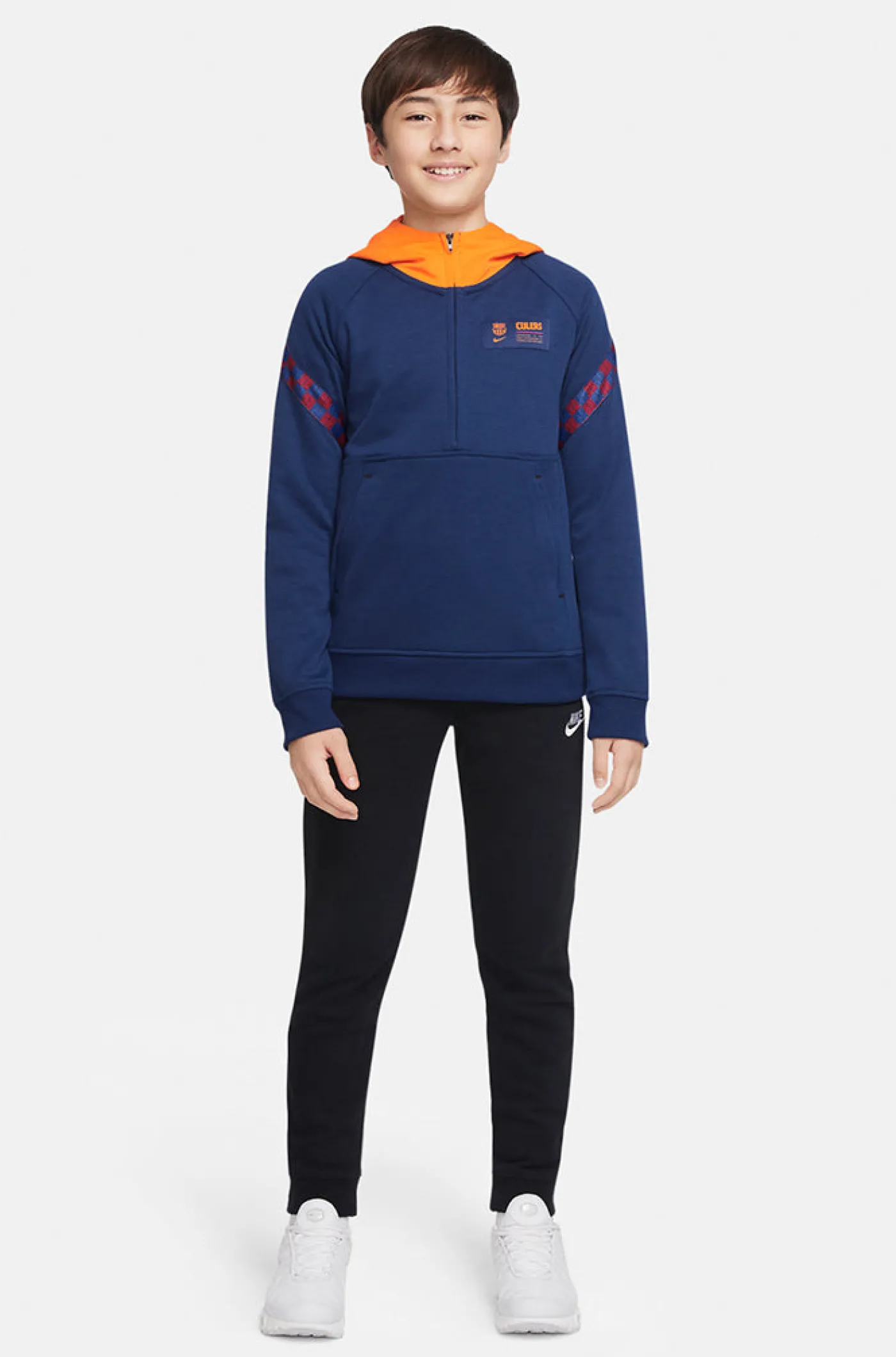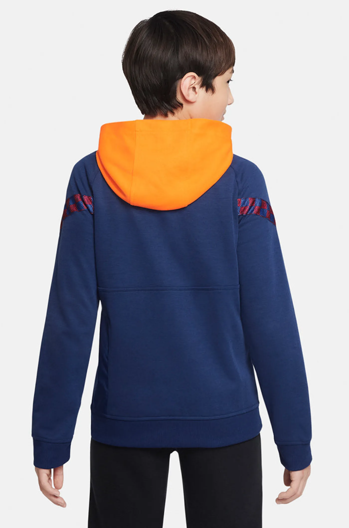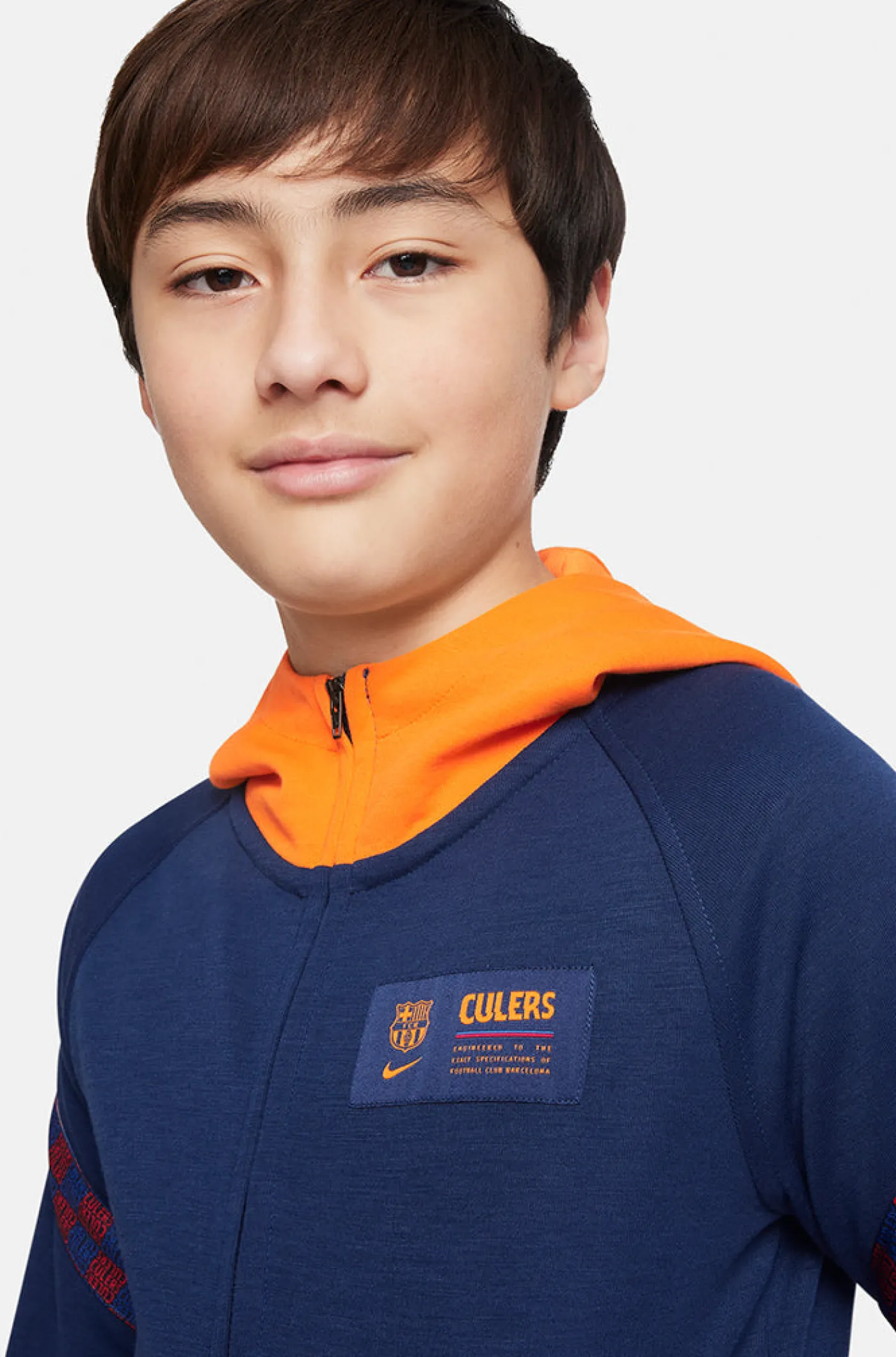Sudadera con capucha con parche del escudo del FC Barcelona y el logo de Nike bordado a contraste en el pecho. Sudadera con 2 franjas diagonales color azulgrana en ambas mangas con la rotulación de “Culers”. Manga larga. Cuello alto con cremallera y cordones ajustables. Tanto los puños como la cintura cuentan con un acabado en punto elástico de canalé. Bolsillo canguro con cremallera y 2 bolsillos laterales invisibles. Tecnología Dri-FIT de Nike. Color: azul marino y naranja