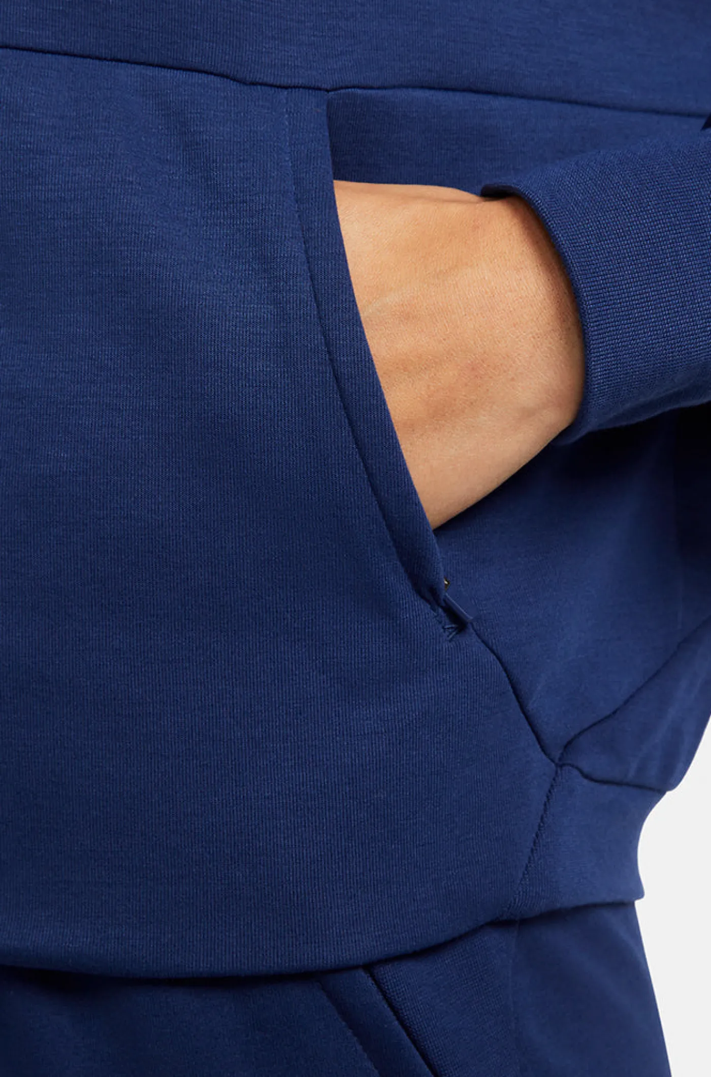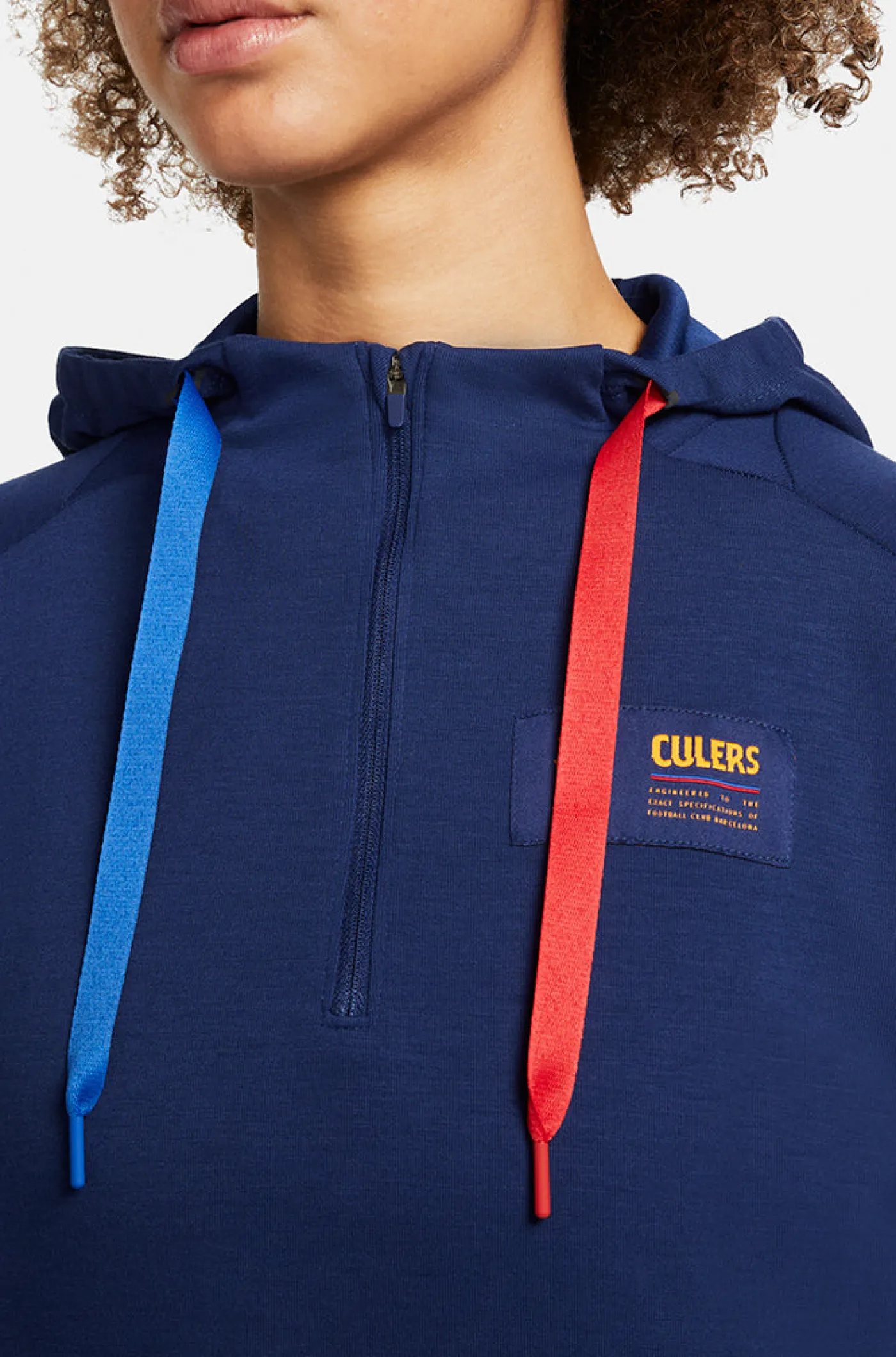 Sudadera con capucha para mujer con el parche del escudo del FC Barcelona y el logo de Nike bordado en el pecho. Detalle bordado con la rotulación de “Culers” en la parte posterior de la cintura. Manga larga. Cuello alto con cremallera y cordones ajustables. Puños elásticos con ojal invisible para el pulgar. Bolsillo canguro con cremalleras invisibles. Color: azul marino.