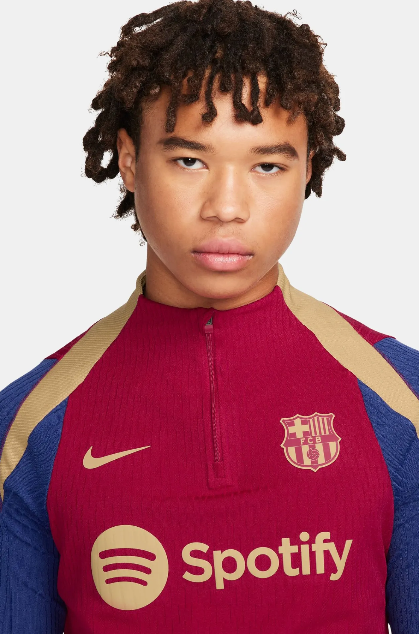 Sudadera de entrenamiento edición jugador con el escudo del FC Barcelona y el logo de Nike. Cuello alto con cierre de cremallera. Manga larga con agujero invisible para el pulgar. Bajo de corte asimétrico. Su tecnología Nike Dri-FIT ADV cuenta con tejido elástico y de secado rápido para evitar rozaduras y combatir la humedad. Color: azul intenso y granate.