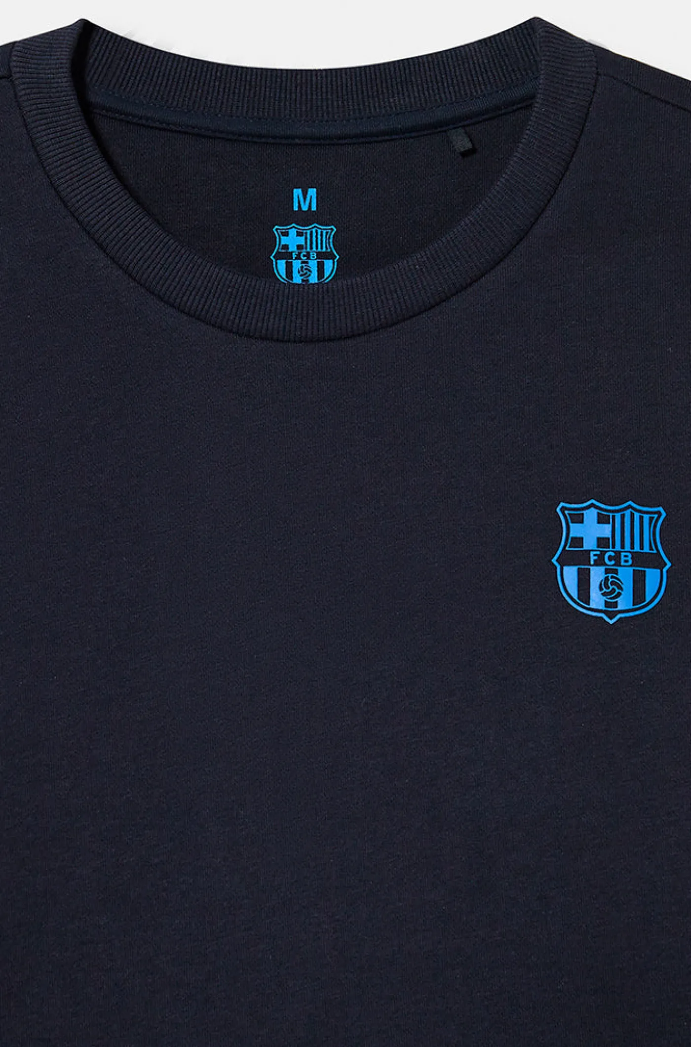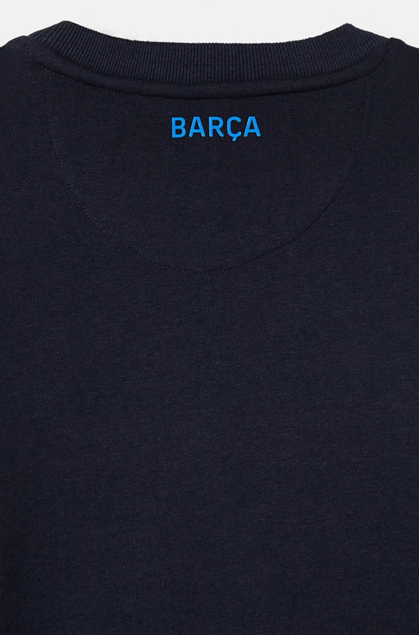 Sudadera con el escudo del FC Barcelona en relive y a contraste en el pecho y lettering «BARÇA» en la parte trasera. Detalle azul y rojo en ambas mangas. Cuello redondo. Manga larga. Tanto los puños como la cintura cuentan con un acabado en punto elástico de canalé. Color: azul marino.