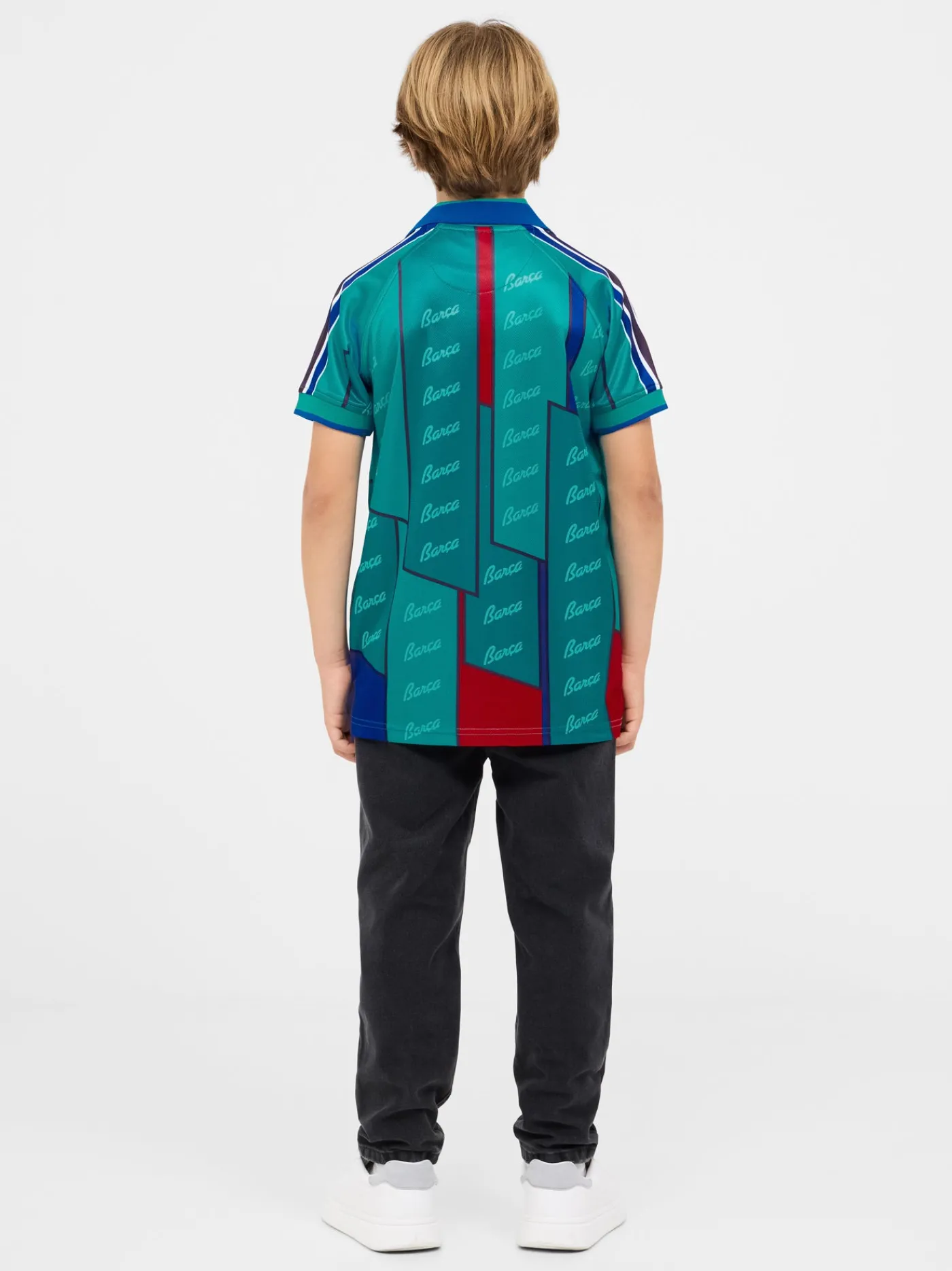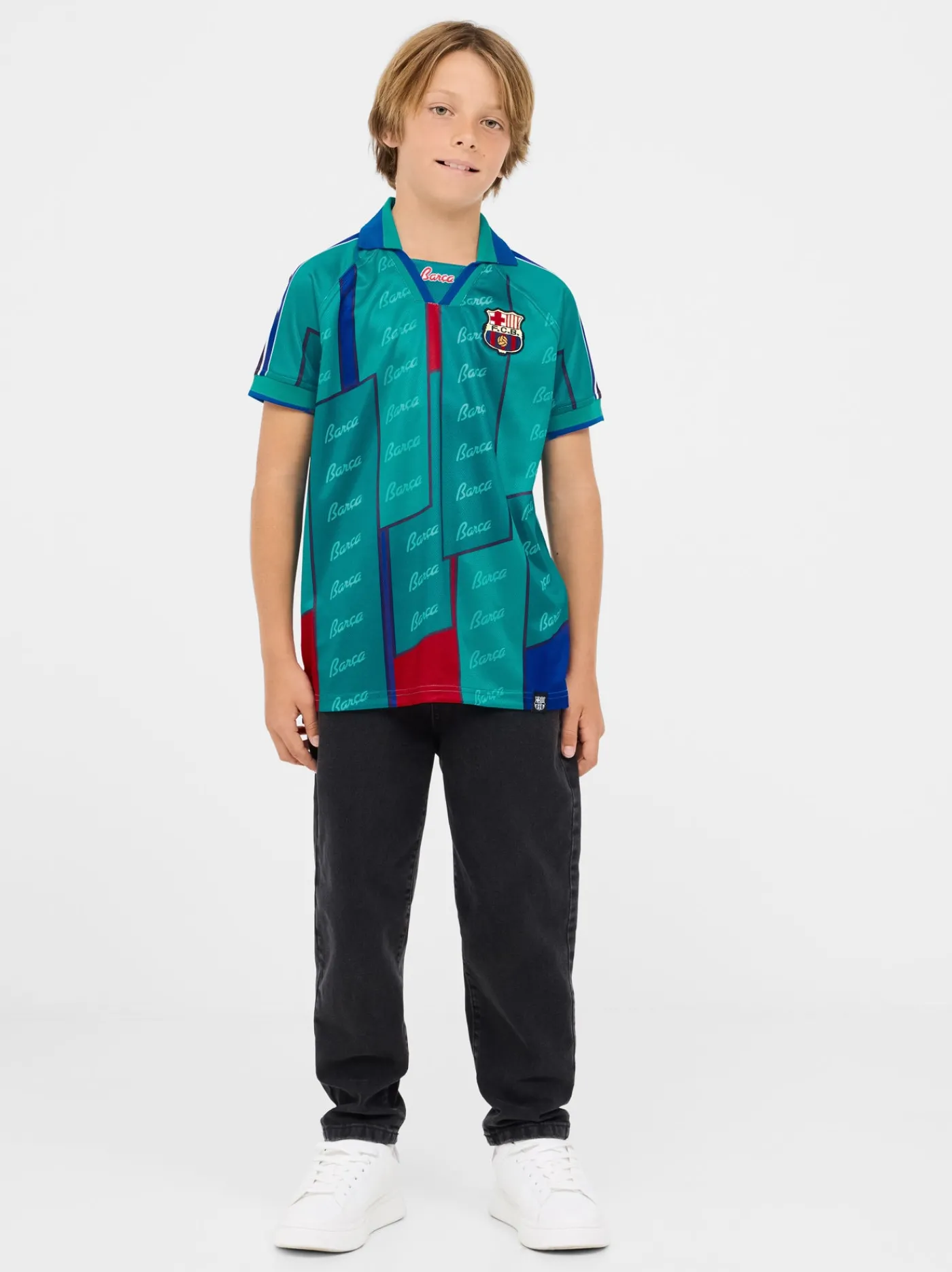 Réplica de la camiseta de la equipación del FC Barcelona en las temporadas 1995-97. Siguiendo el mismo patrón y buscando los tejidos más similares posibles a la original. Cuello con solapa. Manga corta. Color: Azul turquesa.
