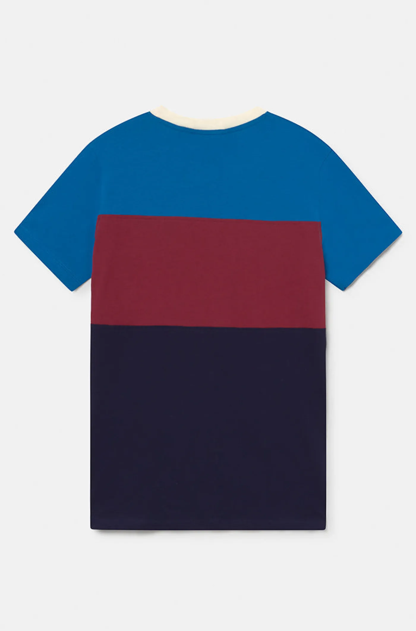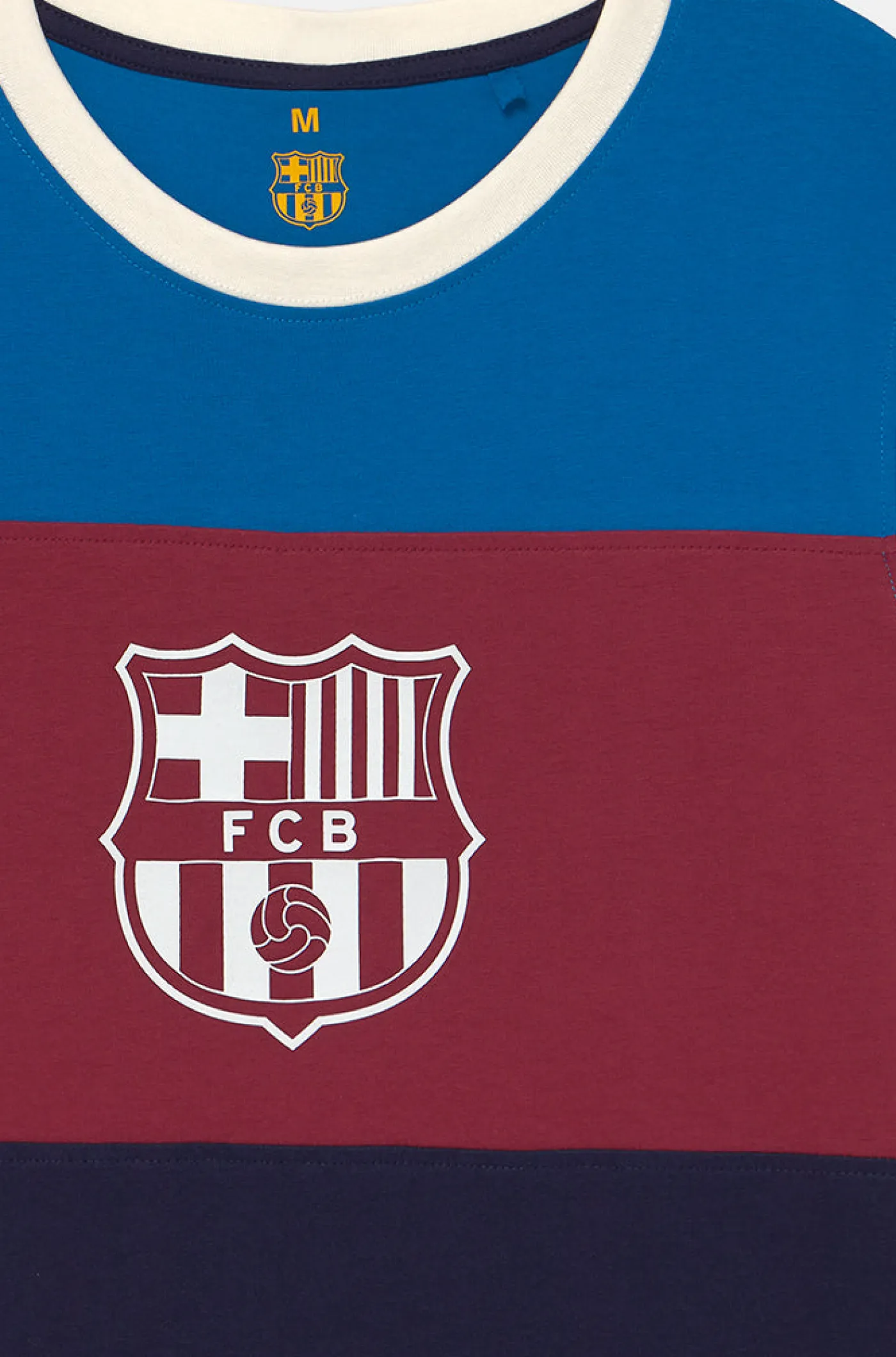 Camiseta tricolor con el escudo del FC Barcelona en relieve. Su tejido de algodón la hace una prenda cómoda y ligera. Cuello redondo. Manga corta. Color: azulgrana y marino.