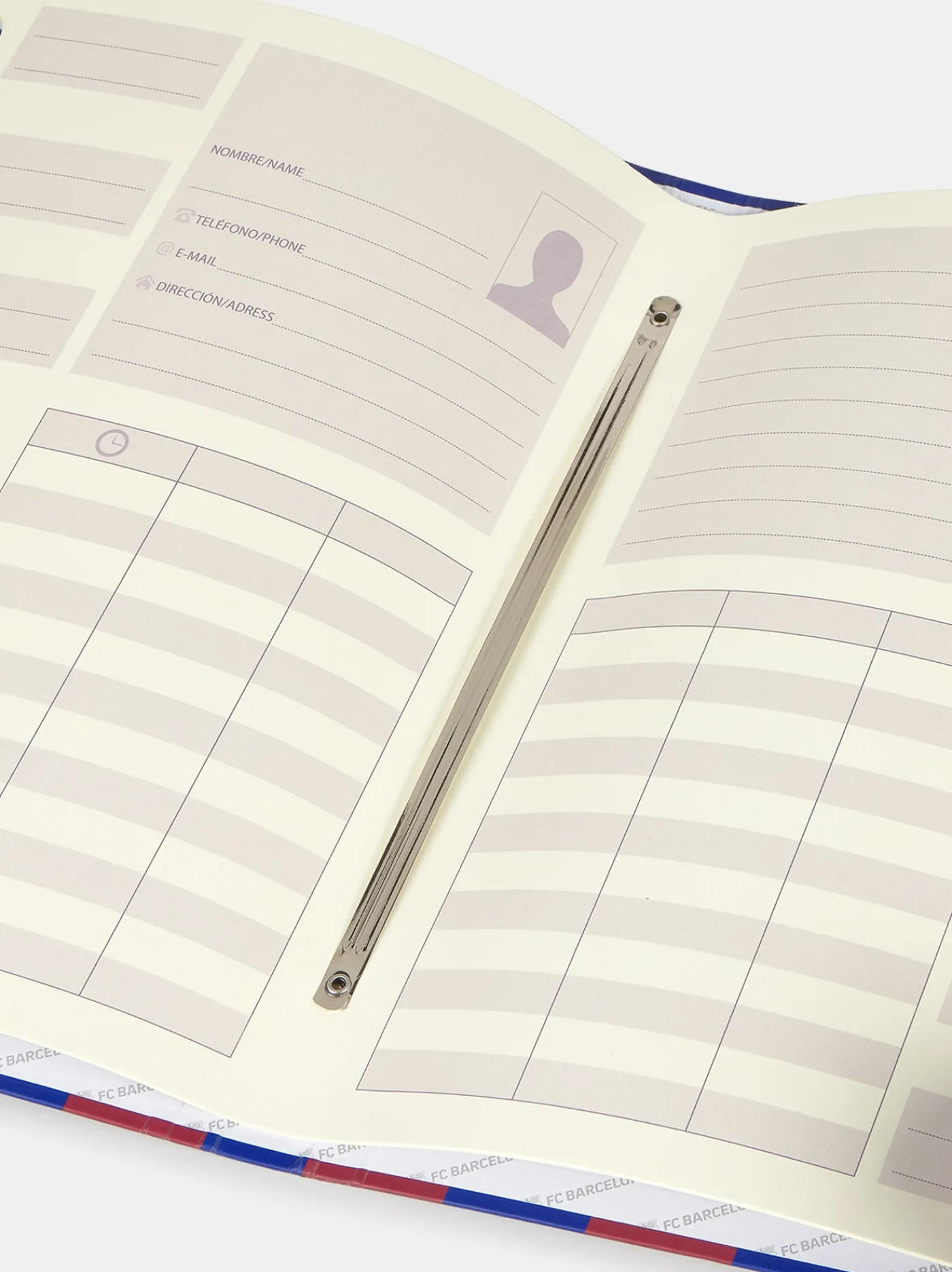 Diseño blaugrana con escudo del FC Bareclona. Tapa dura y cierre con gomas elásticas.