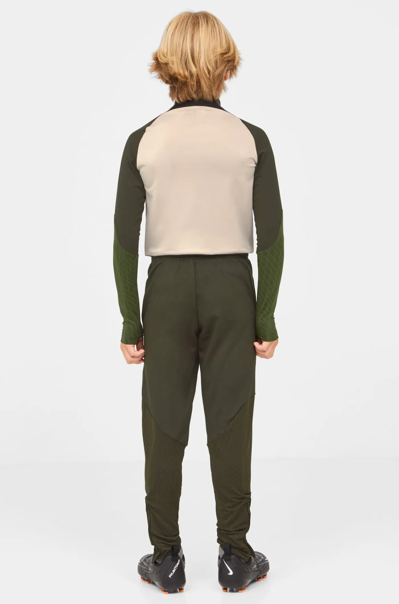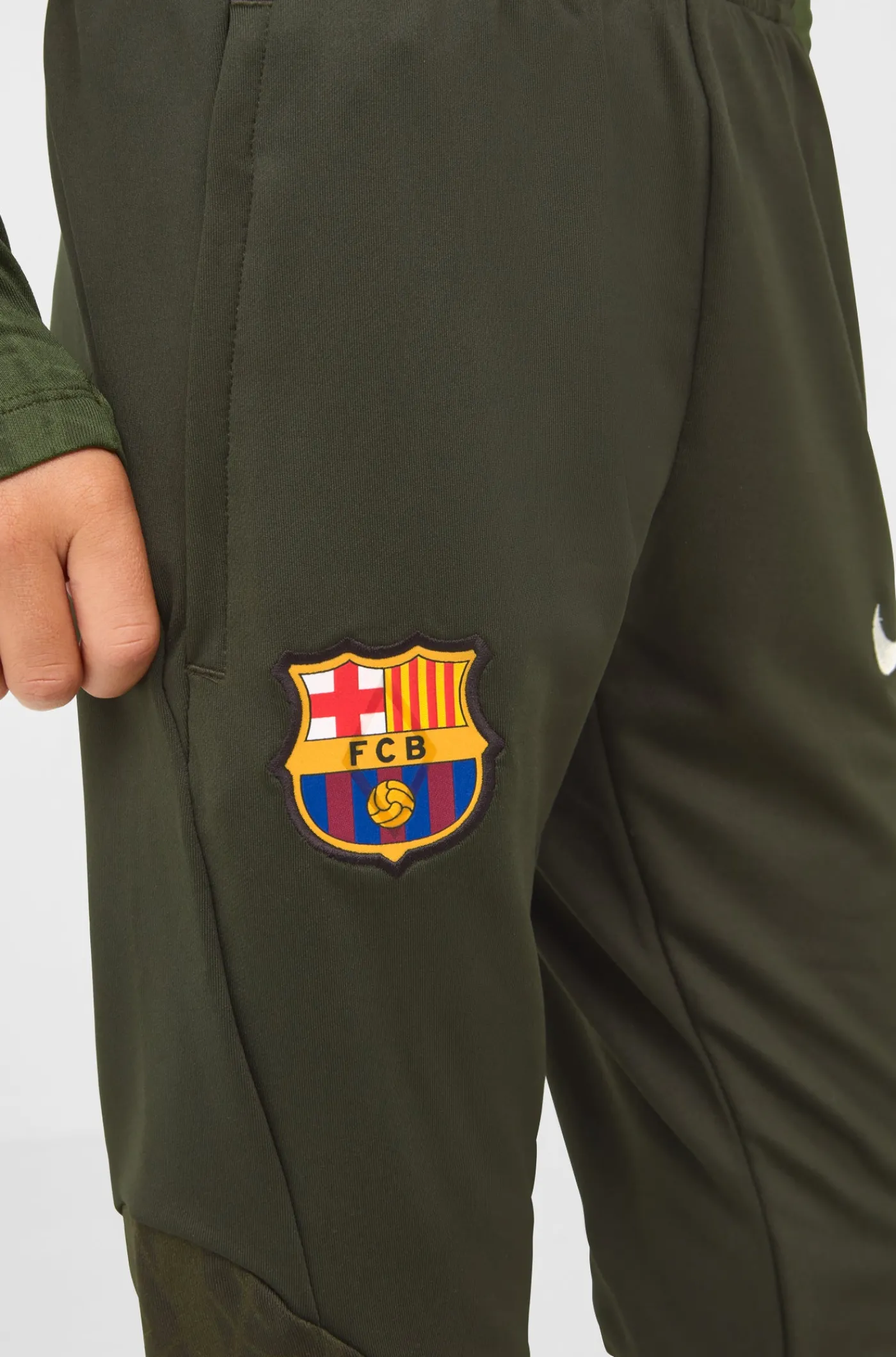 Pantalón de entrenamiento para niños de 6 a 14 años con el parche del FC Barcelona y logo de Nike. Cintura elástica con cordones. Bajos con cremalleras laterales. Paneles de ventilación. Tecnología Nike Dri-FIT. Color: verde.
