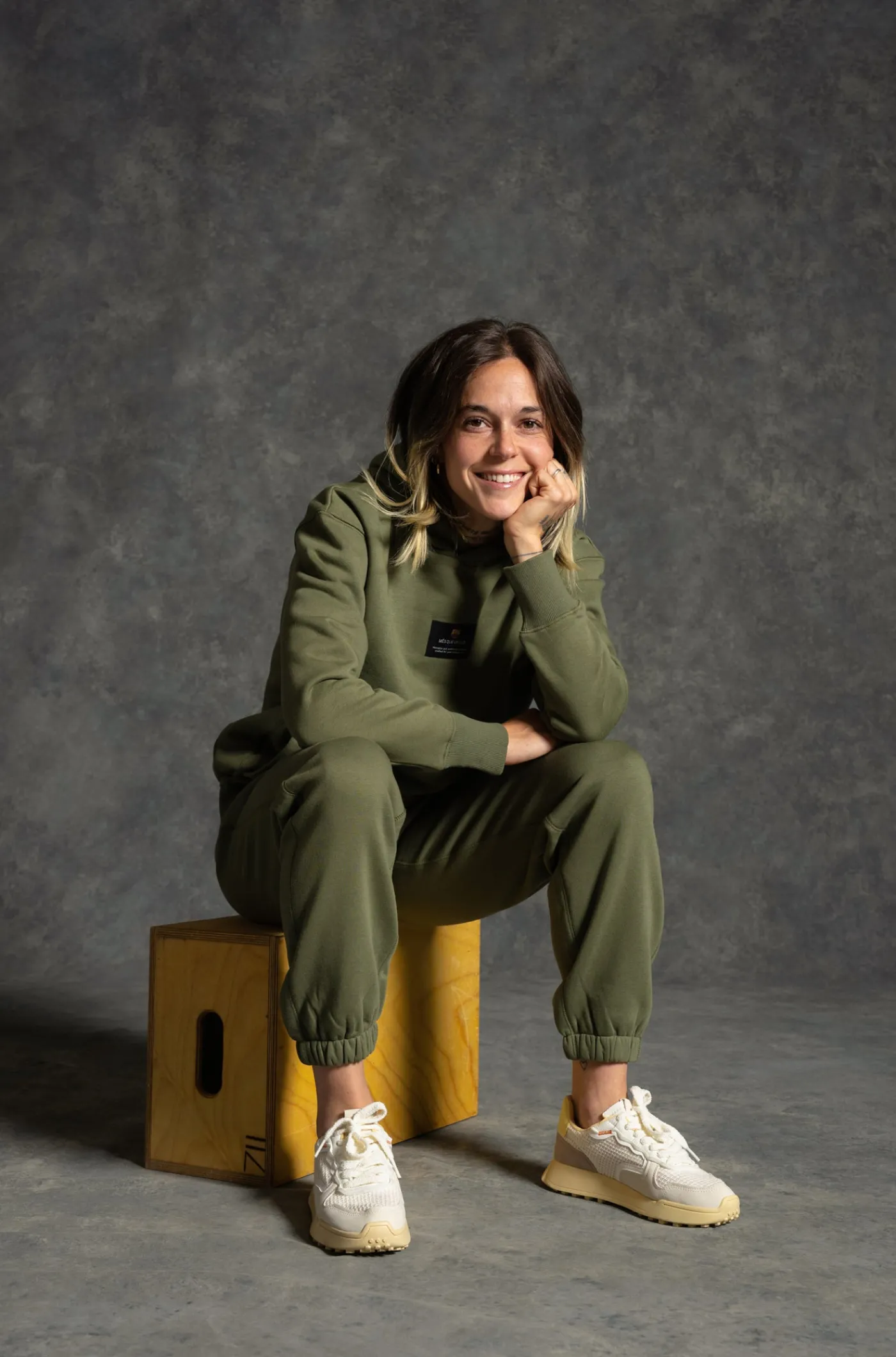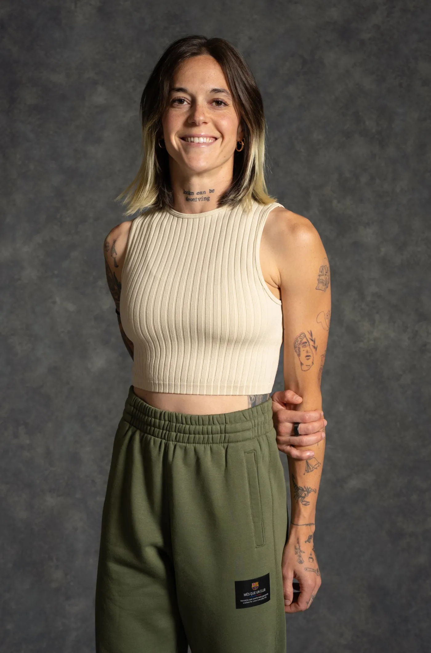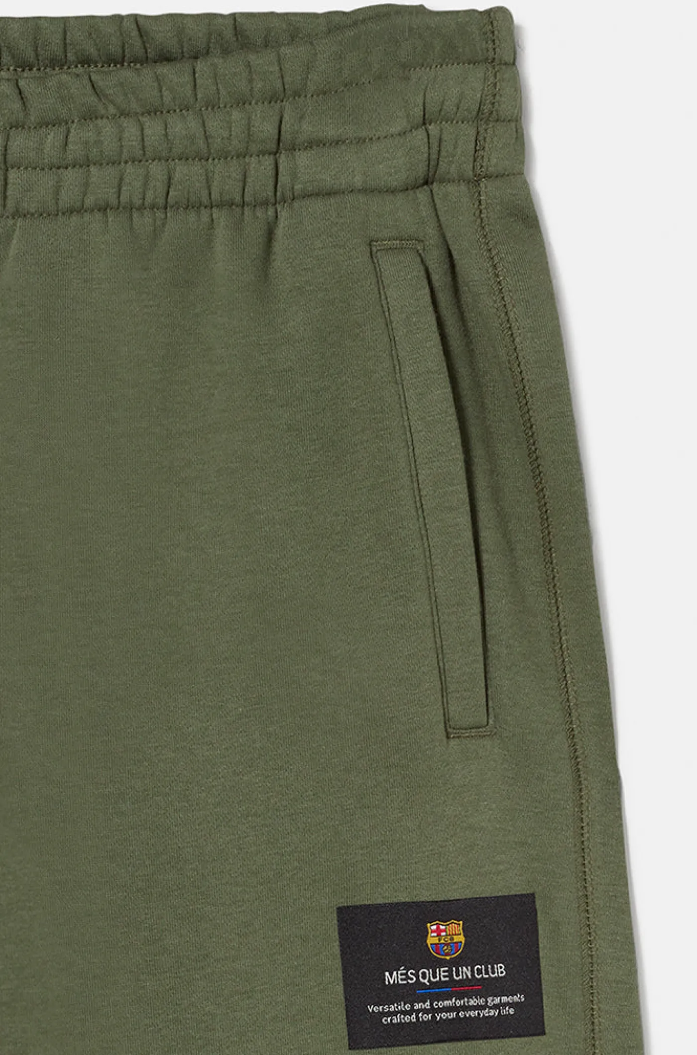 Pantalón de chándal de mujer, con parche con escudo pequeño del equipo FC Barcelona en el pecho y las palabras “Més que un club” en el delantero. Puños elásticos y cintura con cordones. Bolsillos abiertos en el delantero. Acabado suave en el interior. Color: caqui.