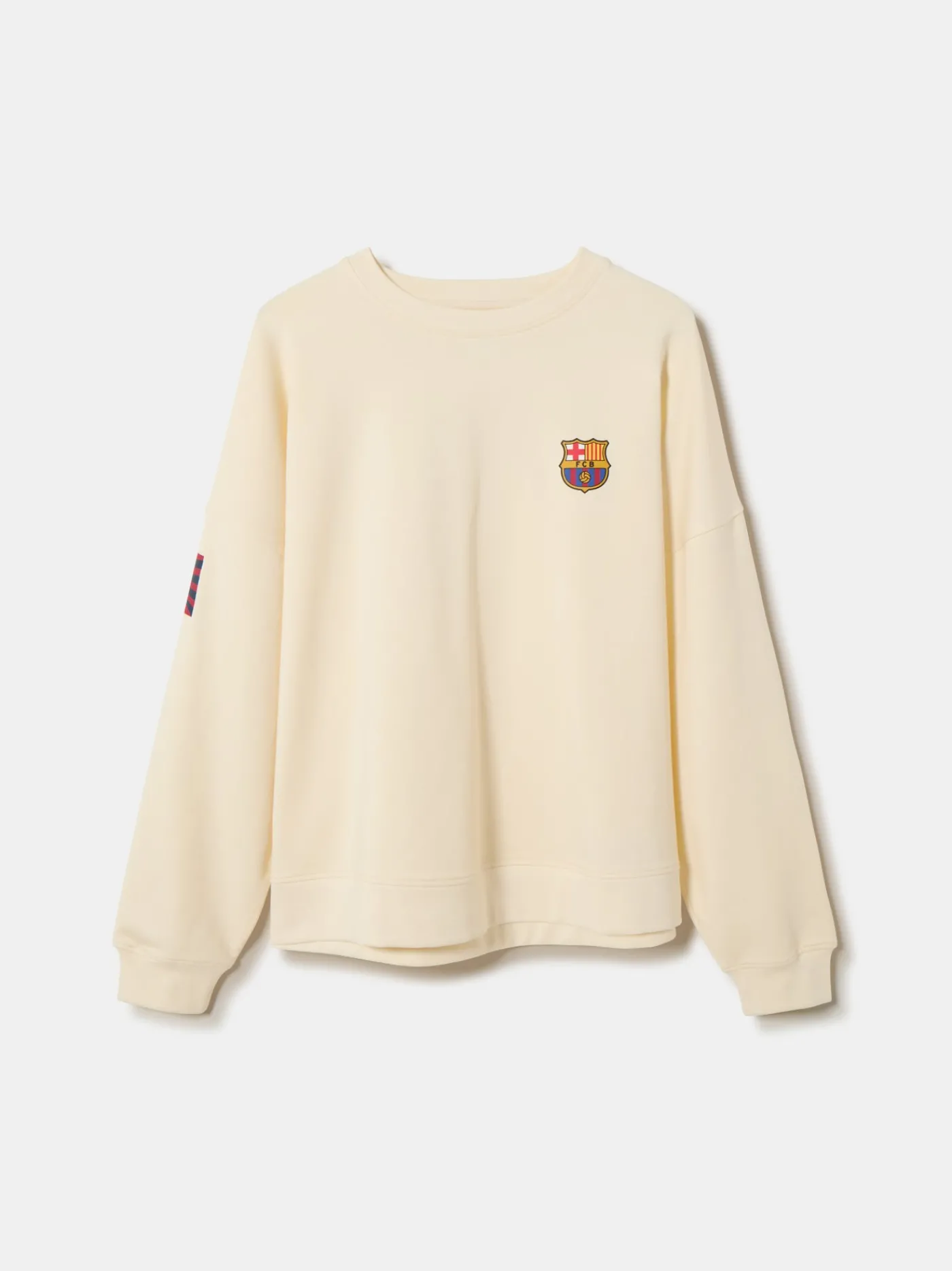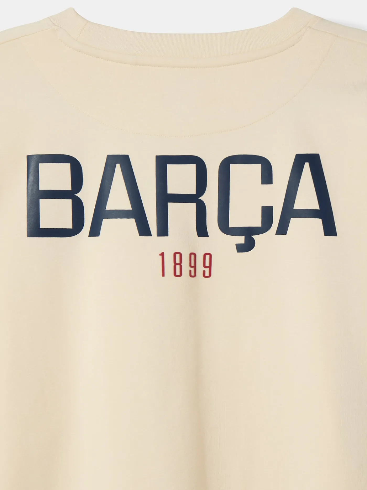 Sudadera beige para mujer de manga larga. Detalle de escudo estampado en el pecho, texto «BARÇA 1899» en la espalda a contraste y pequeño detalle en la manga derecha simulando una bandera blaugrana. Cuello redondo. Ajuste con goma elástica en los puños. Color: beige.