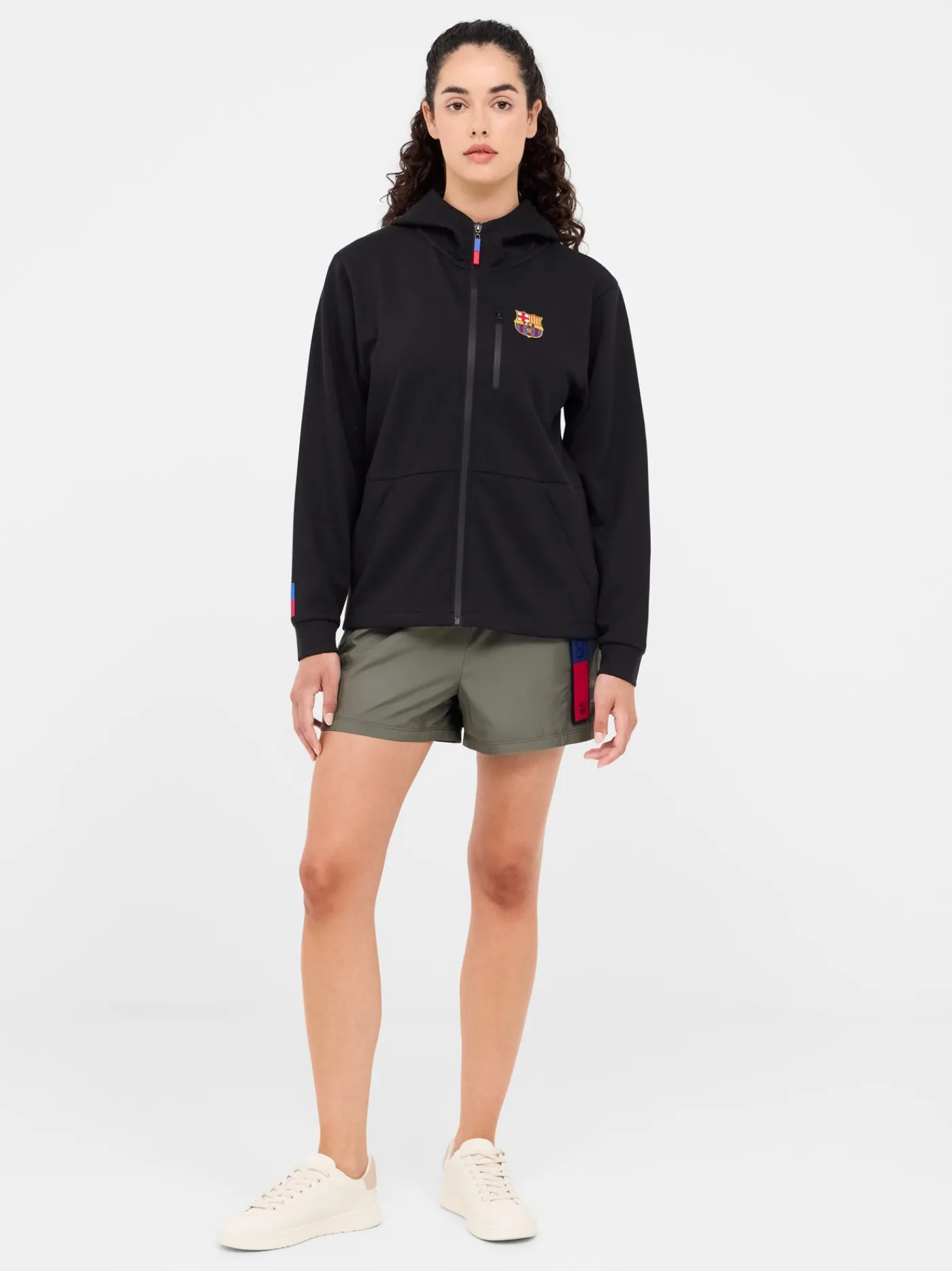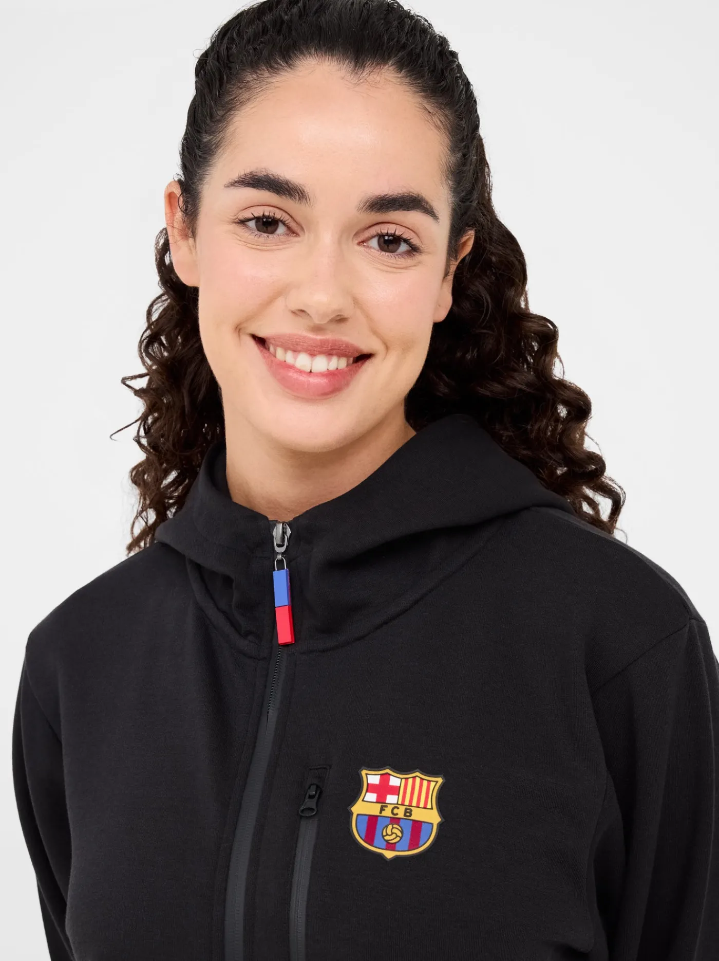 Detalle blaugrana en la manga derecha y en la cremallera. Letras Barça estampadas en la parte trasera.