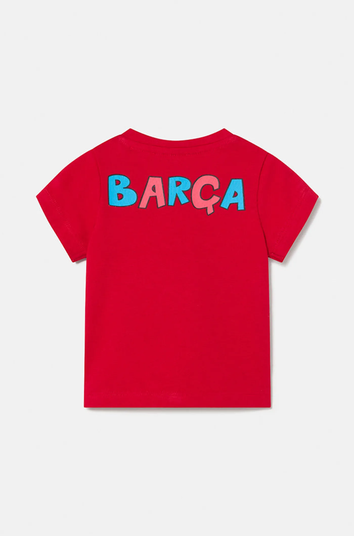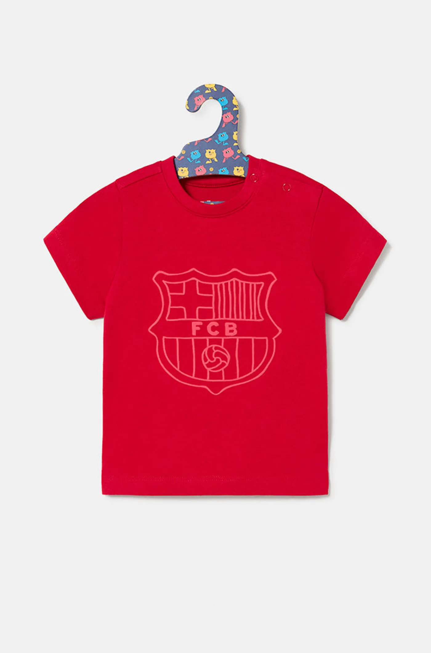 Camiseta de bebé de manga corta con el escudo del FC Barcelona en relieve. Dorso decorado con rótulo «Barça» en azul y granate. Escote redondo. Cierre con botón a presión en el hombro. Color: Rojo.