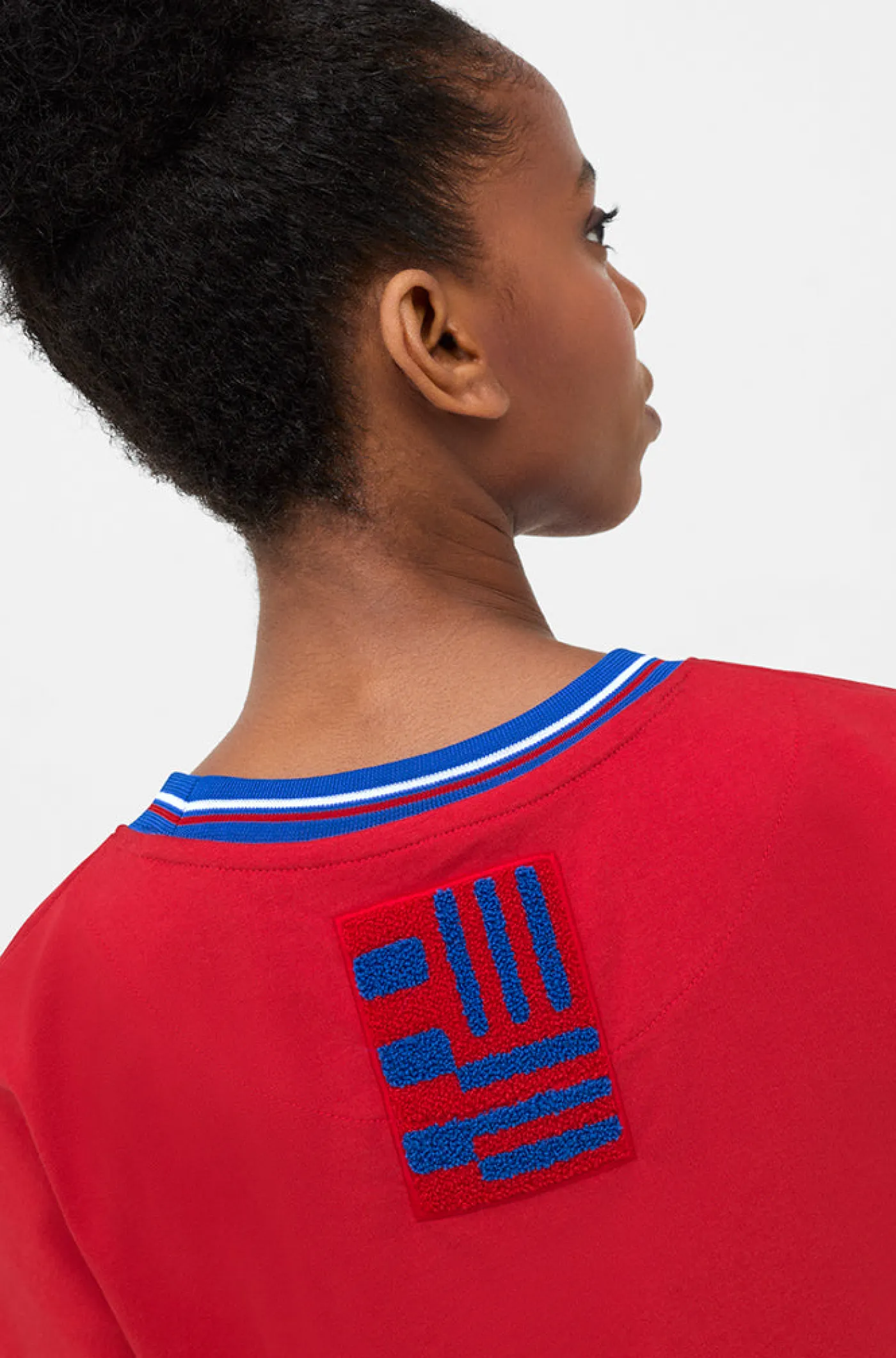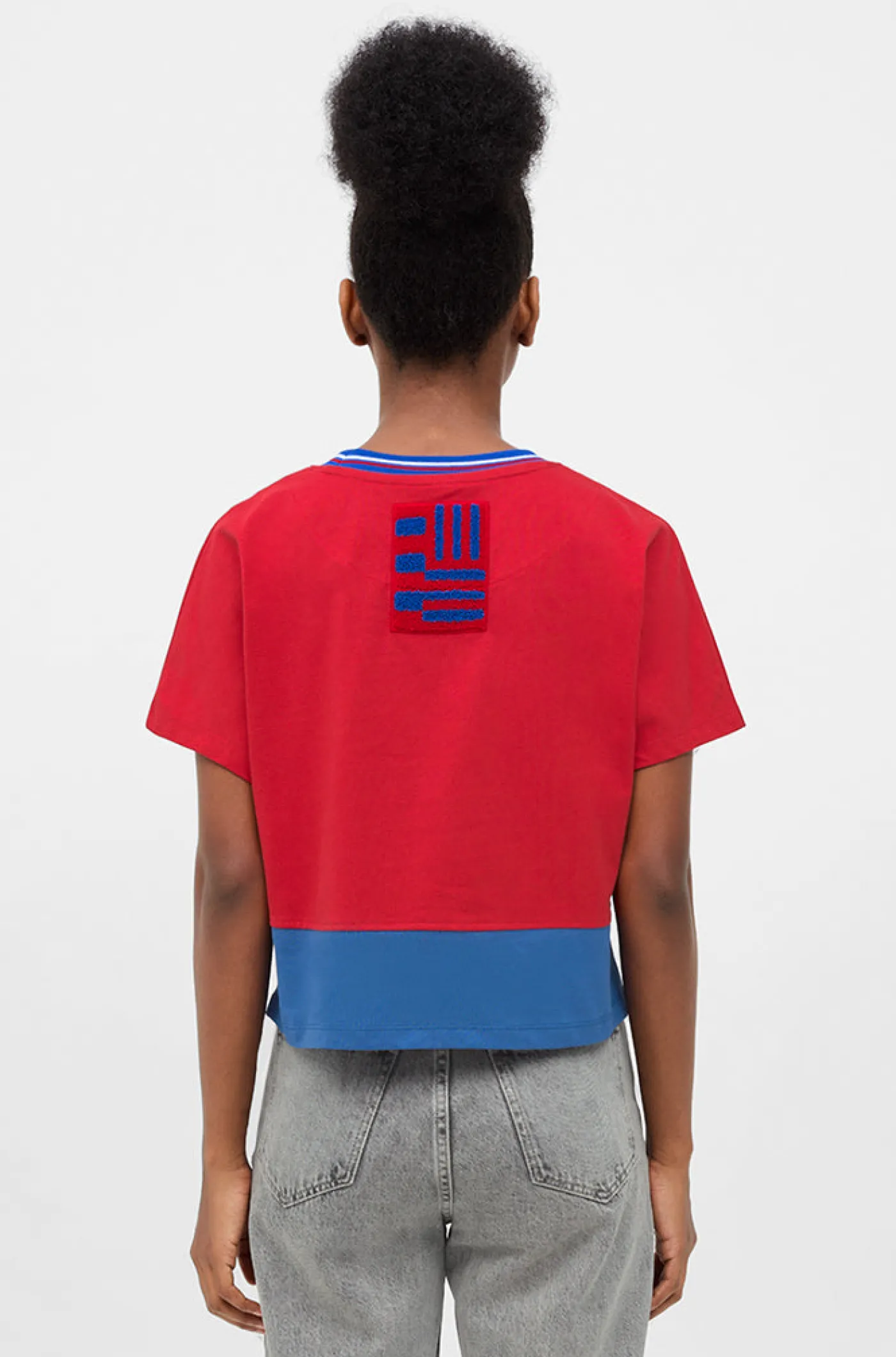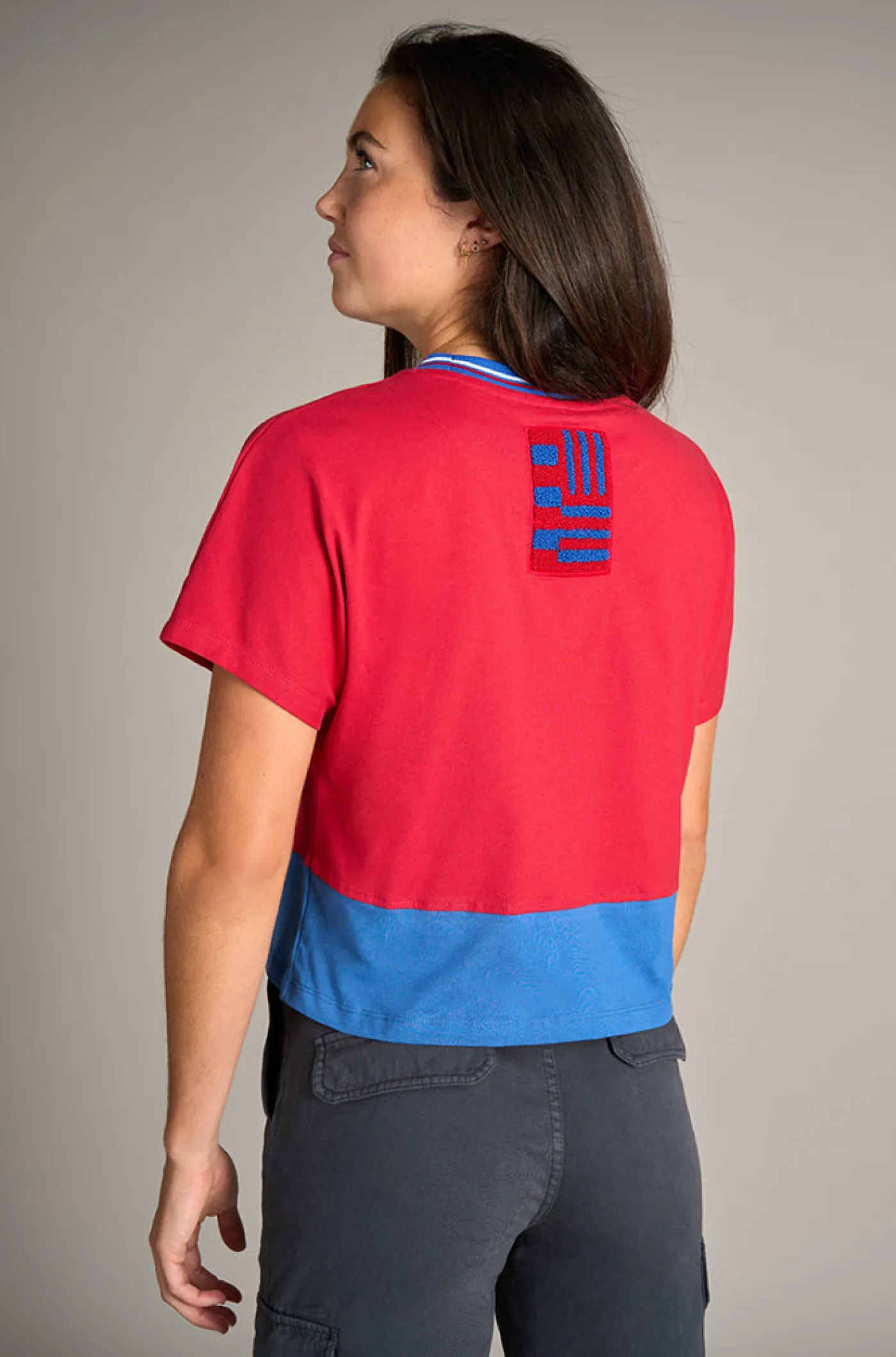 Camiseta Crop para mujer con el escudo en relieve del FC Barcelona. Su parte posterior destaca la bandera azulgrana con efecto toalla. Cuello redondo. Manga corta. Color: Azulgrana