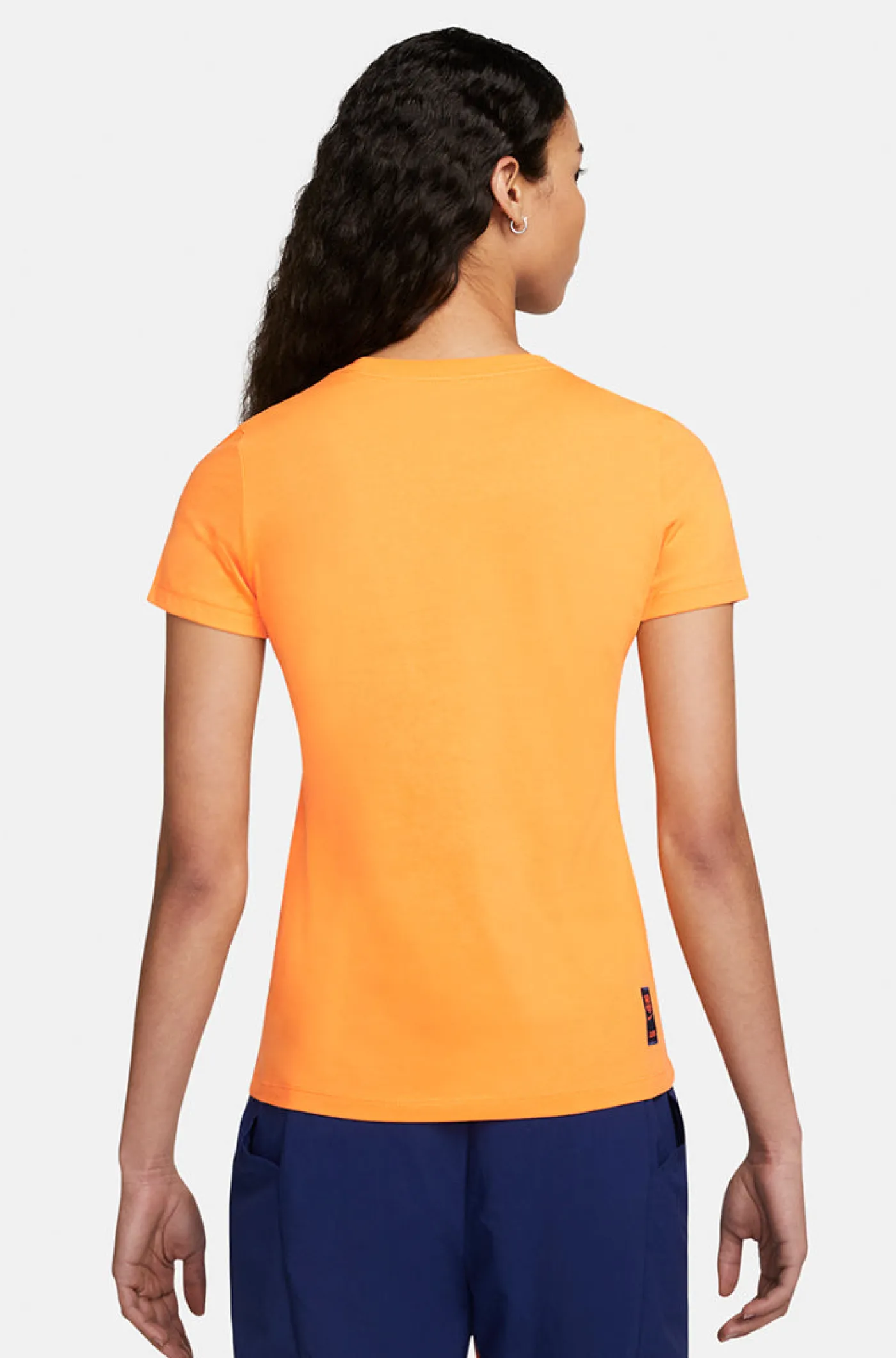 Camiseta de manga corta para mujer con rotulación de “Culers” y el logo de Nike centrados en el pecho. Detalle de escudo del FC Barcelona en la parte inferior posterior de la cintura. Cuello redondo. Su tejido de algodón la convierte en una prenda cómoda y ligera. Color: naranja.