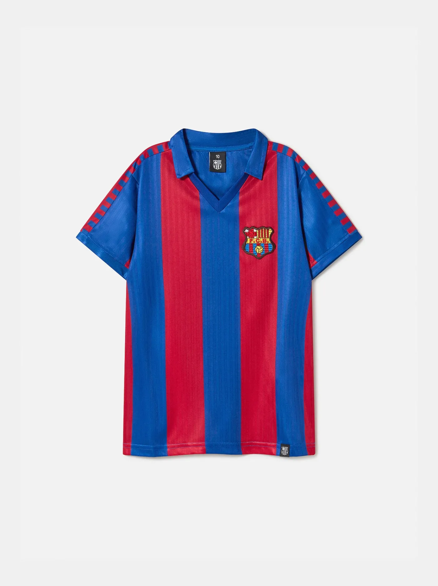 Camiseta réplica de la primera equipación para niños/as del FC Barcelona para las temporadas 1990-92. Cuello solapa. Manga corta. Número 10 en la espalda. Color: Azul y escarlata.