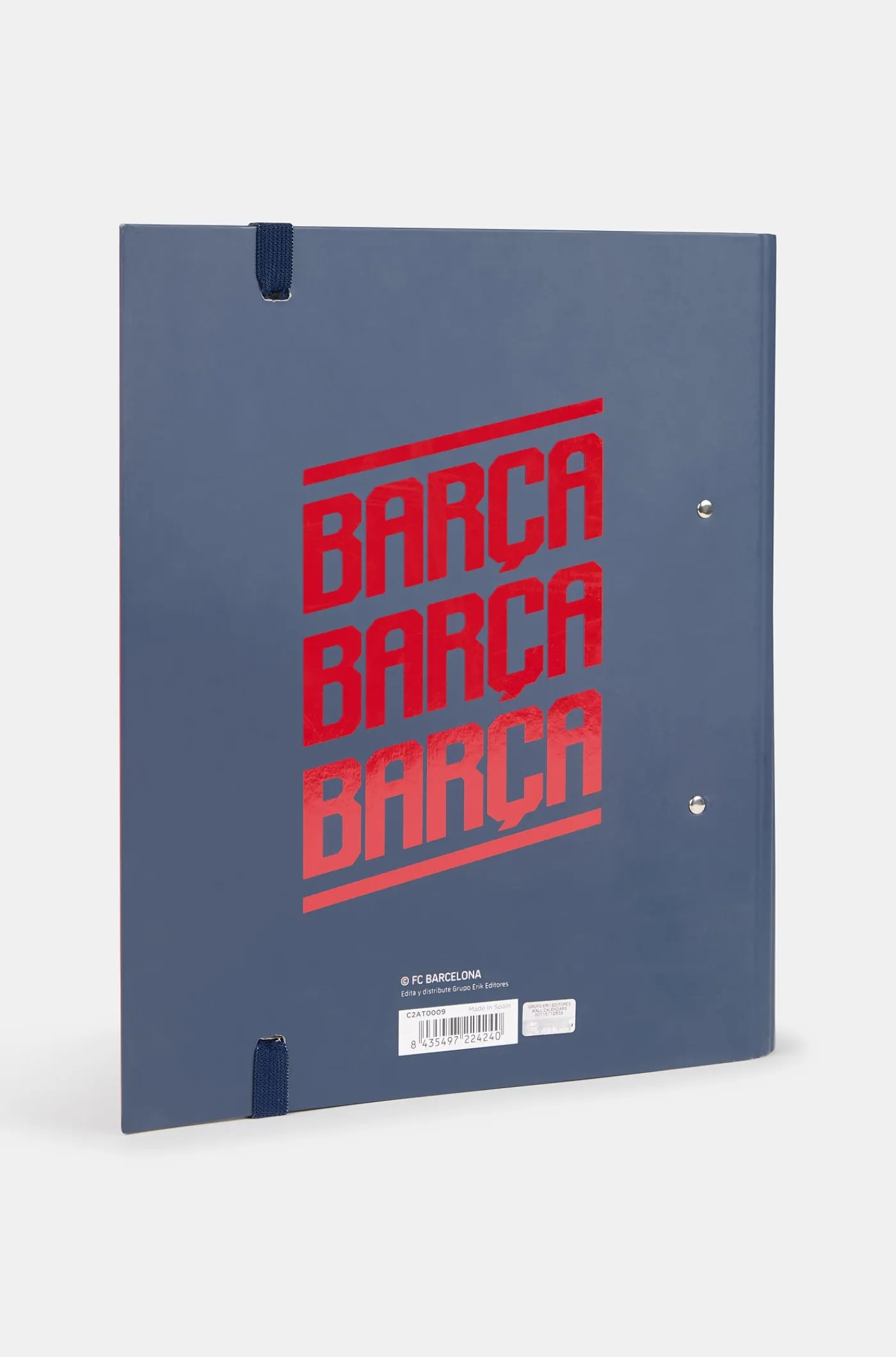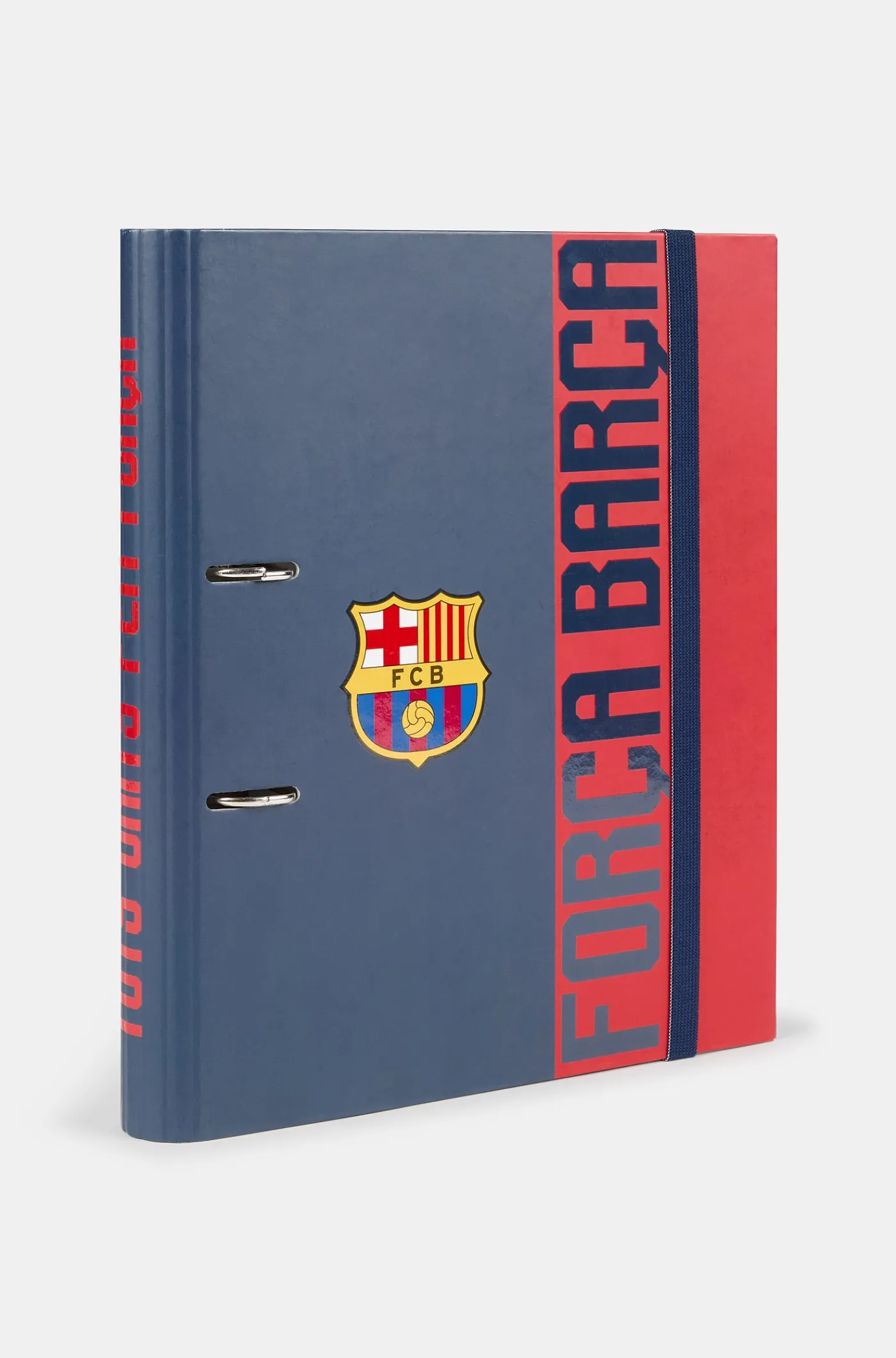 Archivador con dos anillas y goma para asegurar el cierre. Diseño del FC Barcelona y escudo en el centro.