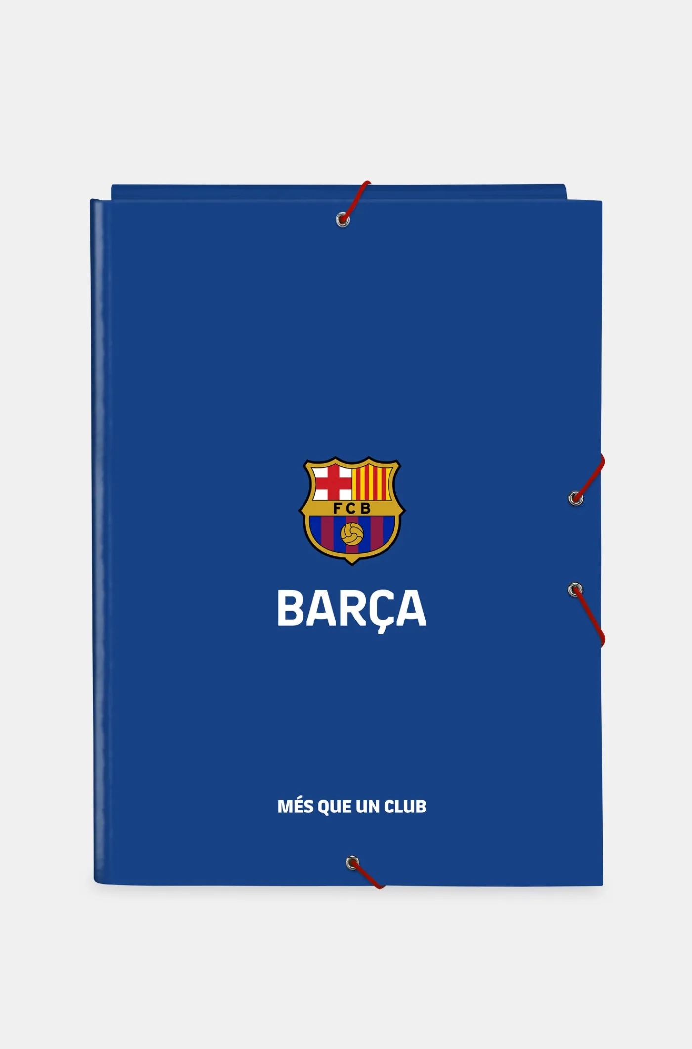 Carpeta del FC Barcelona, tamaño folio. Tapas duras, con 3 solapas interiores y cierre con gomas elásticas.