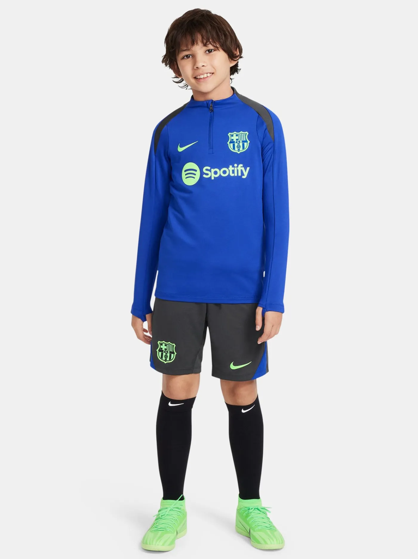 Pantalón de entrenamiento para niños de 6 a 14 años con escudo del FC Barcelona bordado y logo de Nike. Cintura elástica con cordón. Bolsillos delanteros. Piernas con cremalleras. Tecnología Nike Dri-FIT. Color: gris