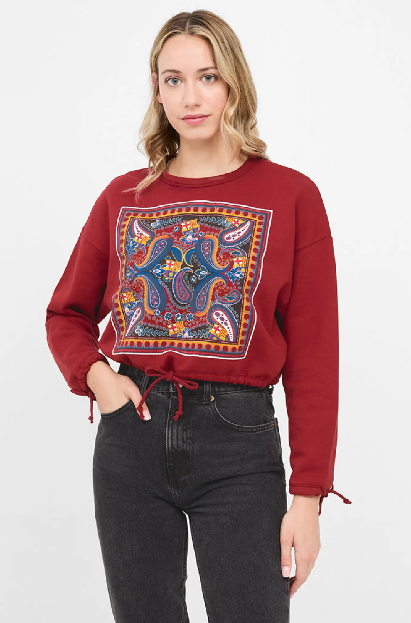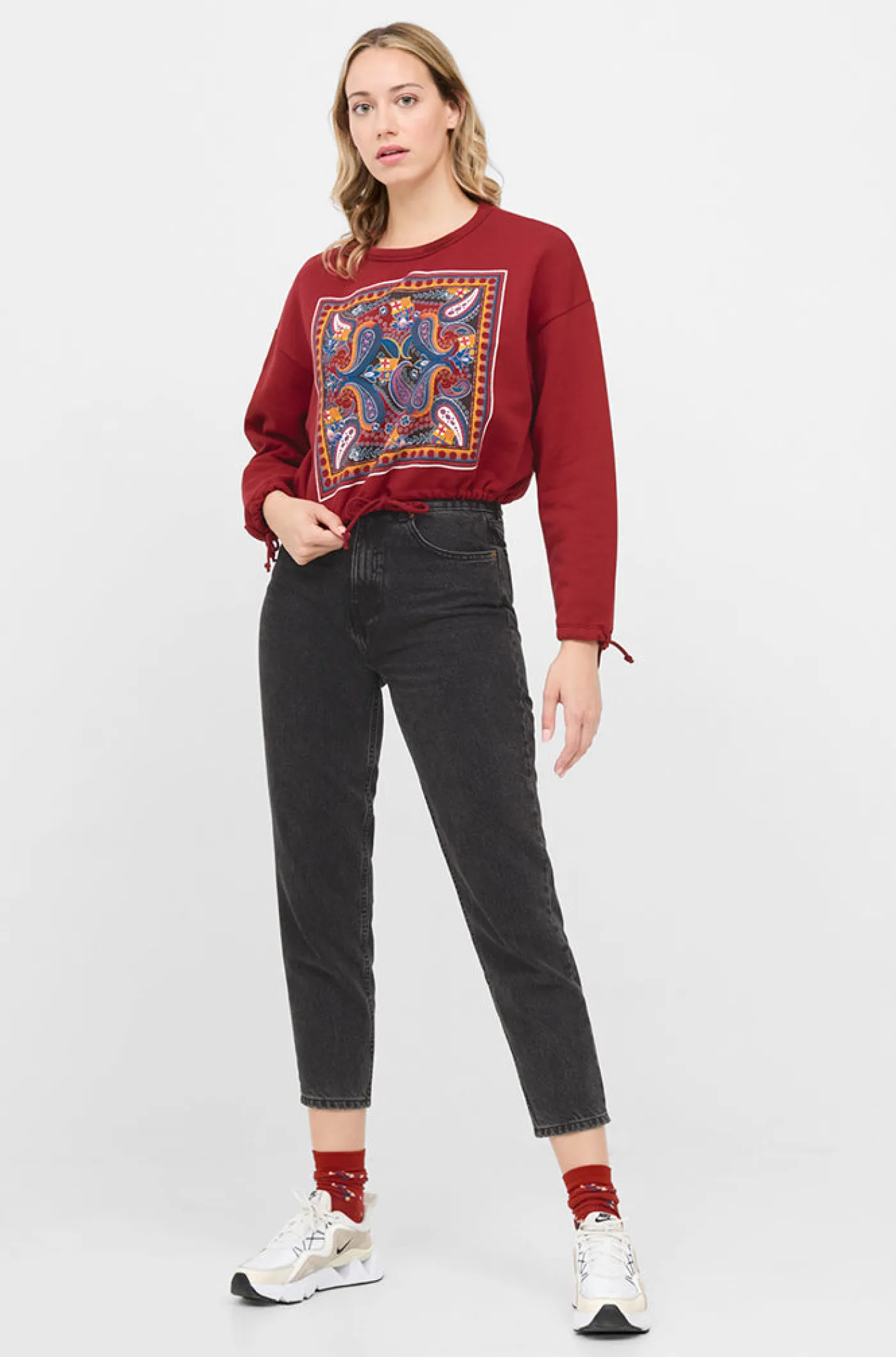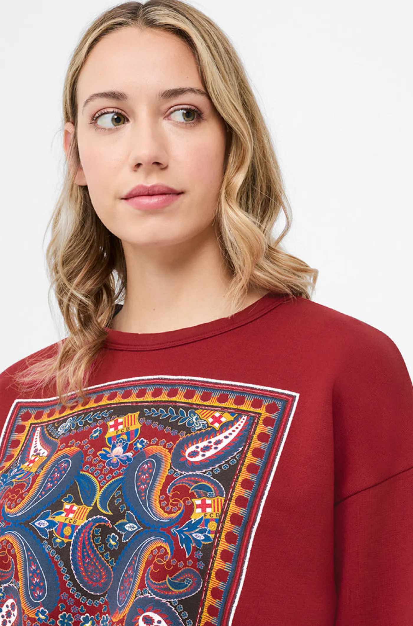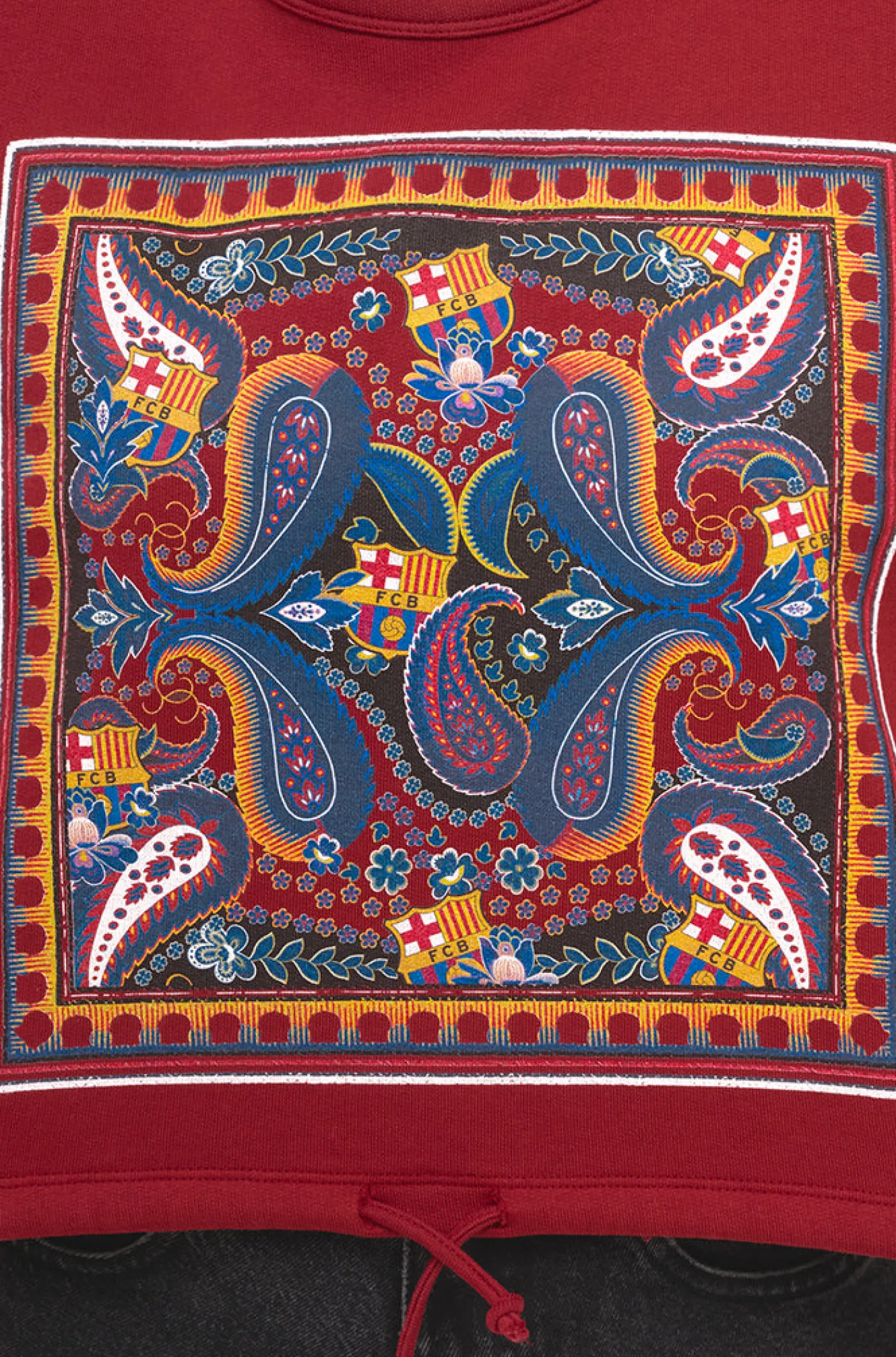 Sudadera de corte crop diseñada con estampado paisley y escudo del FC Barcelona. Cuello redondo. Manga larga. Interior de felpa ligera. Cintura y puños ajustables mediante tiras para anudar. Ideal para presumir de look y equipo. Prenda sostenible está hecha a partir de tejidos orgánicos y/o reciclados. Color: Granate. Venta exclusiva de Barça Stores