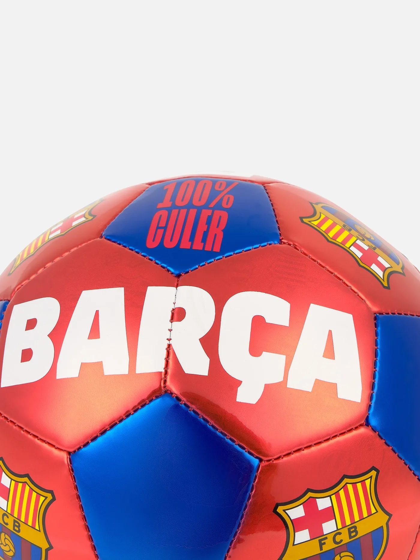 Balón con diseño blaugrana.Letras en el centro con la palabra «Barça» y escudo a ambos lados. Inscripción «100% cule…