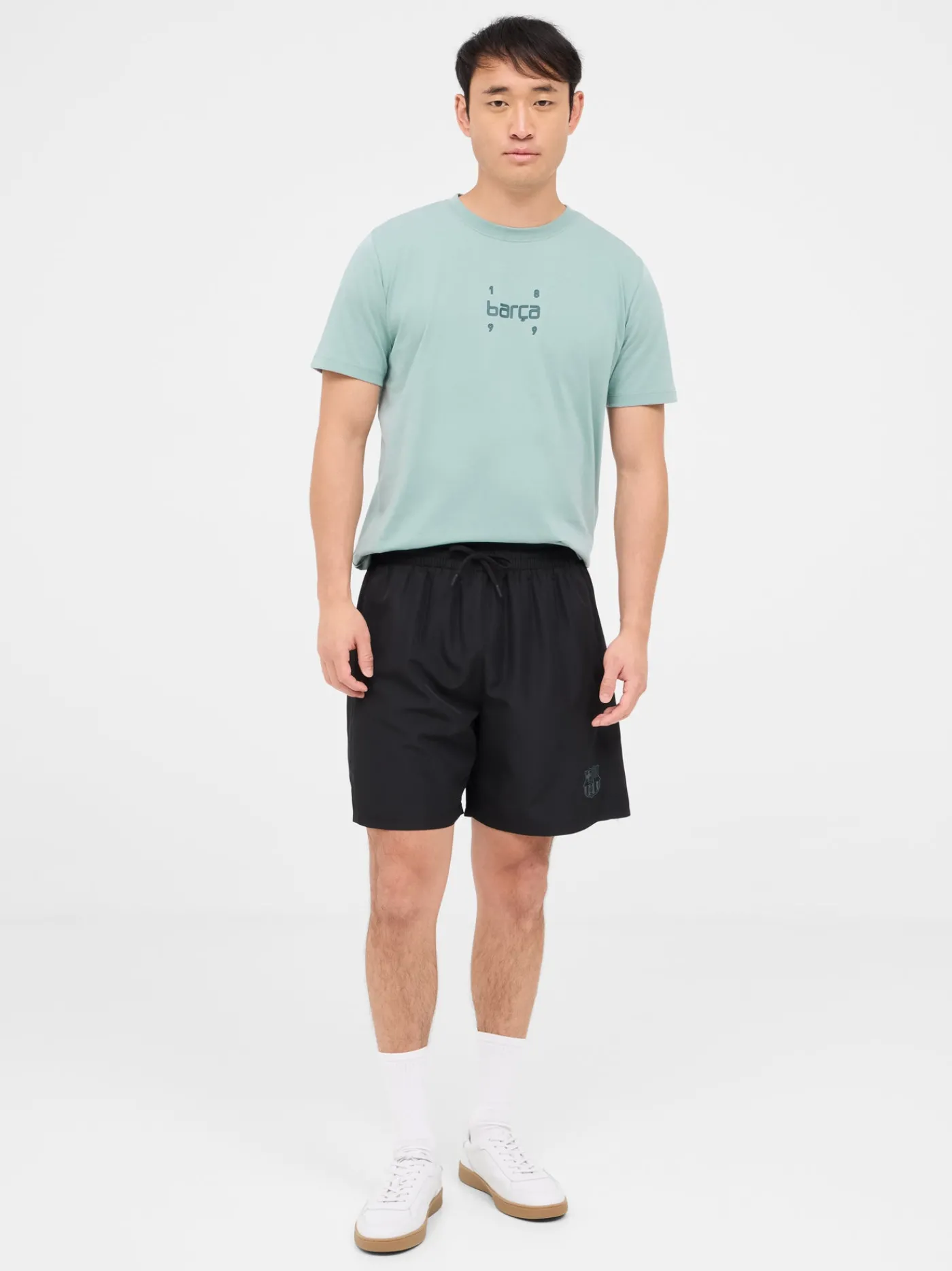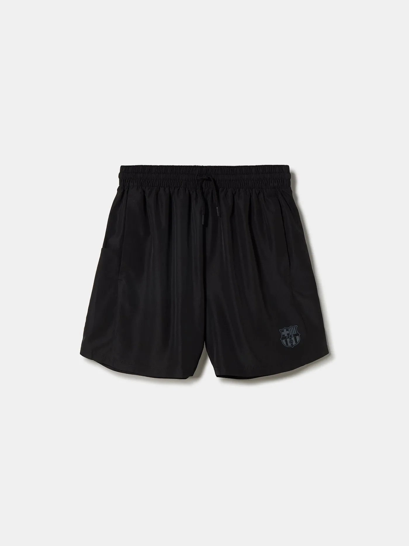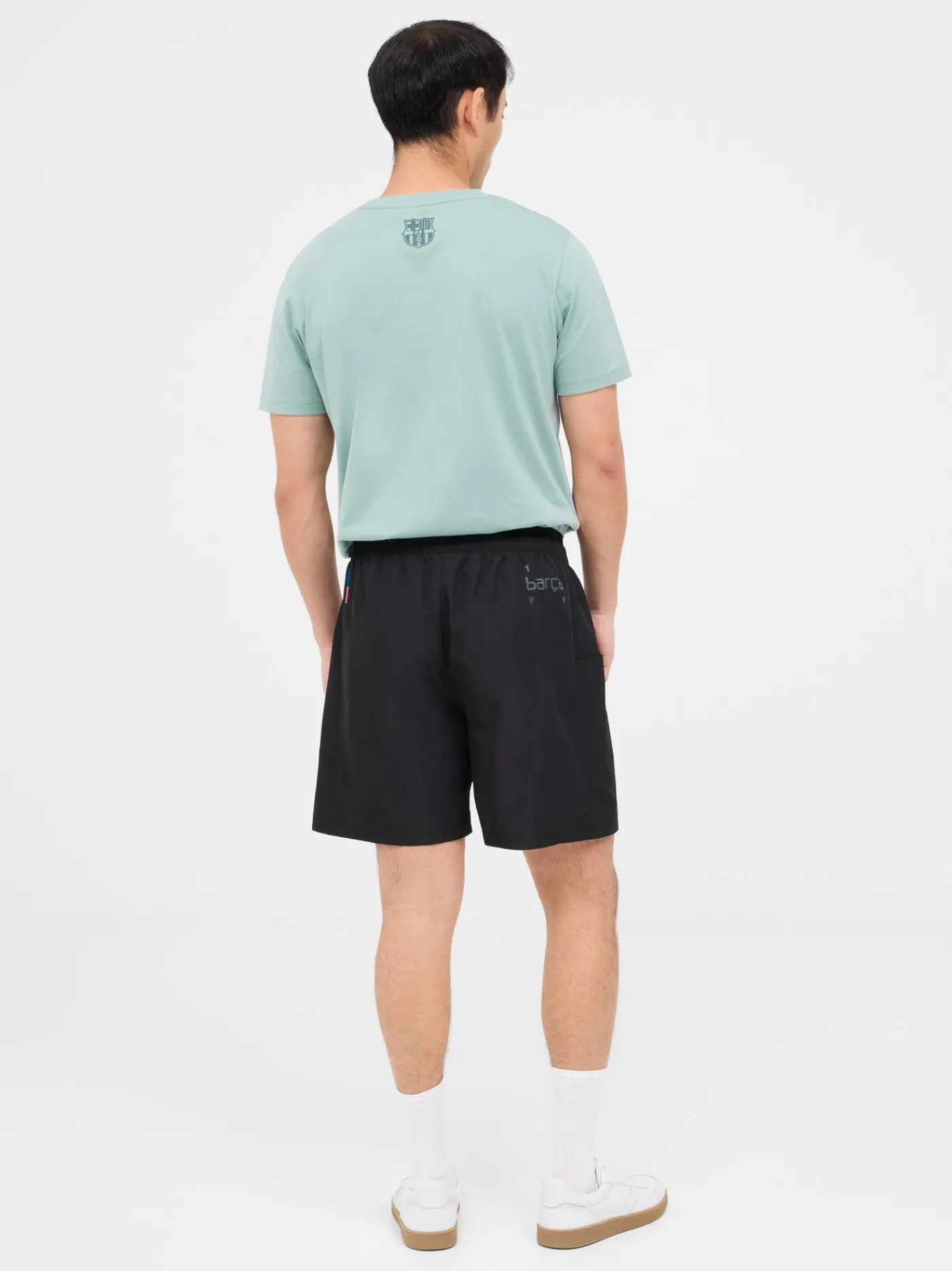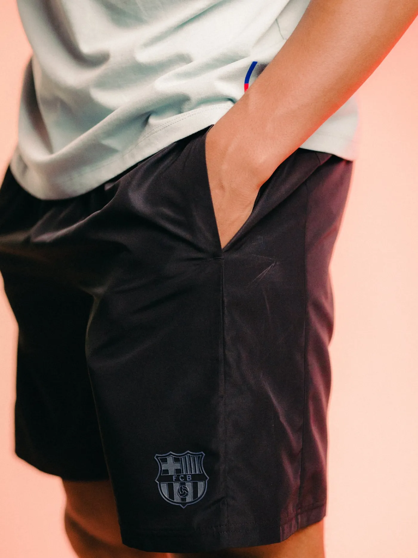Bermuda negra con el escudo estampado en la parte delantera y texto «BARÇA» en la parte trasera a contraste.