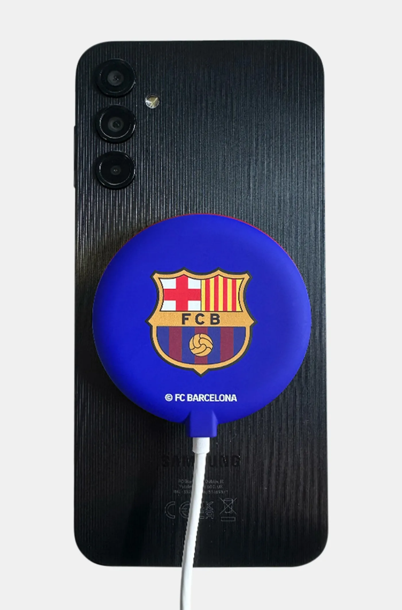 Cargador inalámbrico para teléfonos compatibles con este método de carga. Tipo C. Color azul con escudo del Barça en el centro y cable de color blanco incorporado.