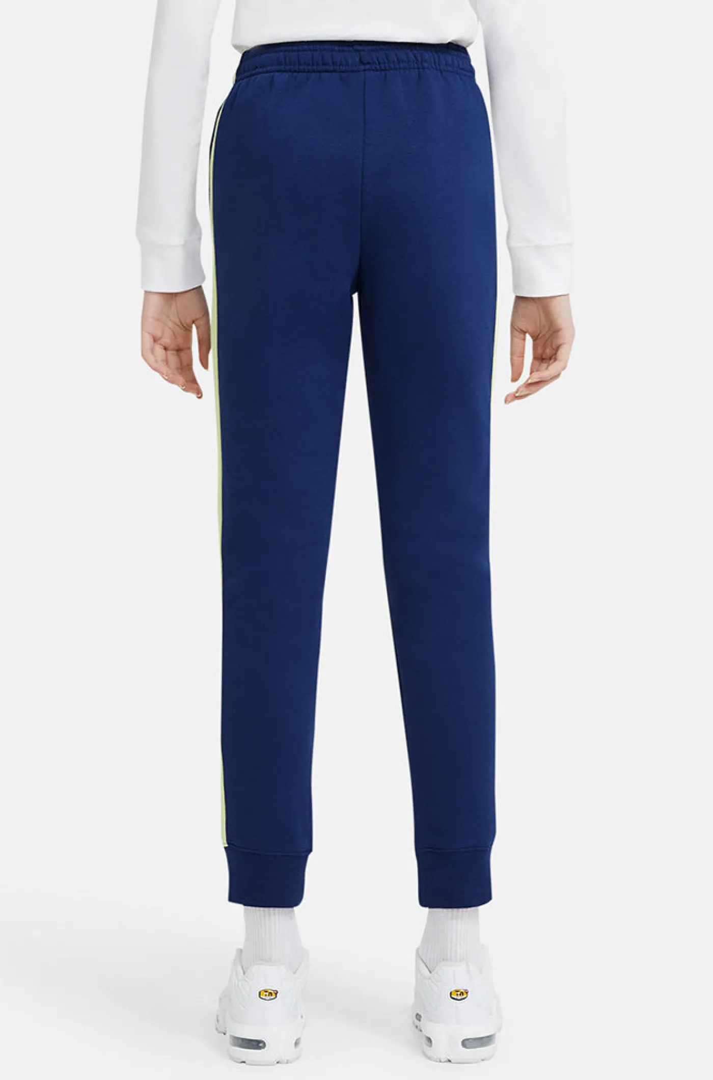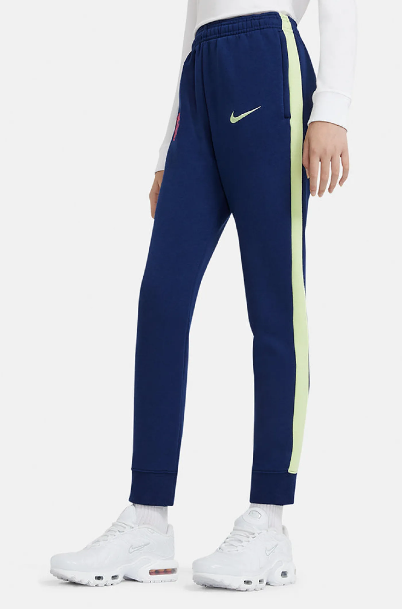 Pantalón deportivo júnior con el escudo del FC Barcelona y logo de Nike bordados en un lateral. Interior de felpa ligera. Cintura elástica con cordones en la parte interior. Bolsillos delanteros: 2 con cremallera. Bajos elásticos. Color: Azul