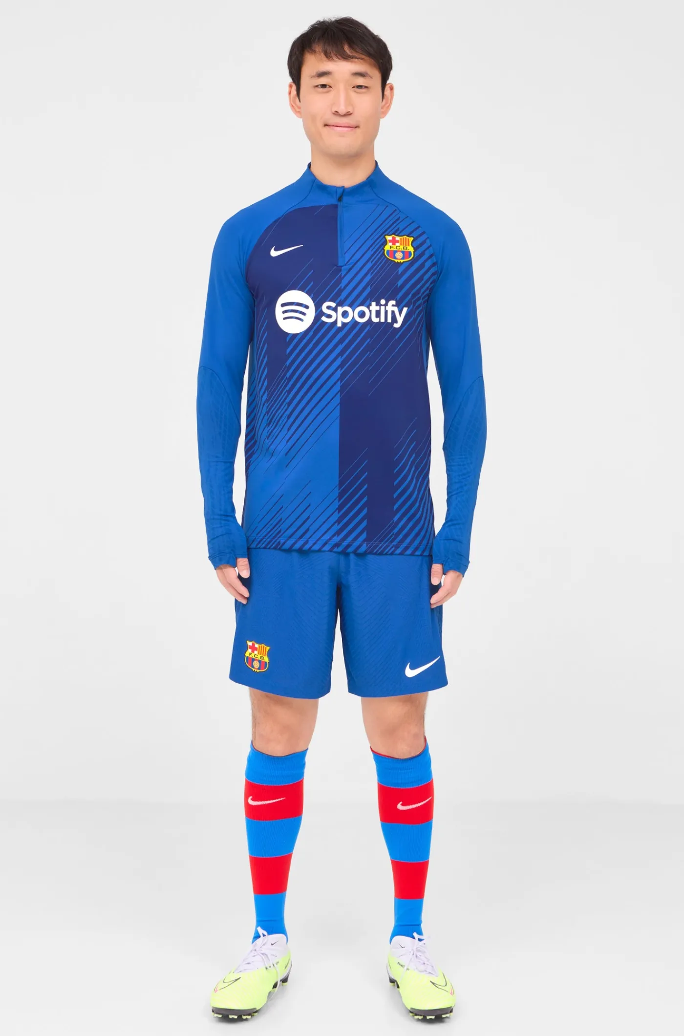 Sudadera pre-partido del FC Barcelona 23/24 que utilizan los jugadores del 1er equipo para realizar el calentamiento previo a saltar al terreno de juego en los partidos de La Liga. Camiseta con el parche del FC Barcelona y el logo de Nike bordado. Cuello redondo. Manga larga. Tecnología Dri-FIT de Nike. Color: blanco, azul y rojo.