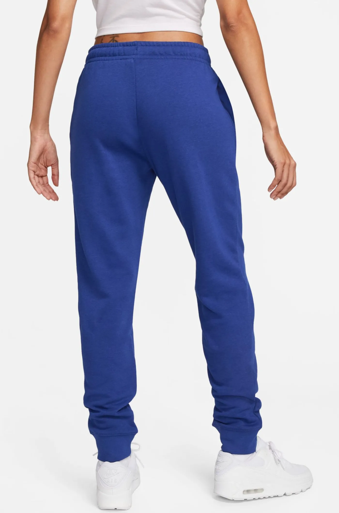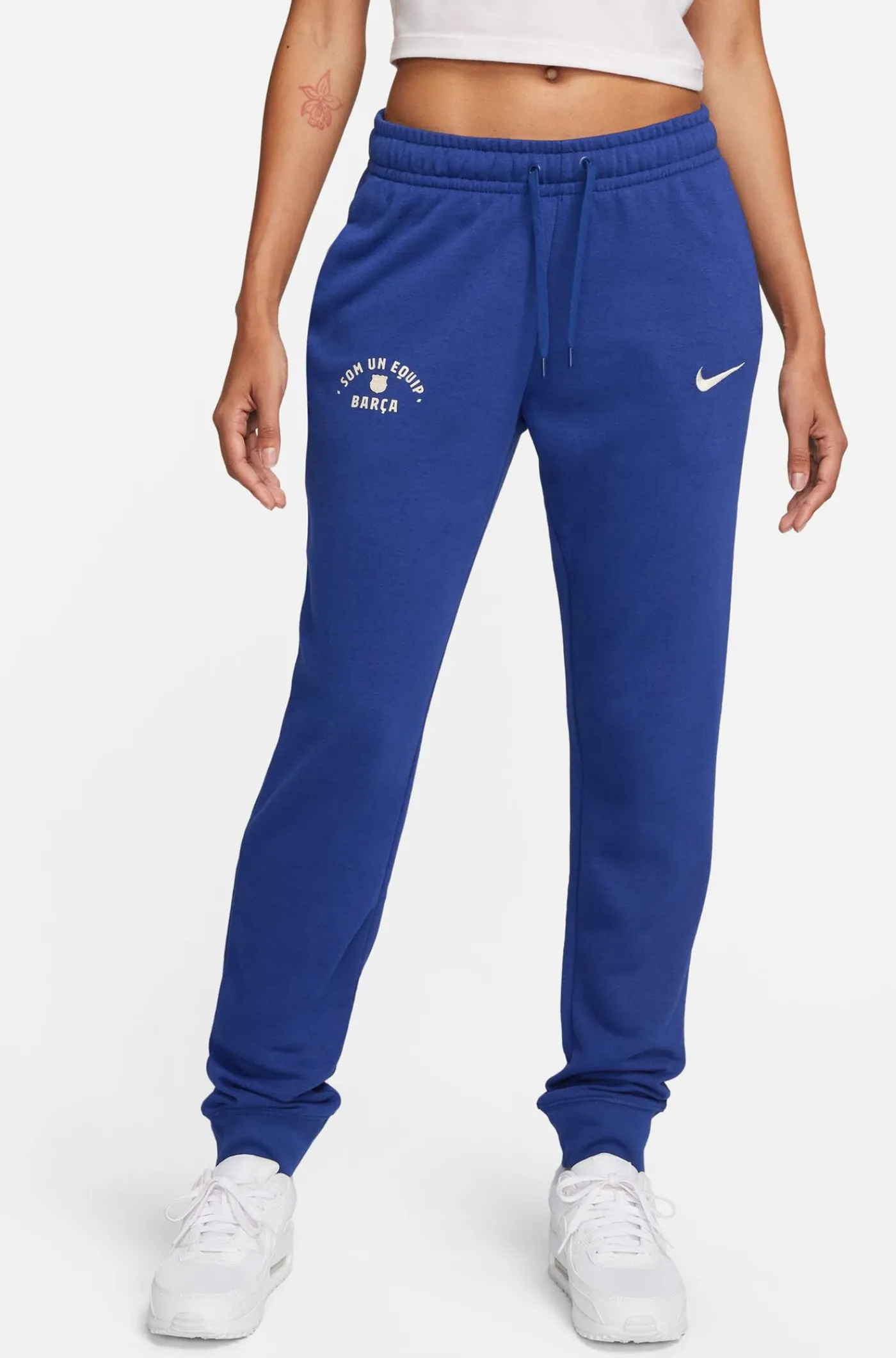 Pantalón deportivo para mujer con la silueta del escudo del FC Barcelona y con el lettering «Som un equip» (somos un equipo) a contraste. Cintura elástica con cordones. Bolsillos delanteros: 2. Bajo con acabado en canalé. Color: azul.