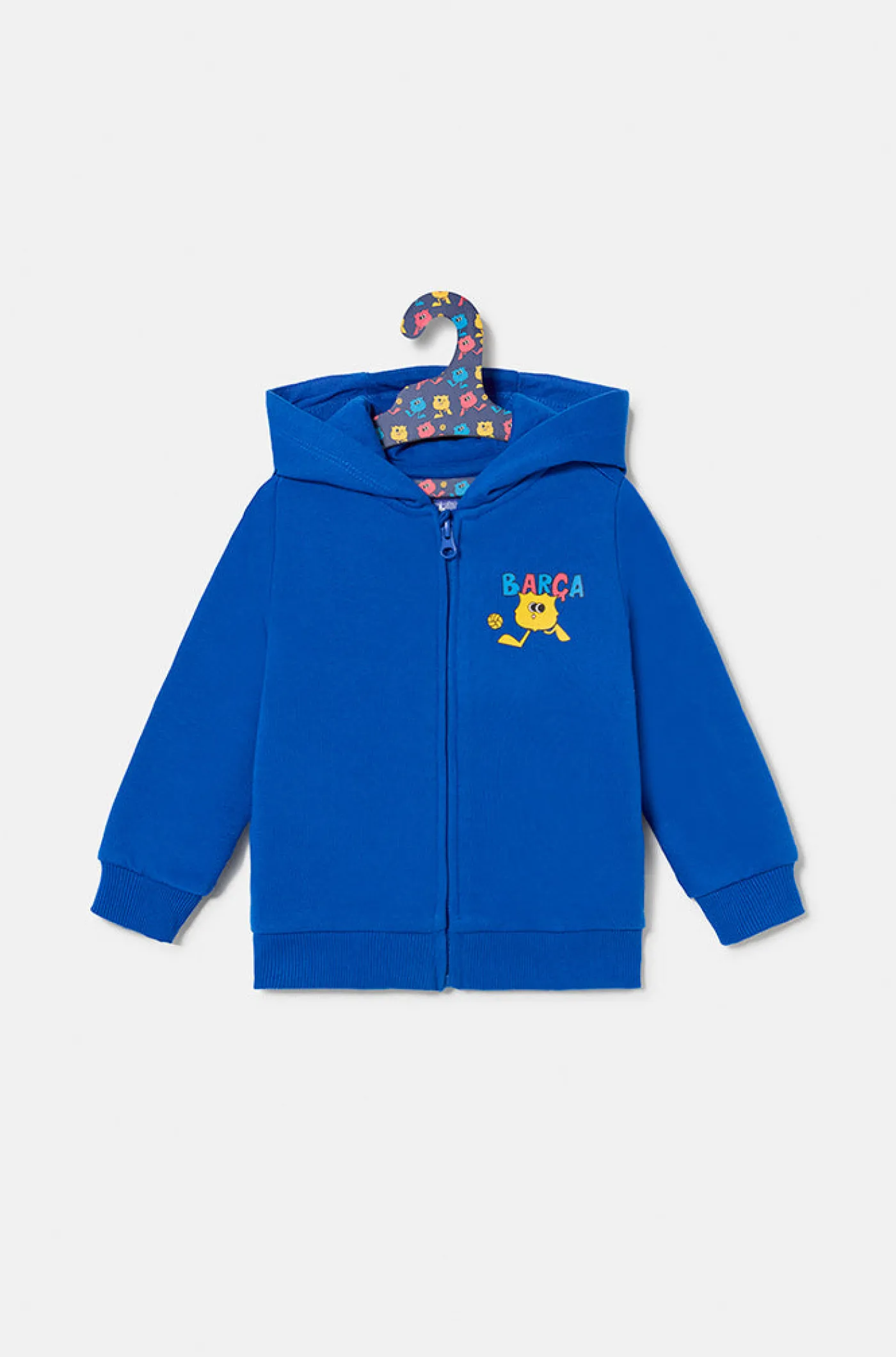 Sudadera con capucha para bebé con el escudo animado del FC Barcelona y el texto ‘Barça’. Espalda con el escudo del FC Barcelona en relieve. Interior de forro polar ligero. Manga larga. Cintura y puños elásticos. Cierre de cremallera. Bolsillo canguro. Color: Azul.