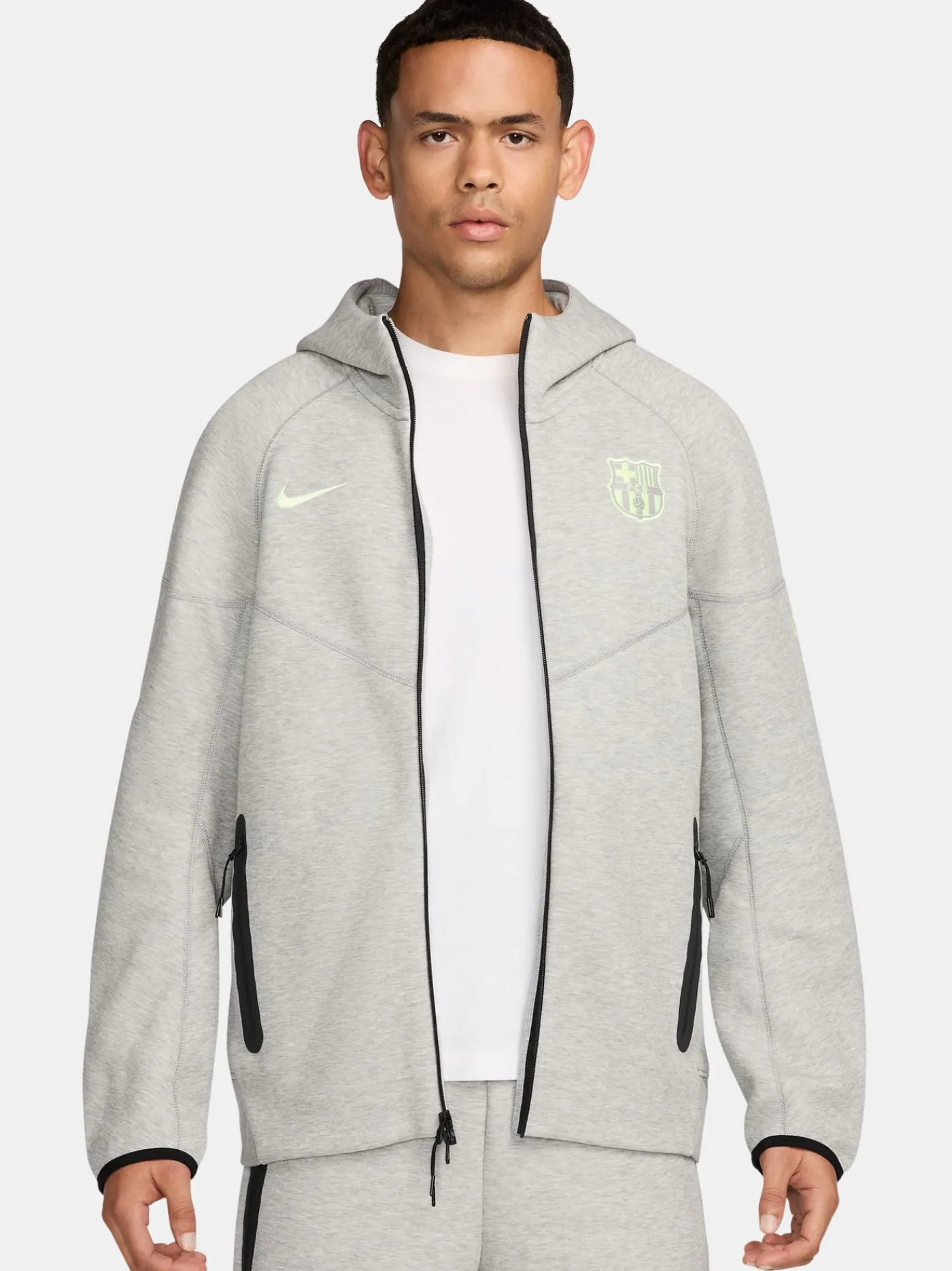 Chaqueta del FC Barcelona de la temporada 24/25. Con el escudo del FC Barcelona y logo de Nike a contraste bordado en el pecho. Mangas largas. Presenta capucha y cierre con cremallera. Dos bolsillos abiertos en la parte delantera y un bolsillo con cremallera en la manga. Color: gris
