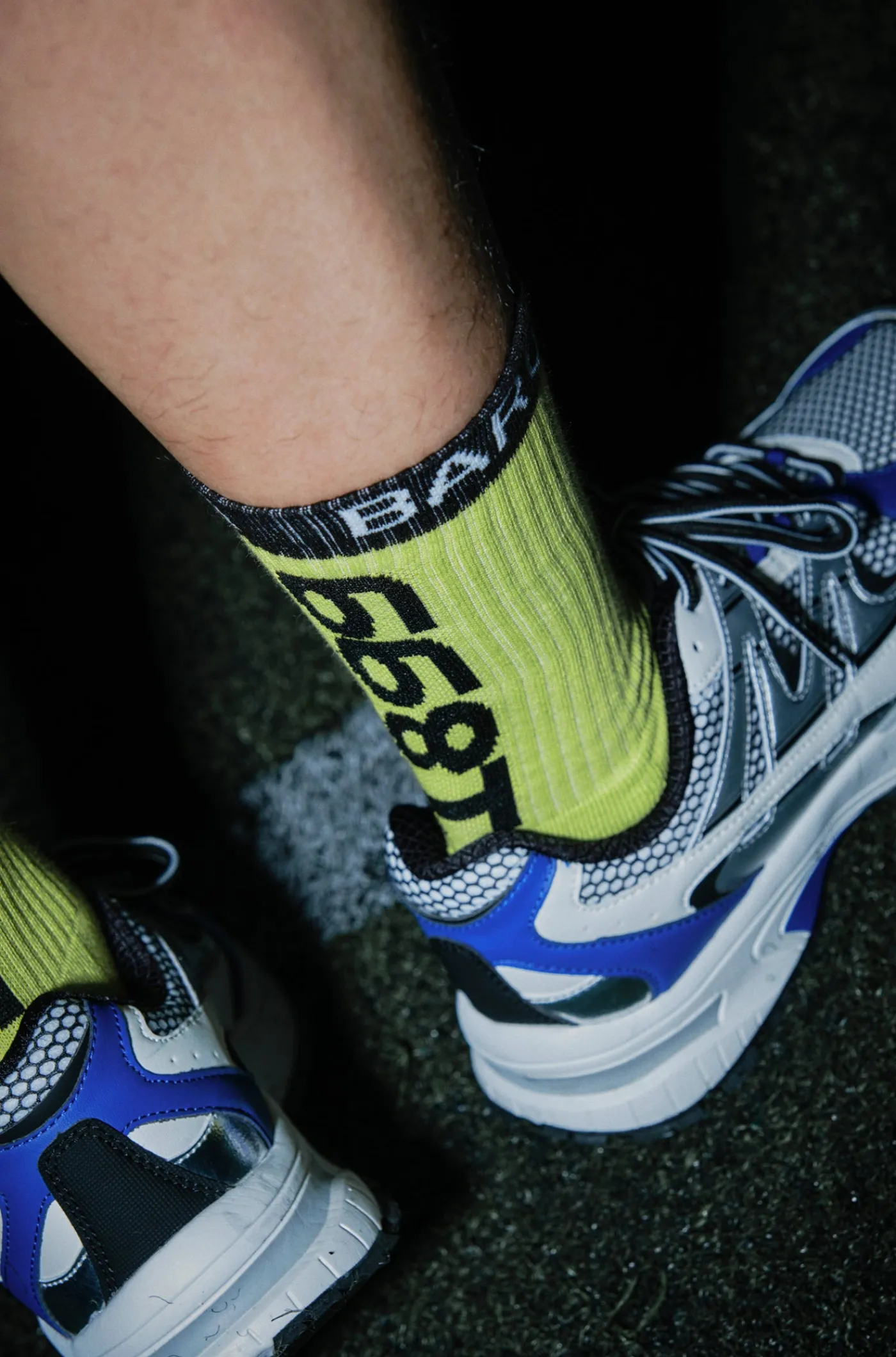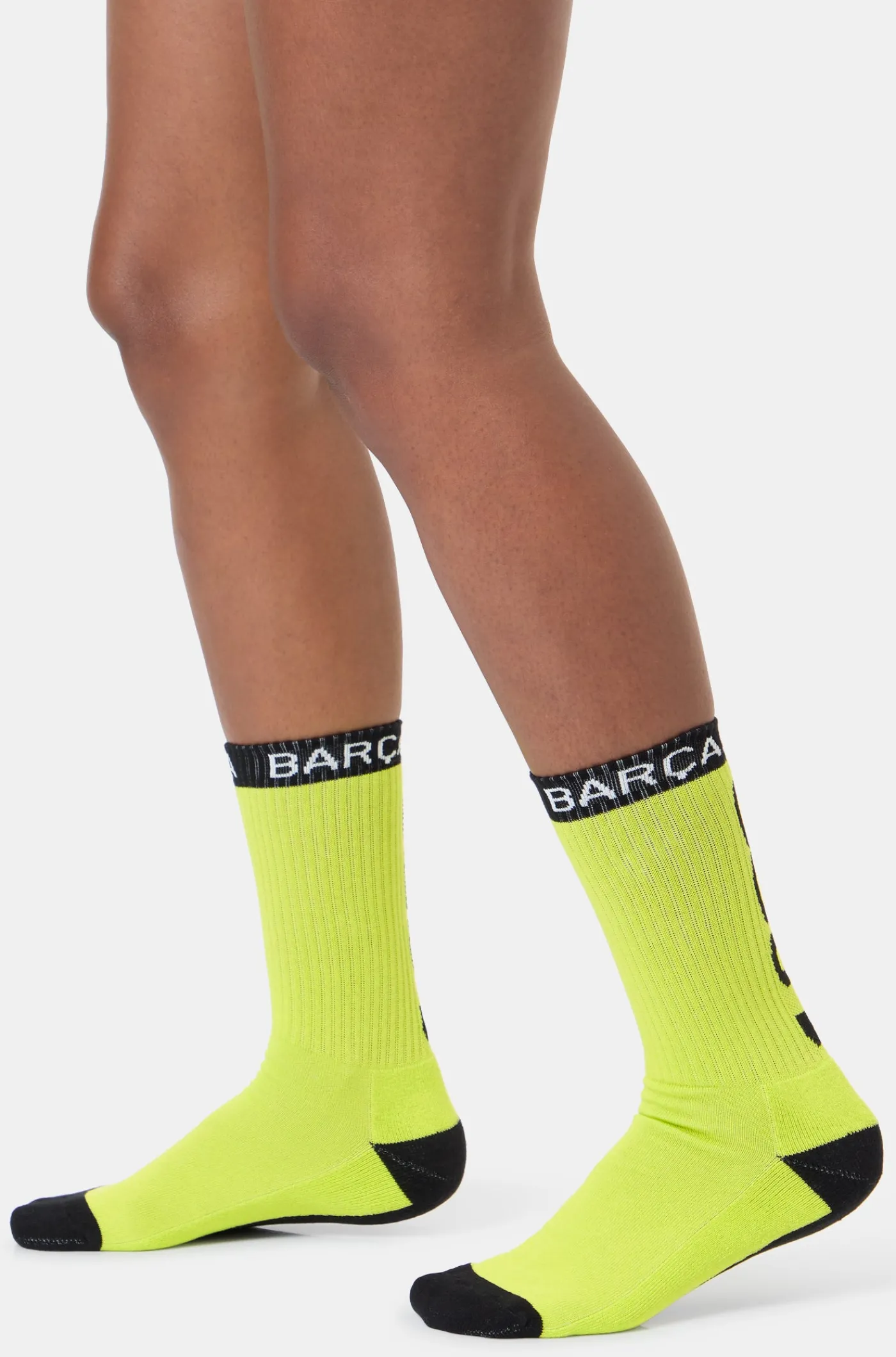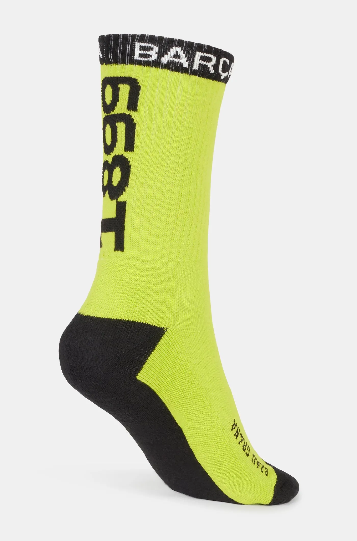 Calcetines de la colección Numerology con gráfico 1899 en trasera. Caña de canalé y puño elástico negro con “lettering Barça” en blanco. Color: lima