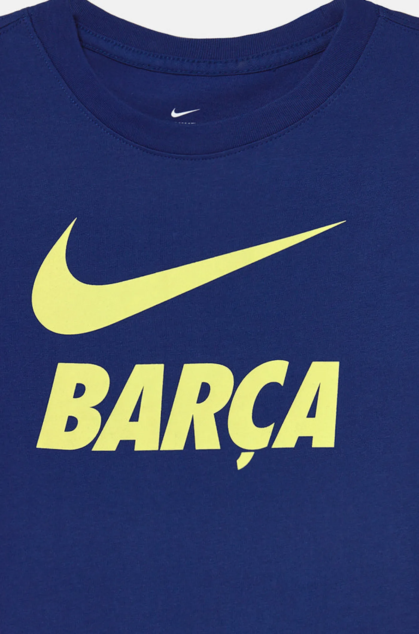 Camiseta para niño de manga corta con rotulación de “Barça” y el logo de Nike centrados en el pecho. Detalle de escudo del FC Barcelona en la parte inferior de la cintura. Cuello redondo. Su tejido de algodón la convierte en una prenda cómoda y ligera. Color: Azul eléctrico