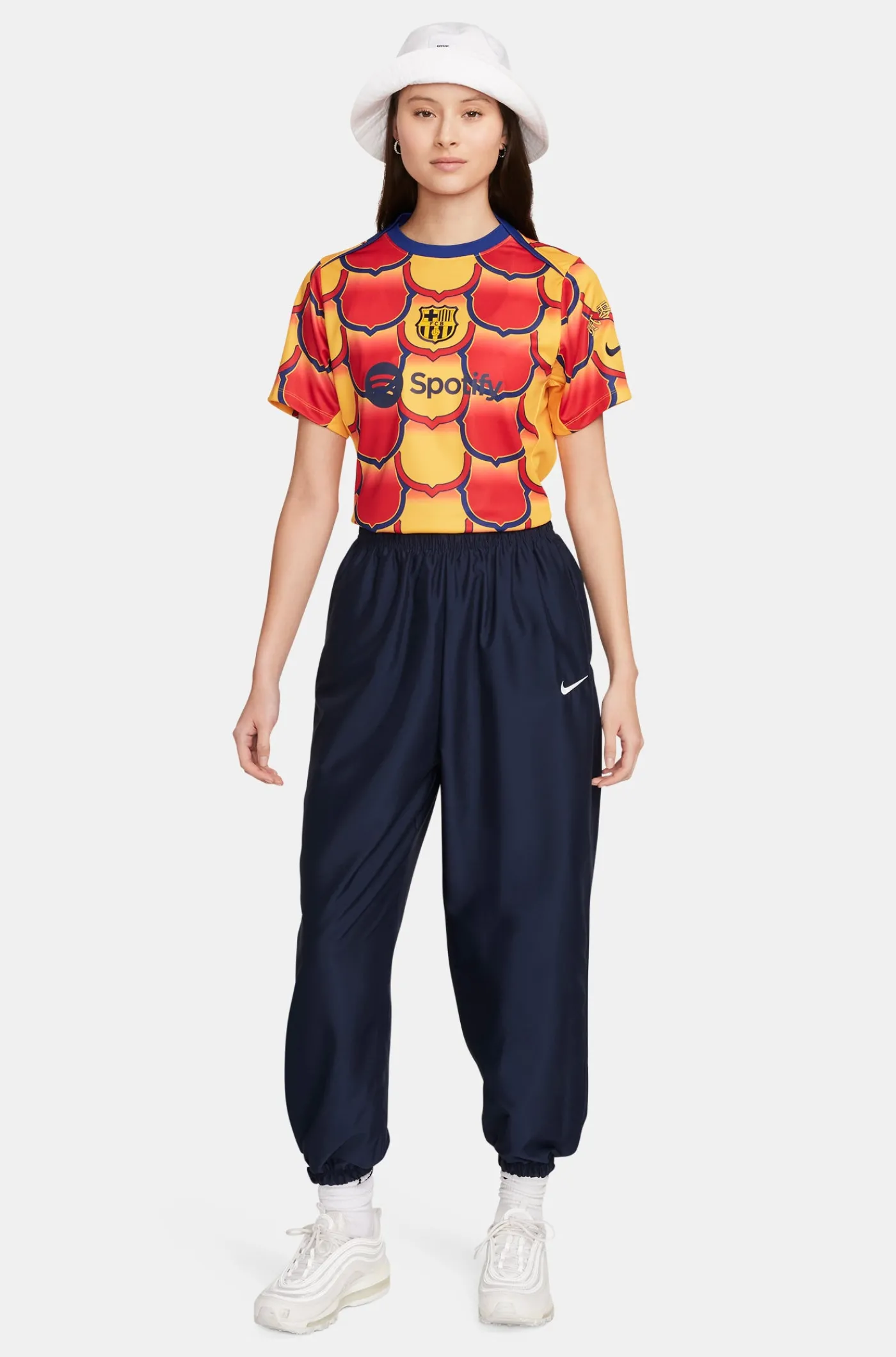 Camiseta pre-partido del FC Barcelona de la temporada 23/24 para mujer. Lo usan los jugadores del primer equipo para calentar antes de salir al campo durante los partidos. Camiseta con parche del escudo del FC Barcelona y logo de Nike bordado. Escote redondeado. Mangas cortas. Tecnología Nike Dri-FIT. Color: rojo y amarillo.