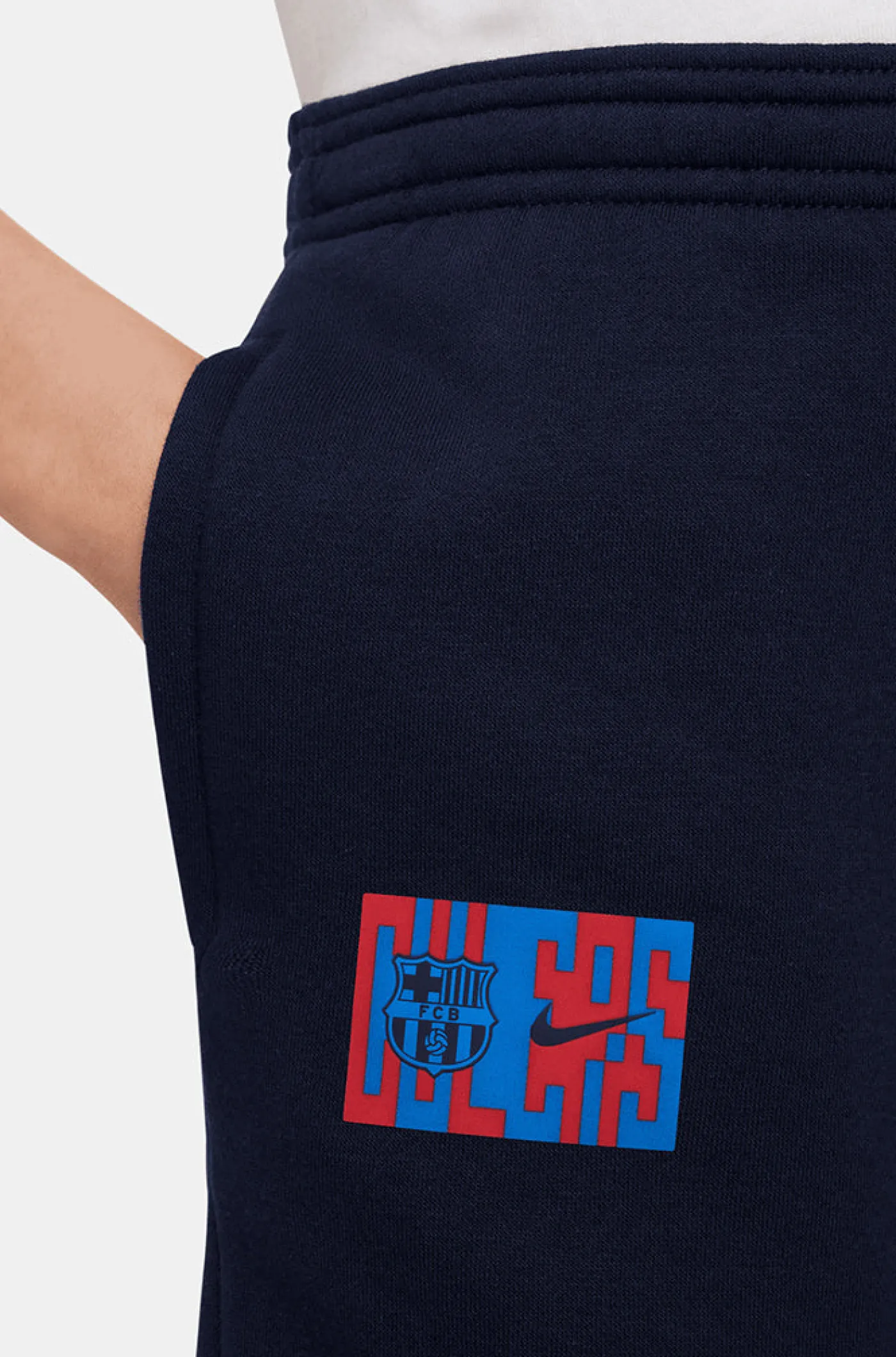 Pantalón deportivo para niños/as de 6 a 14 años con el parche del escudo de FC Barcelona y el logo de Nike bordado a contraste. Cintura elástica con cordones. Bolsillos delanteros: 2. Bajo con acabado en canalé. Color: azul marino.
