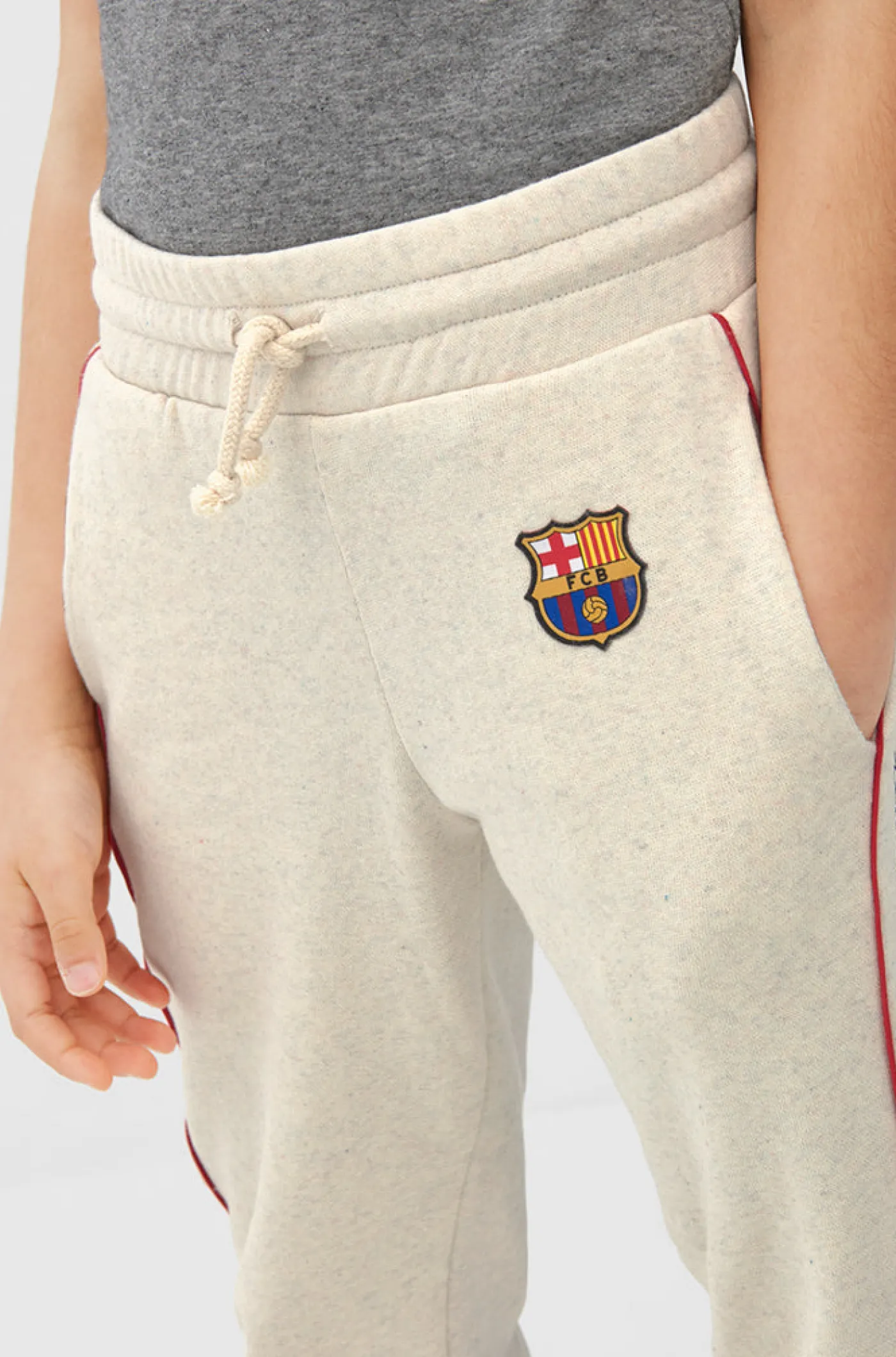 Pantalón deportivo de niña con escudo en relieve del Barça y detalle de logo «FC Barcelona» en los lados. Cierre con cintura elástica y cordones. Bolsillos delanteros: 2. Bajos elásticos. Prenda sostenible está hecha a partir de tejidos orgánicos y/o reciclados. Color: Gris. Venta exclusiva de Barça Stores.