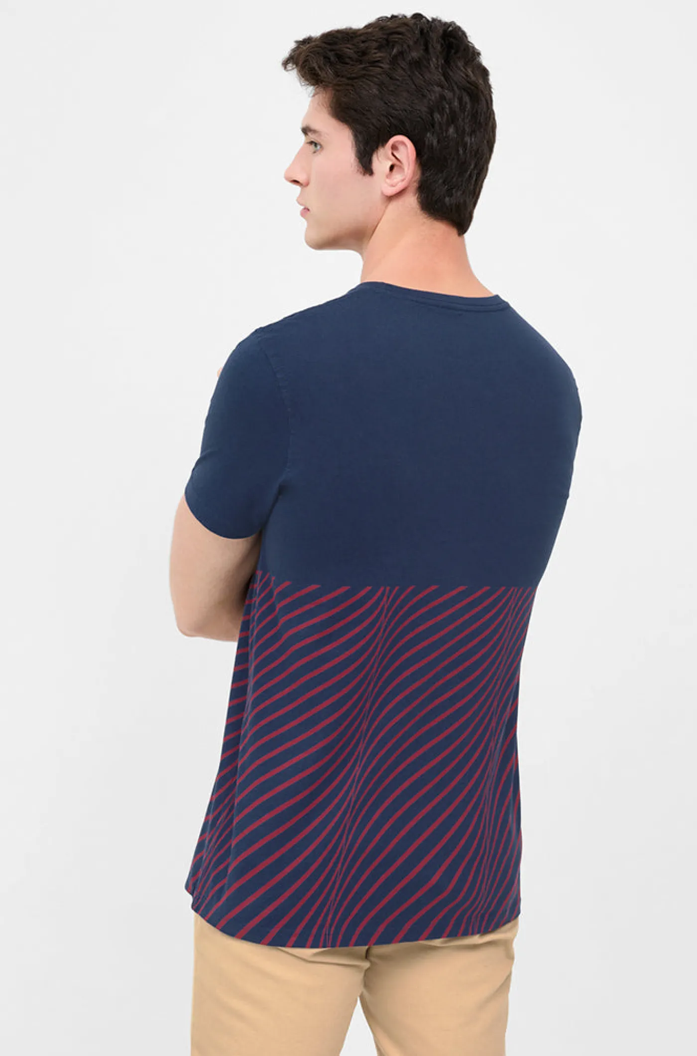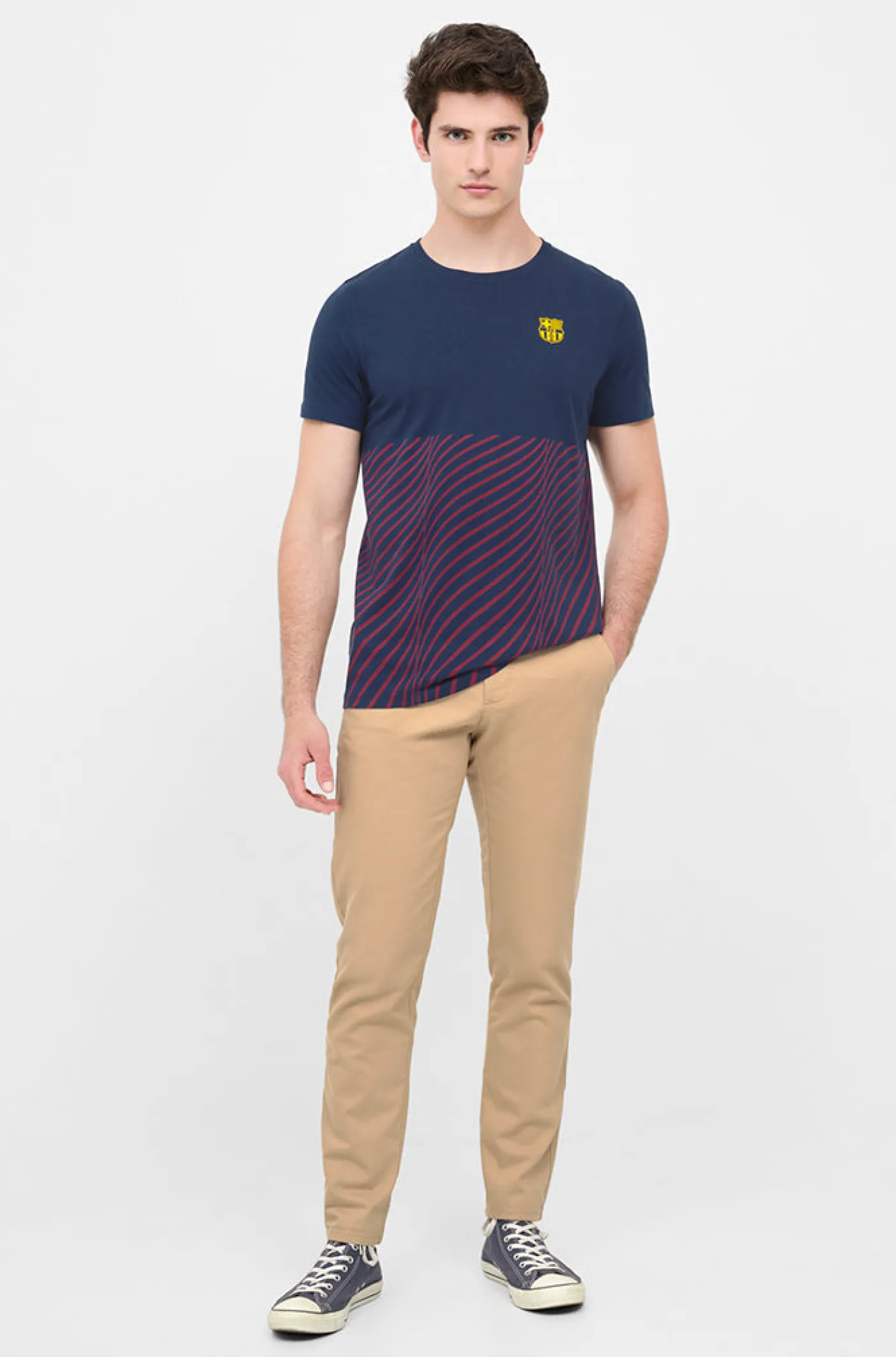 Camiseta de algodón con trama azulgrana y escudo en relieve del FC Barcelona. Cuello redondo y manga corta. Color: Marino