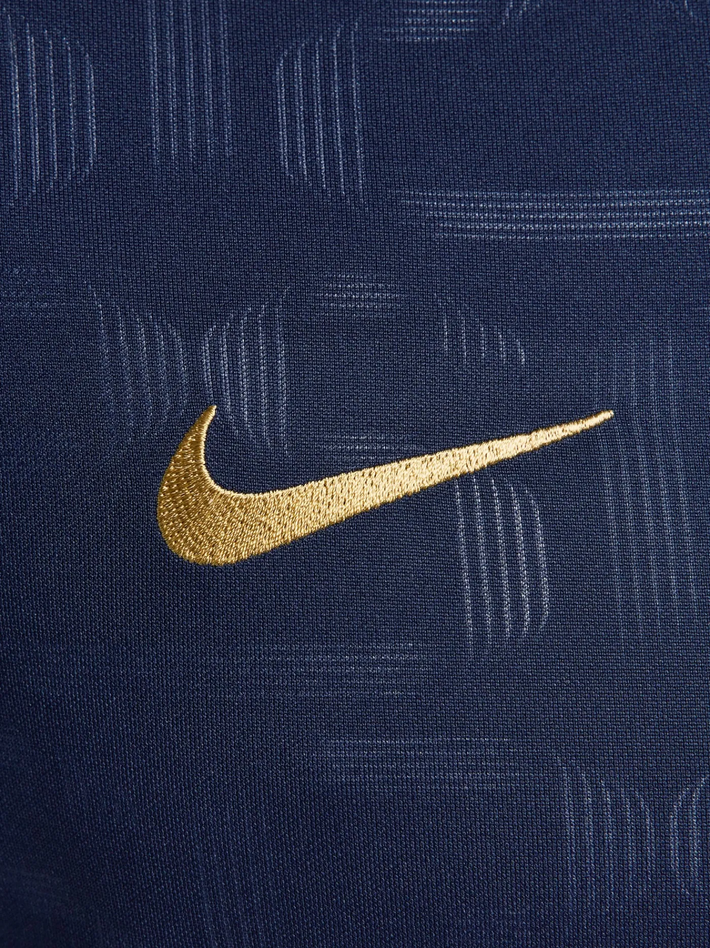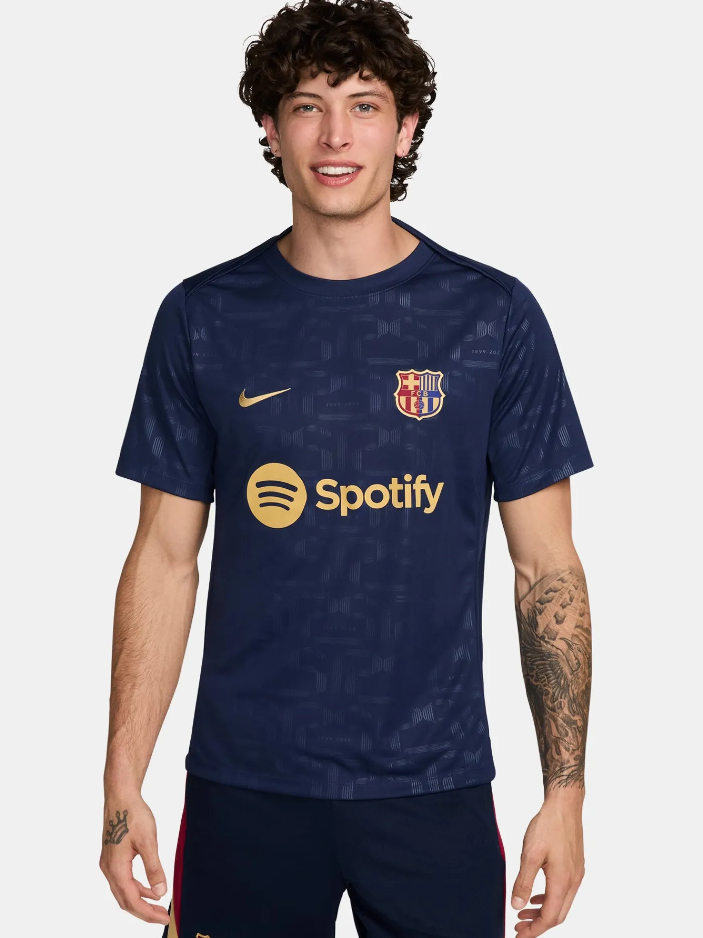 Camiseta prepartido del FC Barcelona de la temporada 24/25 que usan los jugadores del primer equipo para calentar antes de salir al terreno de juego durante los partidos. Camiseta con parche del escudo del FC Barcelona y logo de Nike bordado. Escote redondeado. Mangas cortas. Tecnología Nike Dri-FIT. Color: azul marino y dorado.