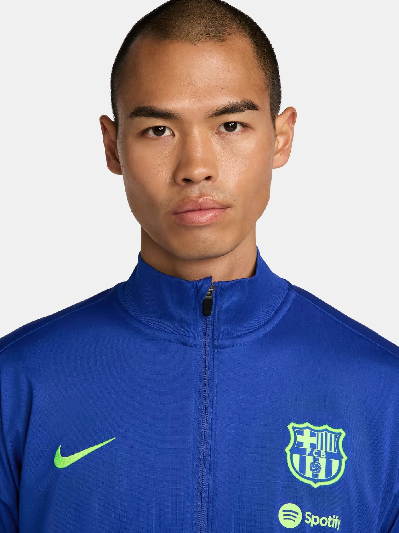 Chándal de entrenamiento con escudo del FC Barcelona bordado y logo de Nike en contraste. Tecnología Nike Dri-FIT. Chaqueta con cuello alto. Cierre con cremallera. Bolsillos delanteros con cremalleras. Pantalón largo con cinturilla elástica y cordón interno. Piernas con cremalleras.