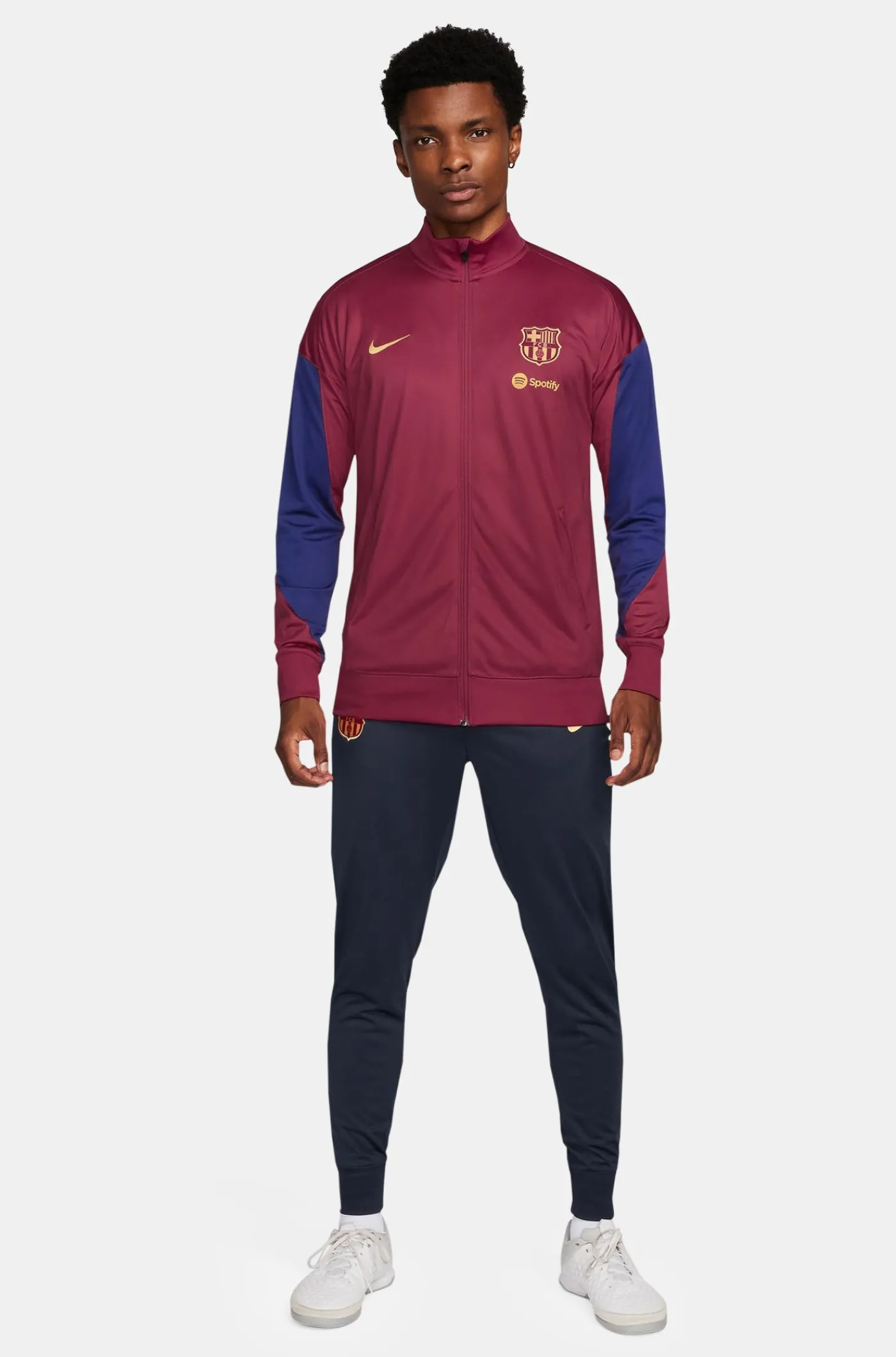 Chándal de entrenamiento con parche del escudo del FC Barcelona y logo de Nike bordado en contraste. Tecnología Nike Dri-FIT. Chaqueta con cuello alto. Cierre con cremallera. Bolsillos delanteros con cremalleras. Pantalón largo con cinturilla elástica con cordones en el interior. Bajos con cremallera. Color: granate y obsidiana.