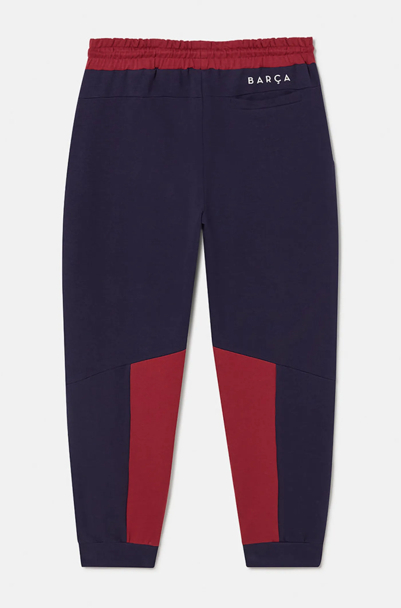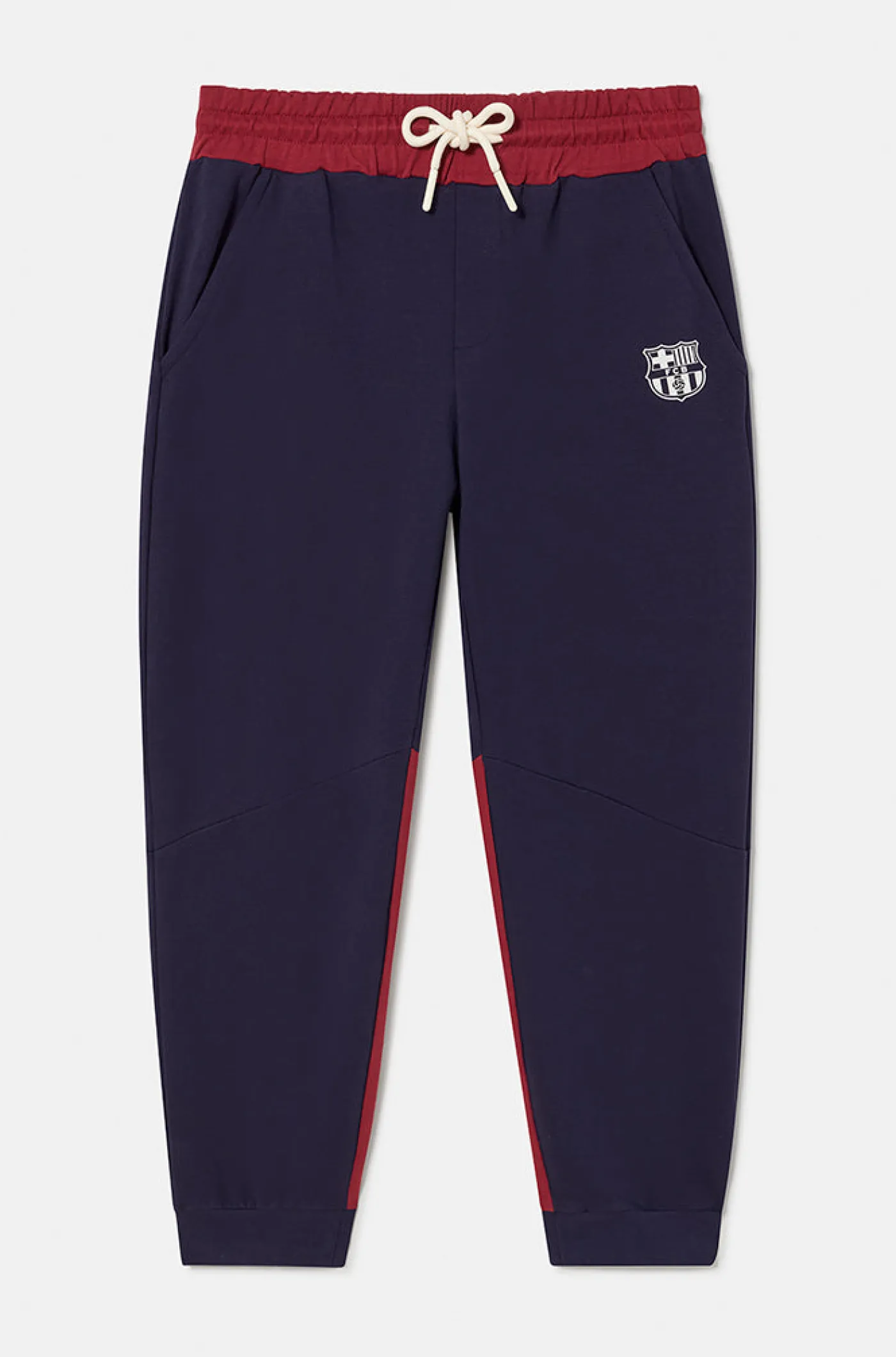 Pantalón deportivo para niño, con parche del escudo del FC Barcelona. Detalle en relieve rótulo “Barça”. Cintura elástica con cordones en el interior. Bolsillos delanteros: 2 y 1 en la parte trasera. Color: azul marino y rojo