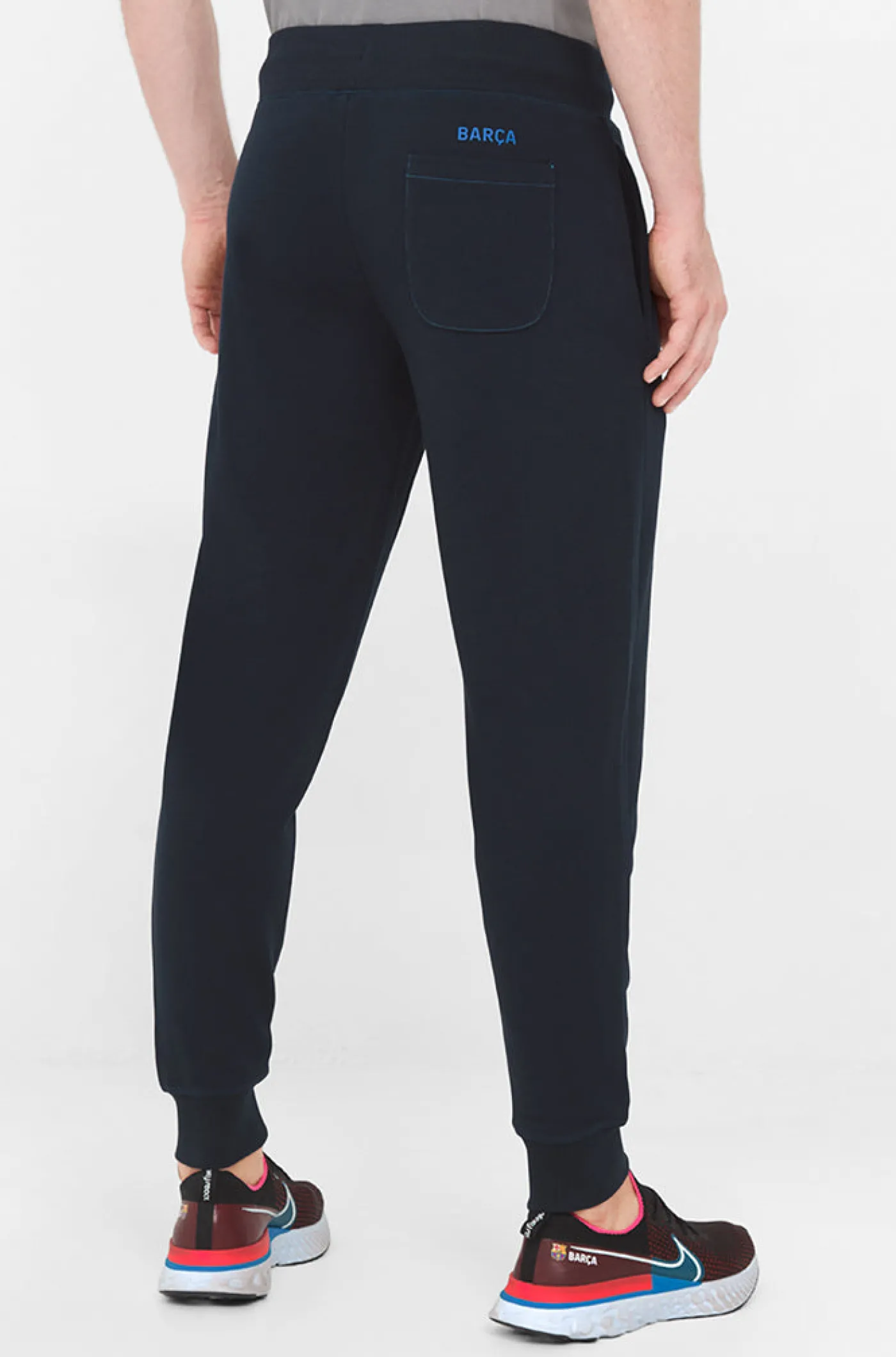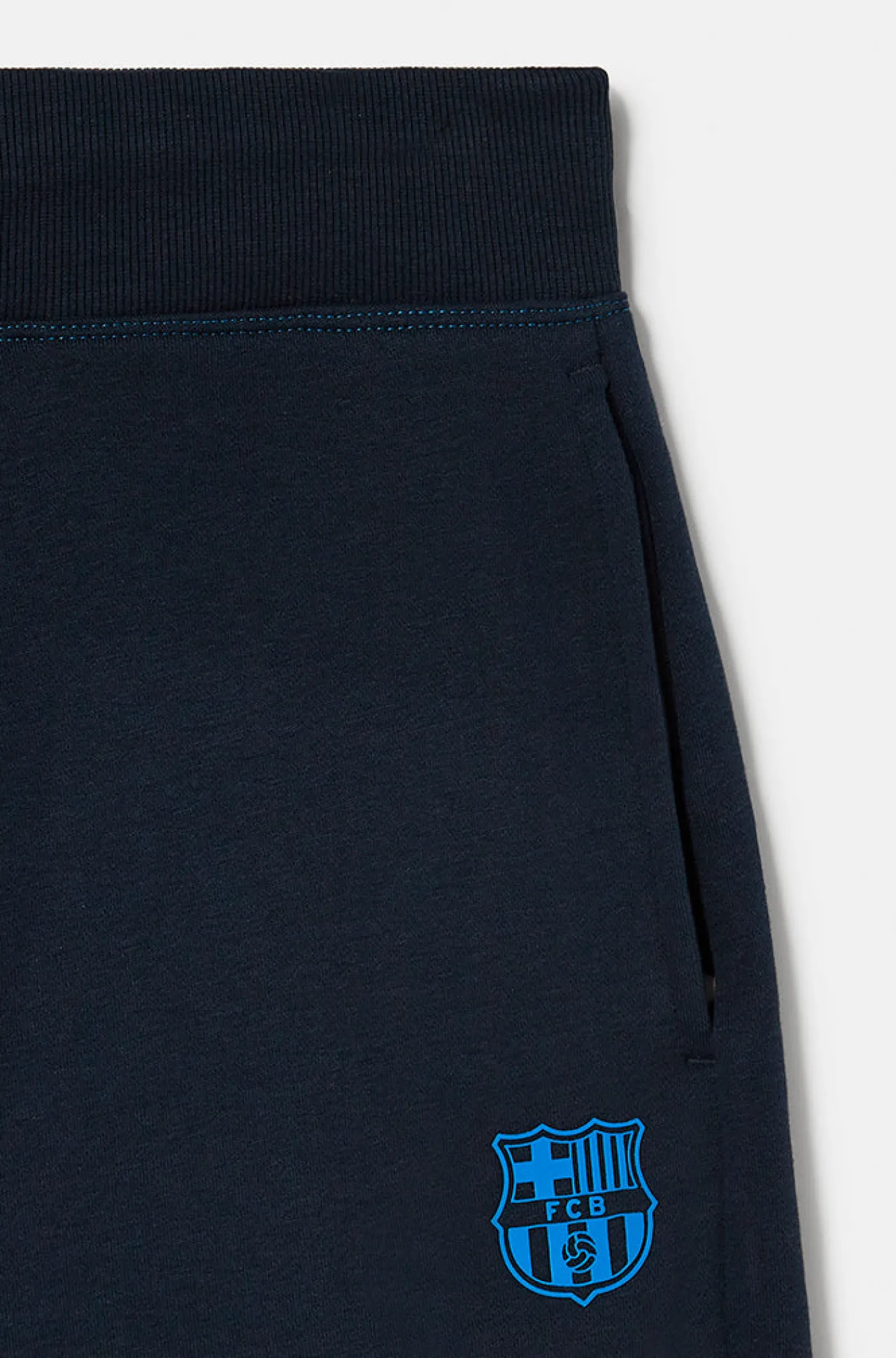 Pantalón con escudo del FC Barcelona en relive y a contraste en la parte delantera y lettering «BARÇA» en la parte trasera. Cintura elástica con cordones en la parte interior. Bolsillos delanteros: 2 con cremallera. Bajos elásticos. Color: azul marino.