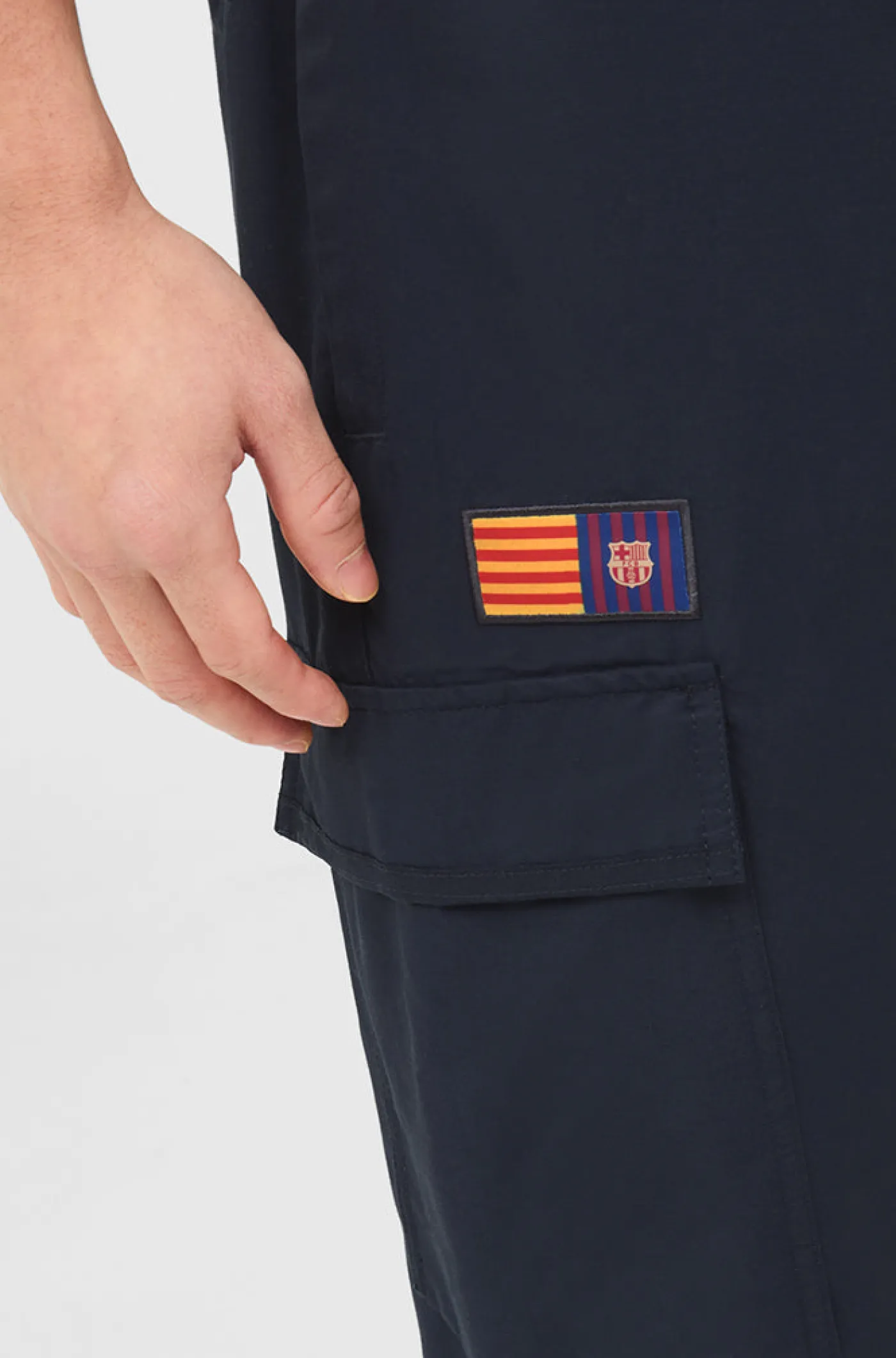Pantalón con el escudo del FC Barcelona con la señera a contraste y logo de Nike bordados. Cintura elástica. Bolsillos laterales: 2. Bajos elásticos. Color: azul marino.
