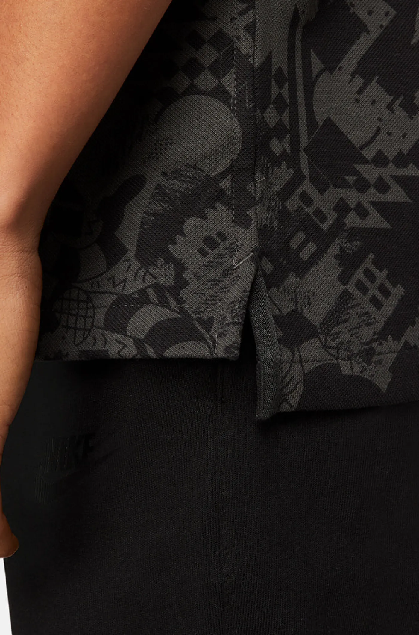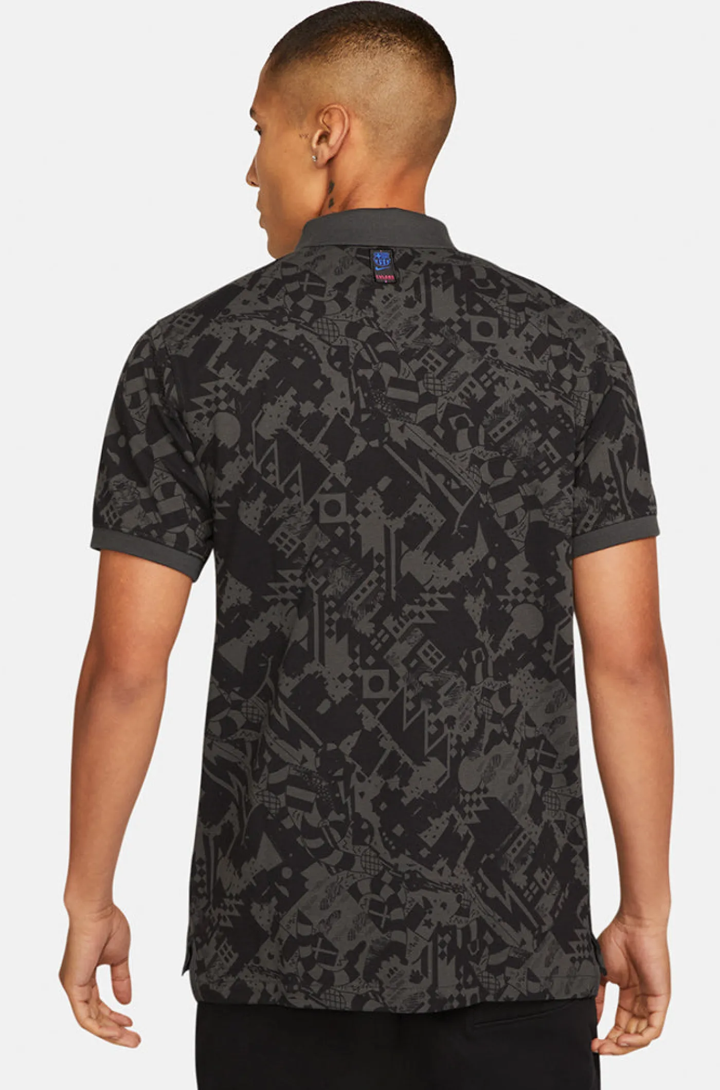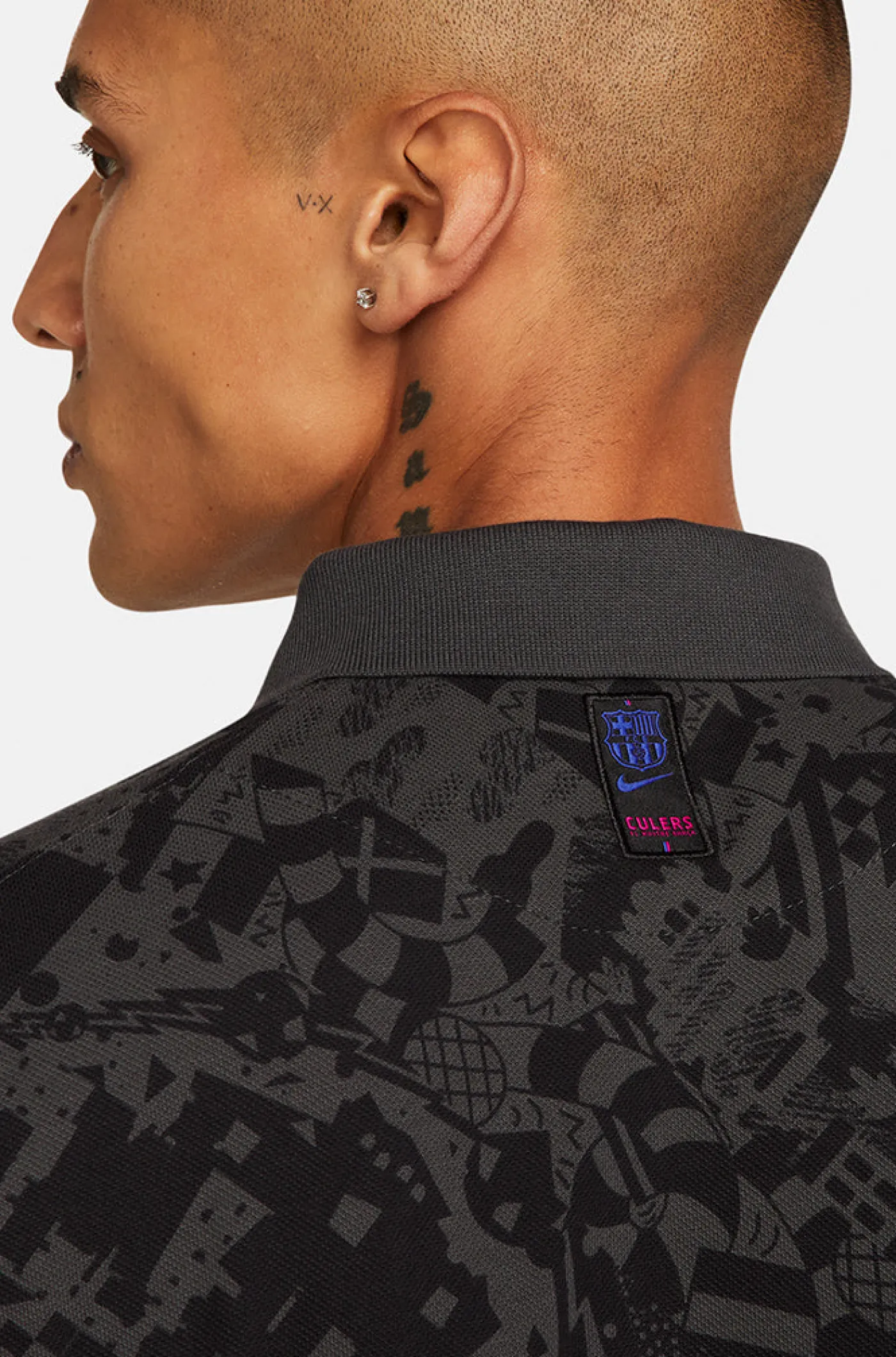 Polo de manga corta con escudo en relieve del FC Barcelona y el logo bordado de Nike. Corte asimétrico. Cuello con solapas. Cierre con 2 botones en el pecho. Aberturas en los laterales. Su tejido de algodón la convierte en una prenda cómoda y ligera. Color: negro y gris.