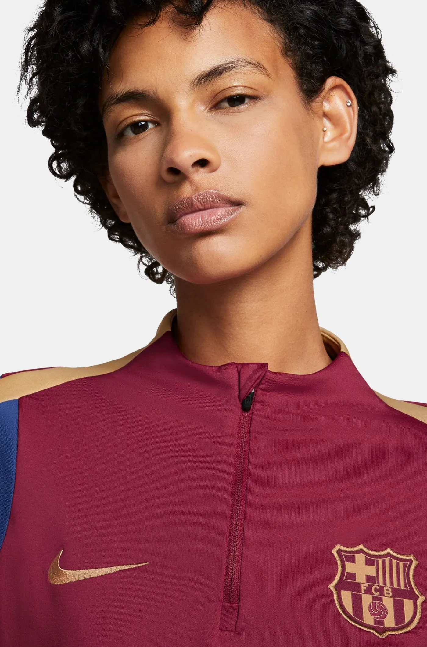 Sudadera del FC Barcelona de la temporada 23/24 para mujer, que usan los jugadores del primer equipo para calentar antes de salir a correr al terreno de juego durante los partidos. Camiseta con parche del escudo del FC Barcelona y logo de Nike bordado. Escote redondeado. Mangas largas. Tecnología Nike Dri-FIT. Color: granate.