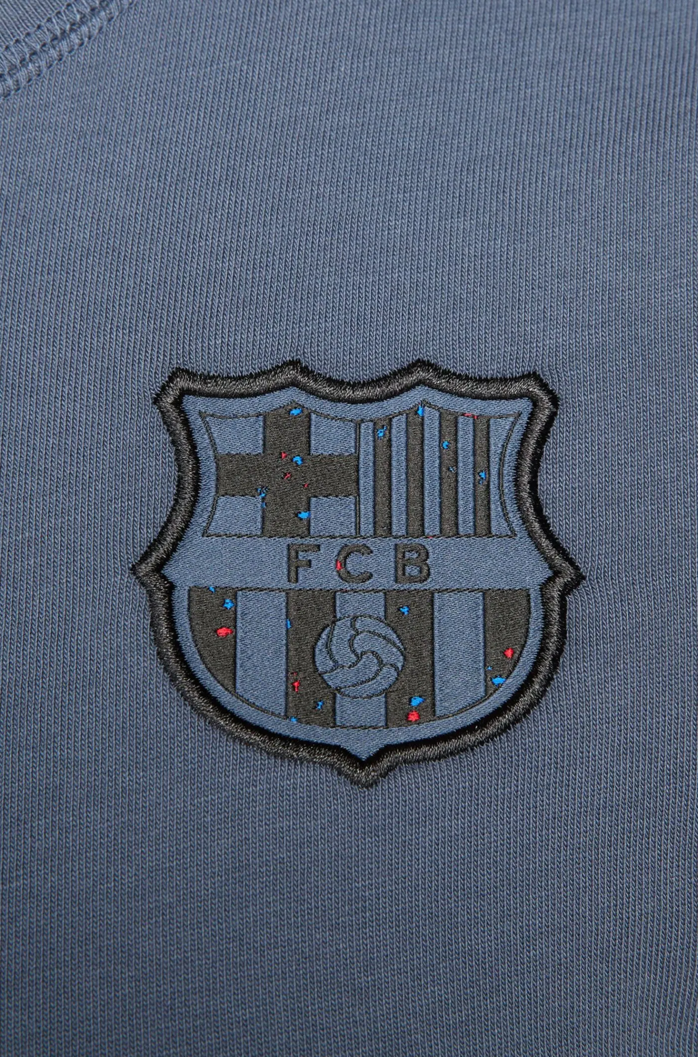 Camiseta de manga corta con el escudo del FC Barcelona bordado en el pecho. Cuello redondo. Color: azul.