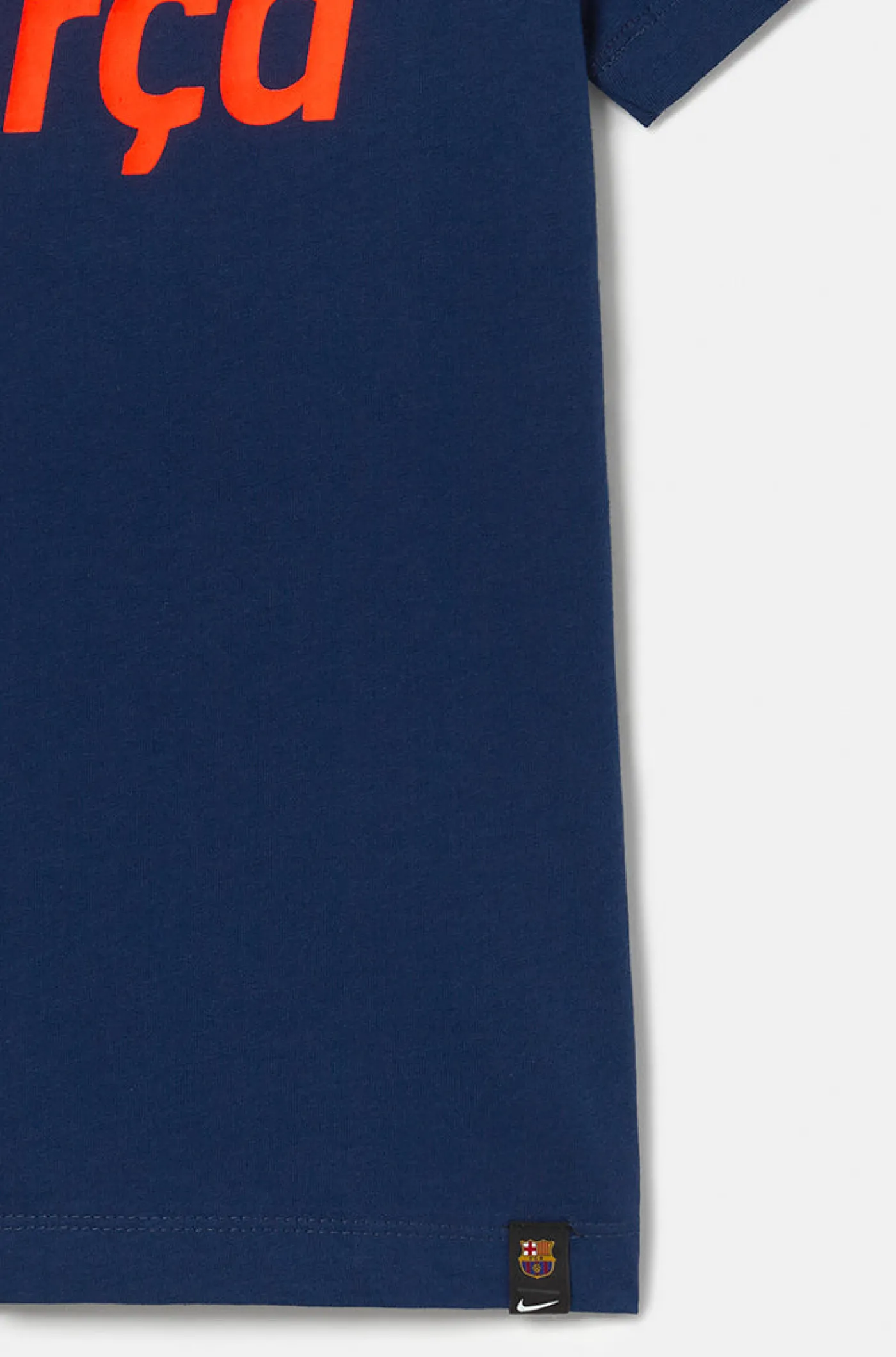 Camiseta para niños/as con la rotulación de “Barça” y logo de Nike estampados en el pecho a contraste. Su tejido de algodón la hace una prenda cómoda y ligera. Cuello redondo. Manga corta. Color: azul marino y naranja.