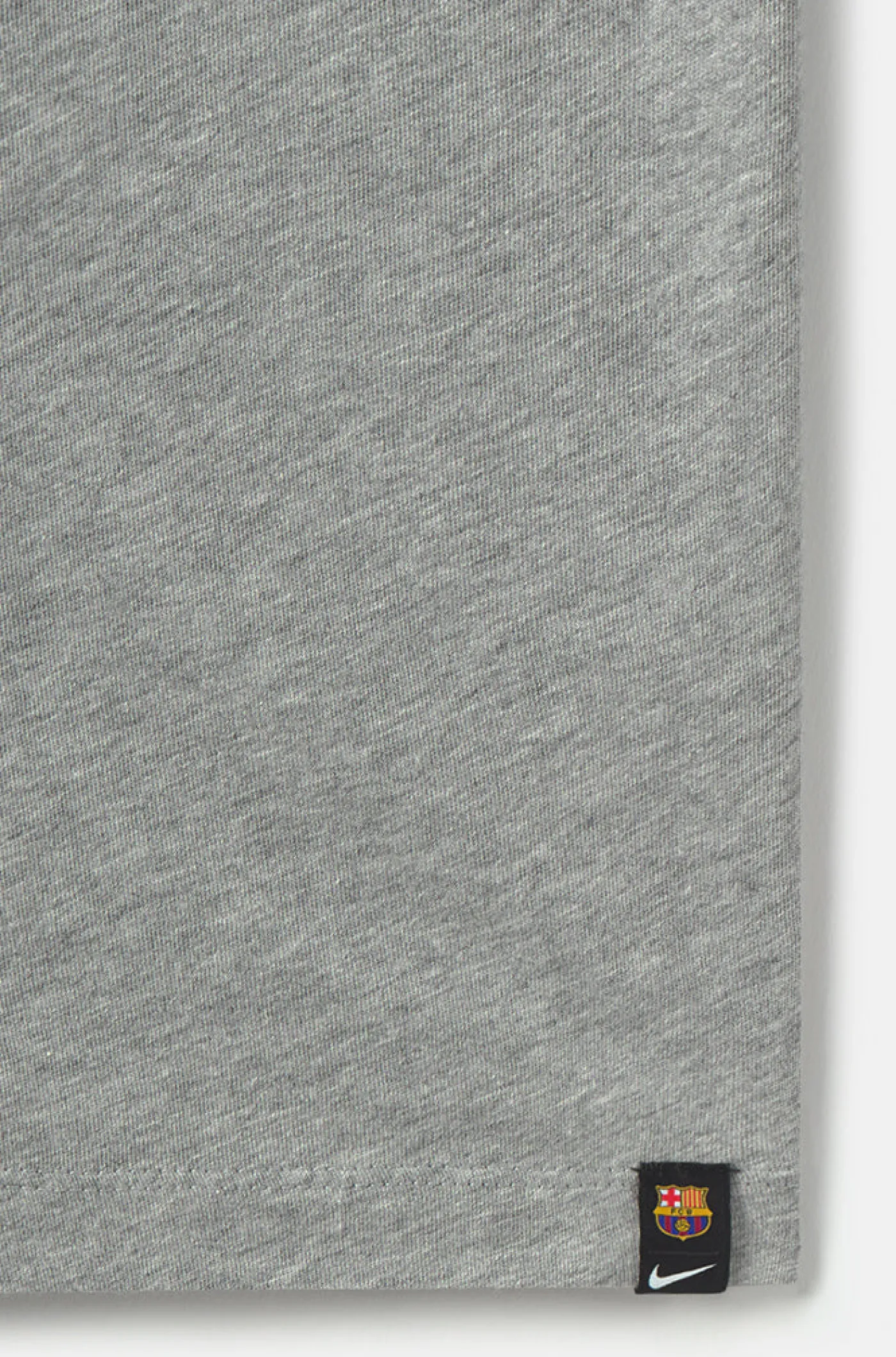 Camiseta para niño de manga corta con rotulación de “Barça” y logo de Nike a contraste. Detalle de escudo del FC Barcelona en la parte inferior de la cintura. Cuello redondo. Su tejido de algodón la hace una prenda cómoda y ligera. Color: Gris jaspeado
